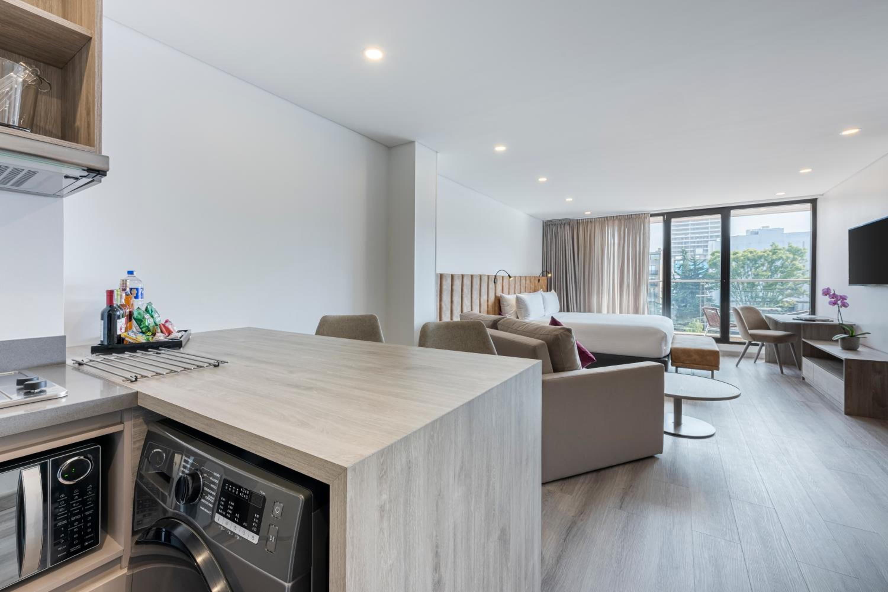 Indulge in our self-catering rooms overlooking Virrey Park, boasting king-size beds and modern kitchenettes. Unwind with a 42-inch LCD TV and some rooms offering private balconies with stunning park views.