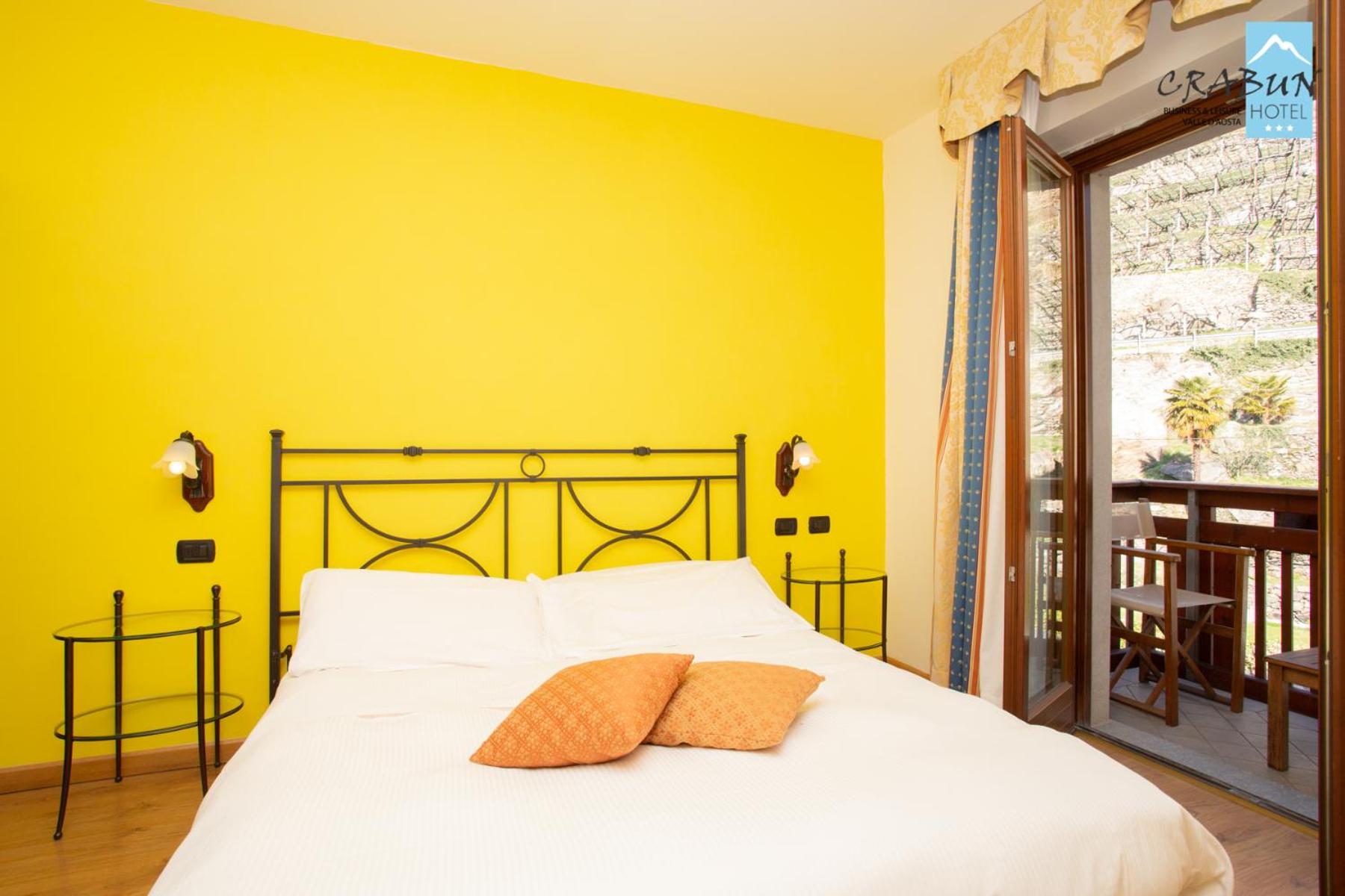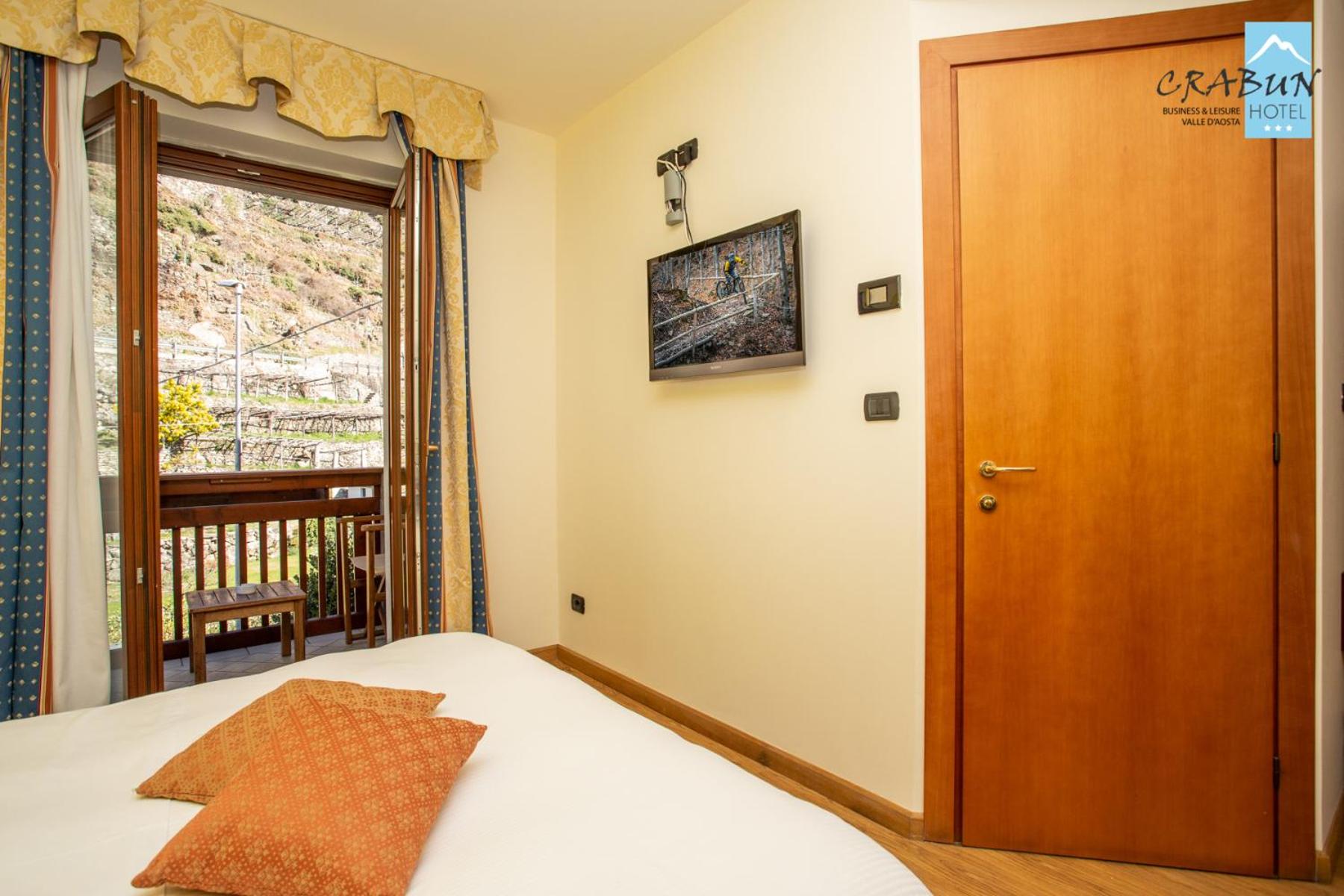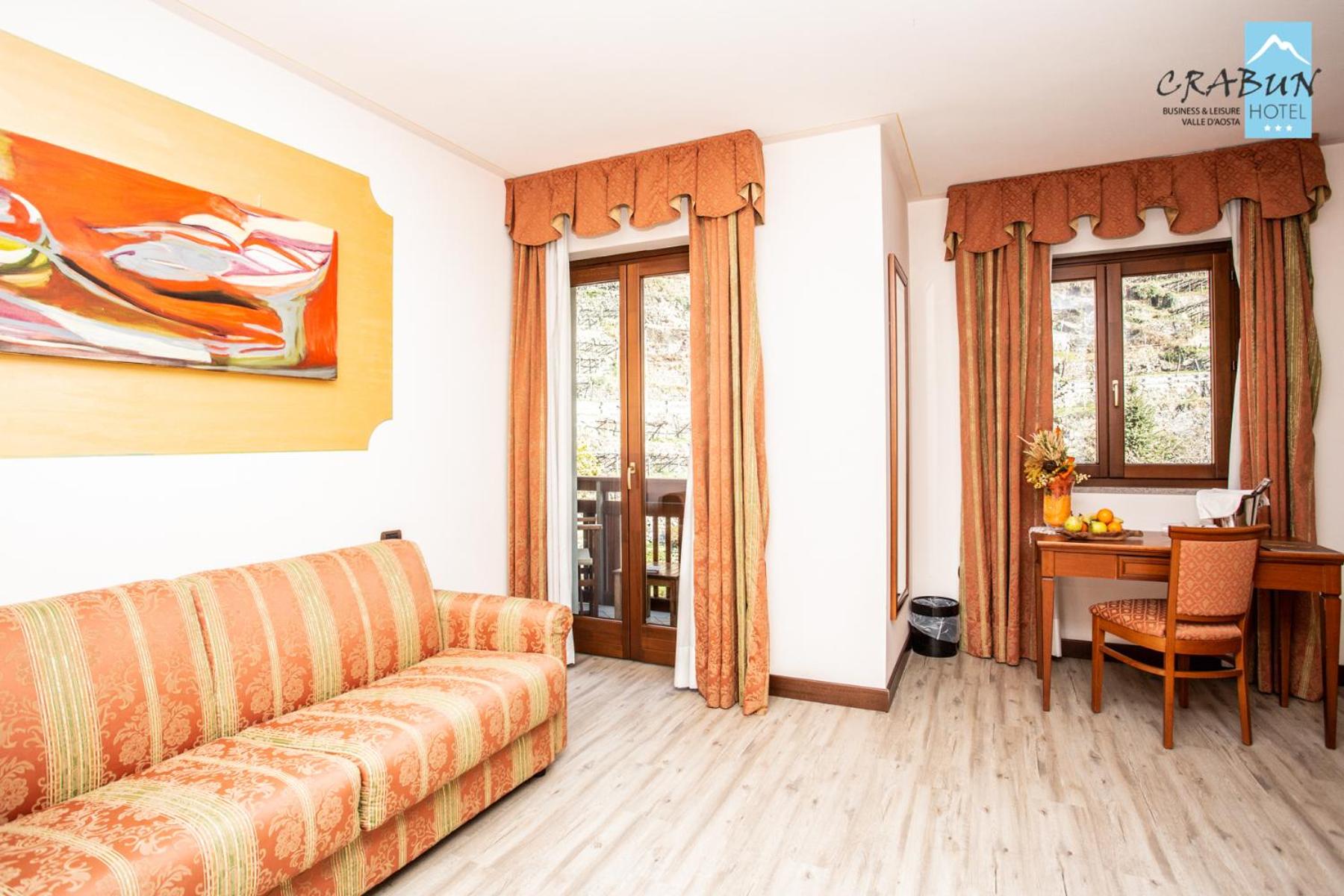 The rooms at Hotel Crabun are elegantly decorated with warm colors and wood furniture, offering a cozy retreat. Guests can enjoy modern amenities such as free Wi-Fi, flat-screen TVs, and balconies in every room.