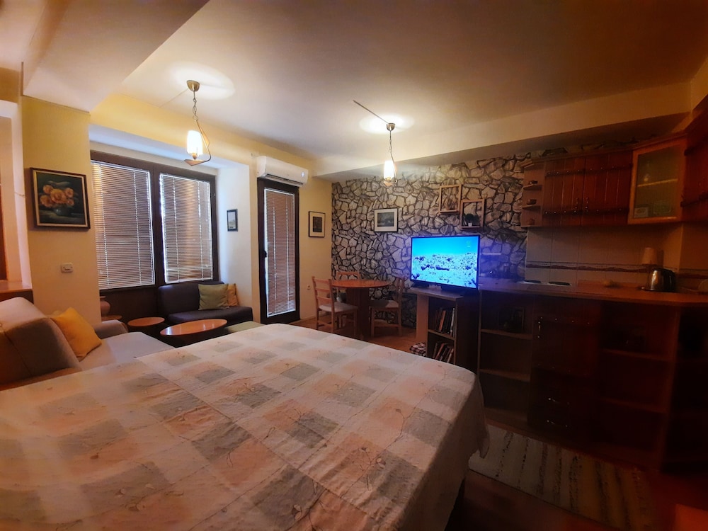 Stayed in studio apartment with our two kids and we loved it. Very small room, but clean and good a/c. Kitchen was great - supermarket and bakery next door so we made dinner and breakfast. Owner Sacha was super friendly and helpful, always around if anything needed. We parked right outside no problem. Location perfect - walking distance to anything in the old town, 2 mins from the main pedestrian street.