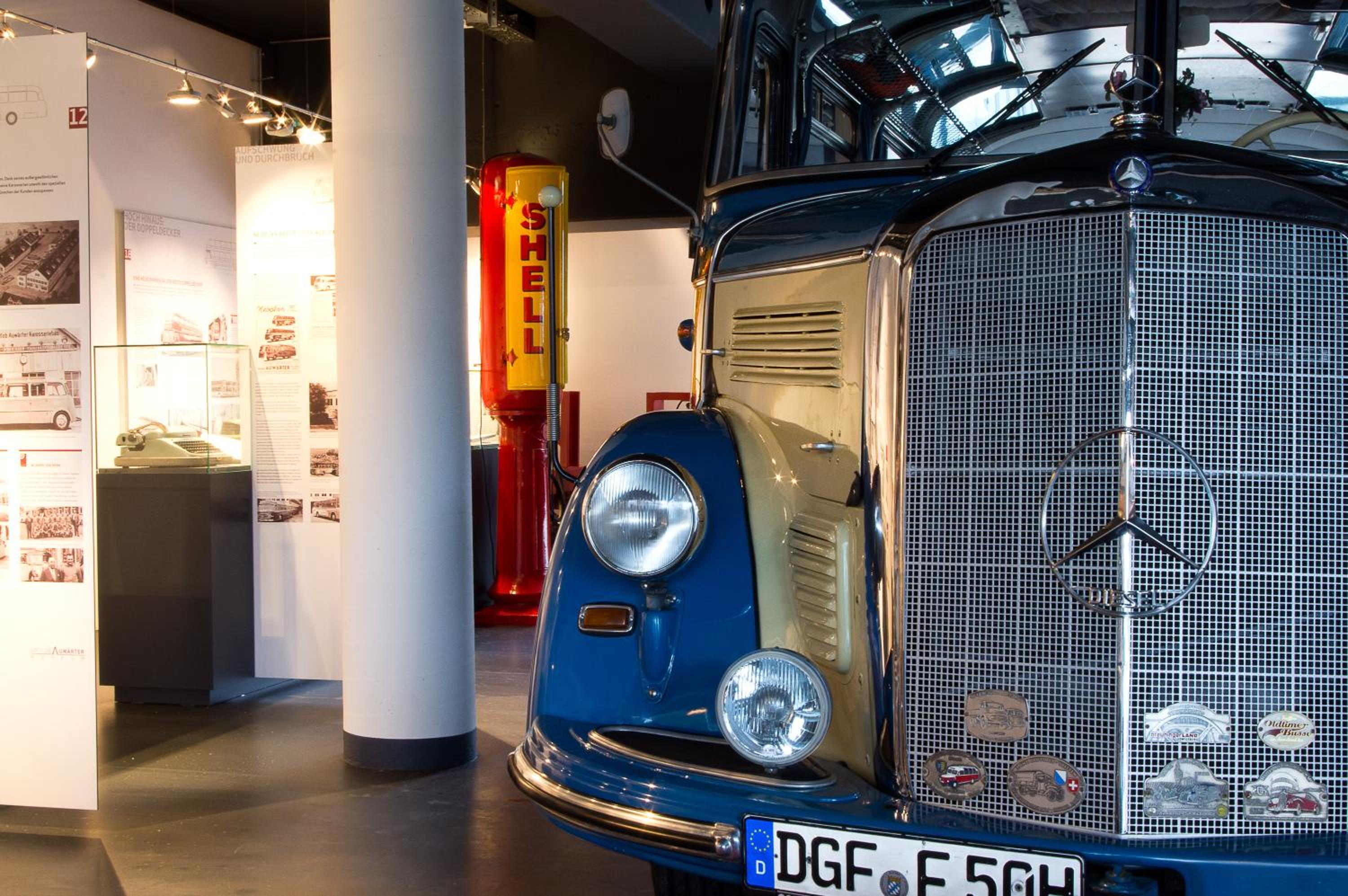 Wir waren begeistert vom angegliederten Museum, den vielen schönen Oldtimer-Bildern an den Wänden im Flur und von den Modellbussen.