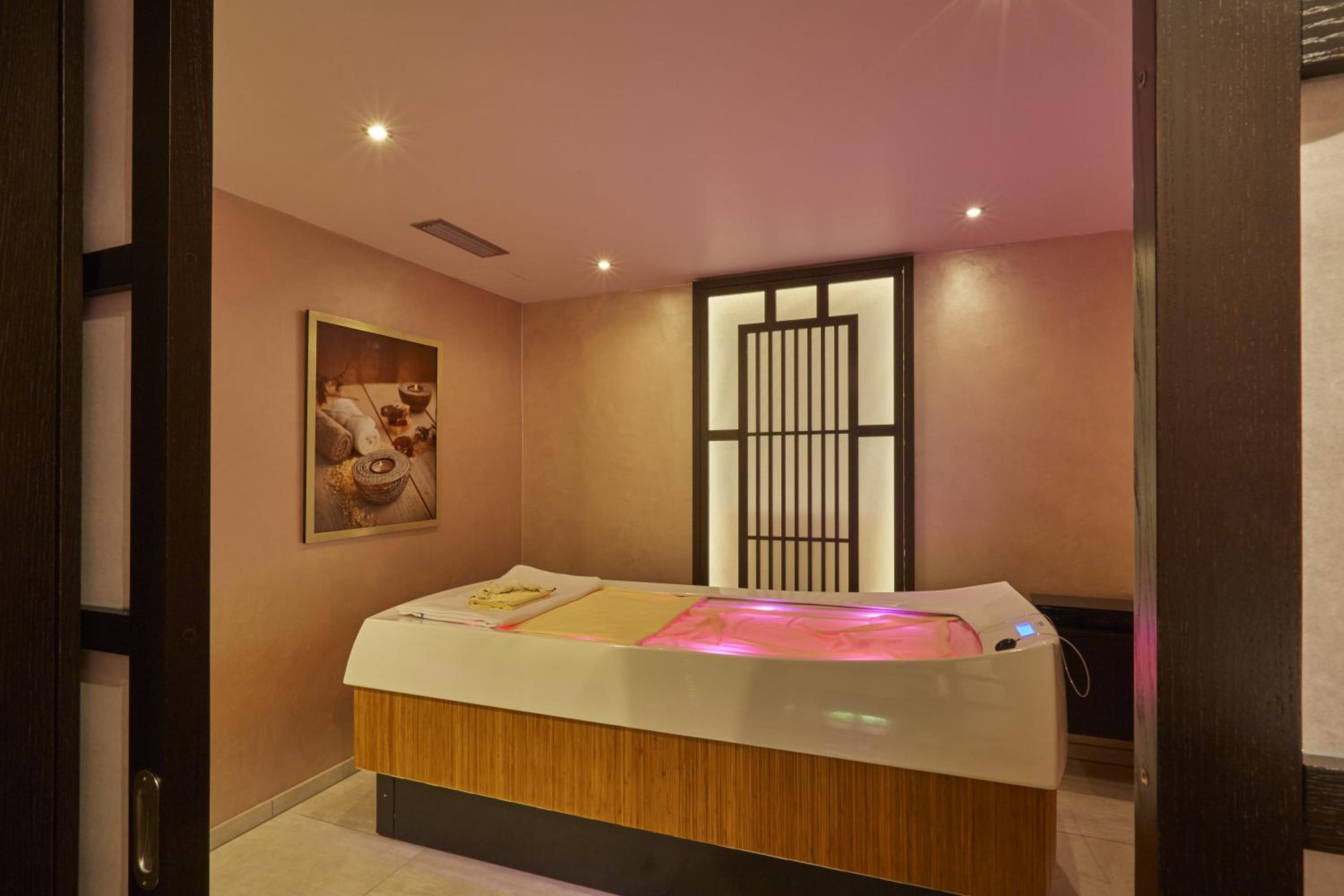 Indulge in the extensive 1,600 m² pool and spa area, featuring a large pool, sauna facilities, and a massage studio, perfect for unwinding and rejuvenating during your stay.