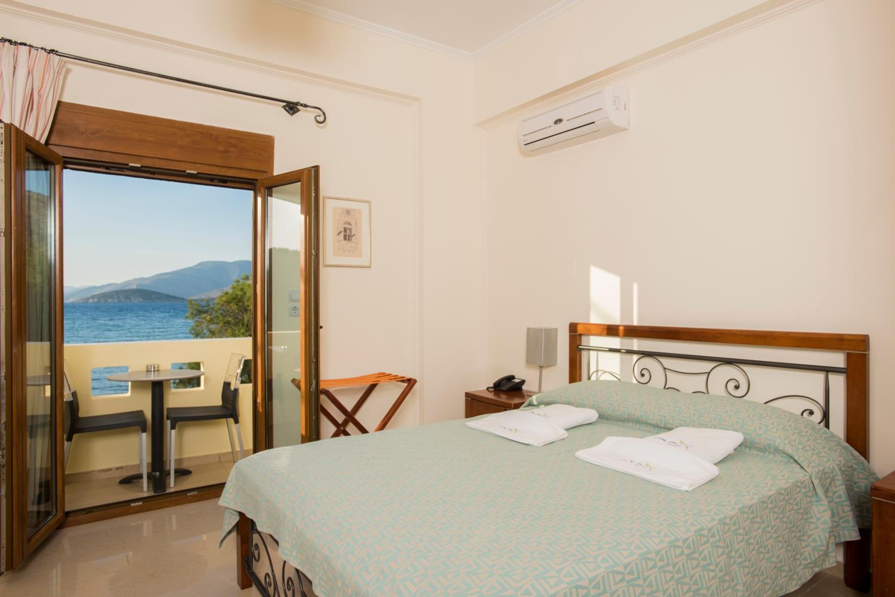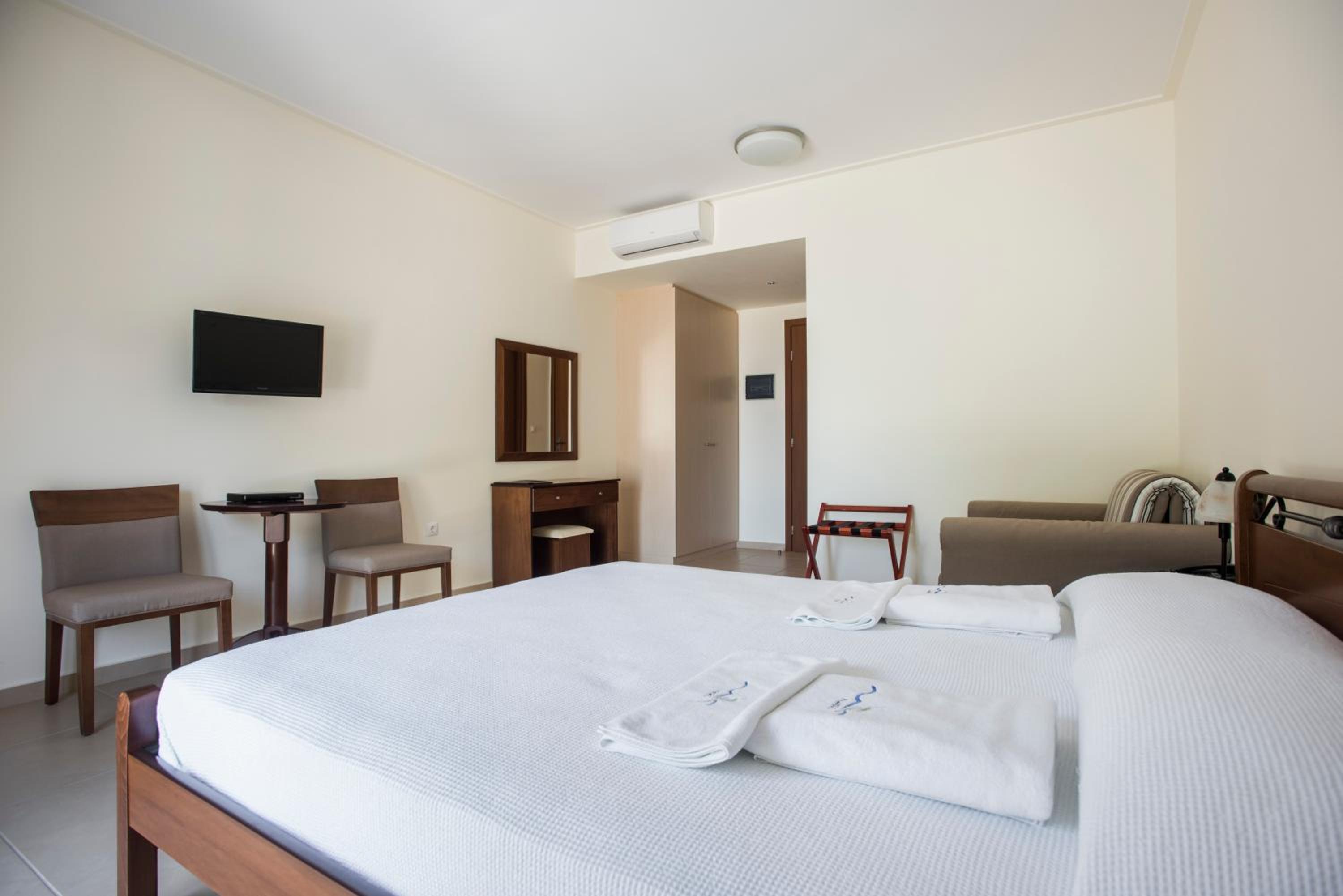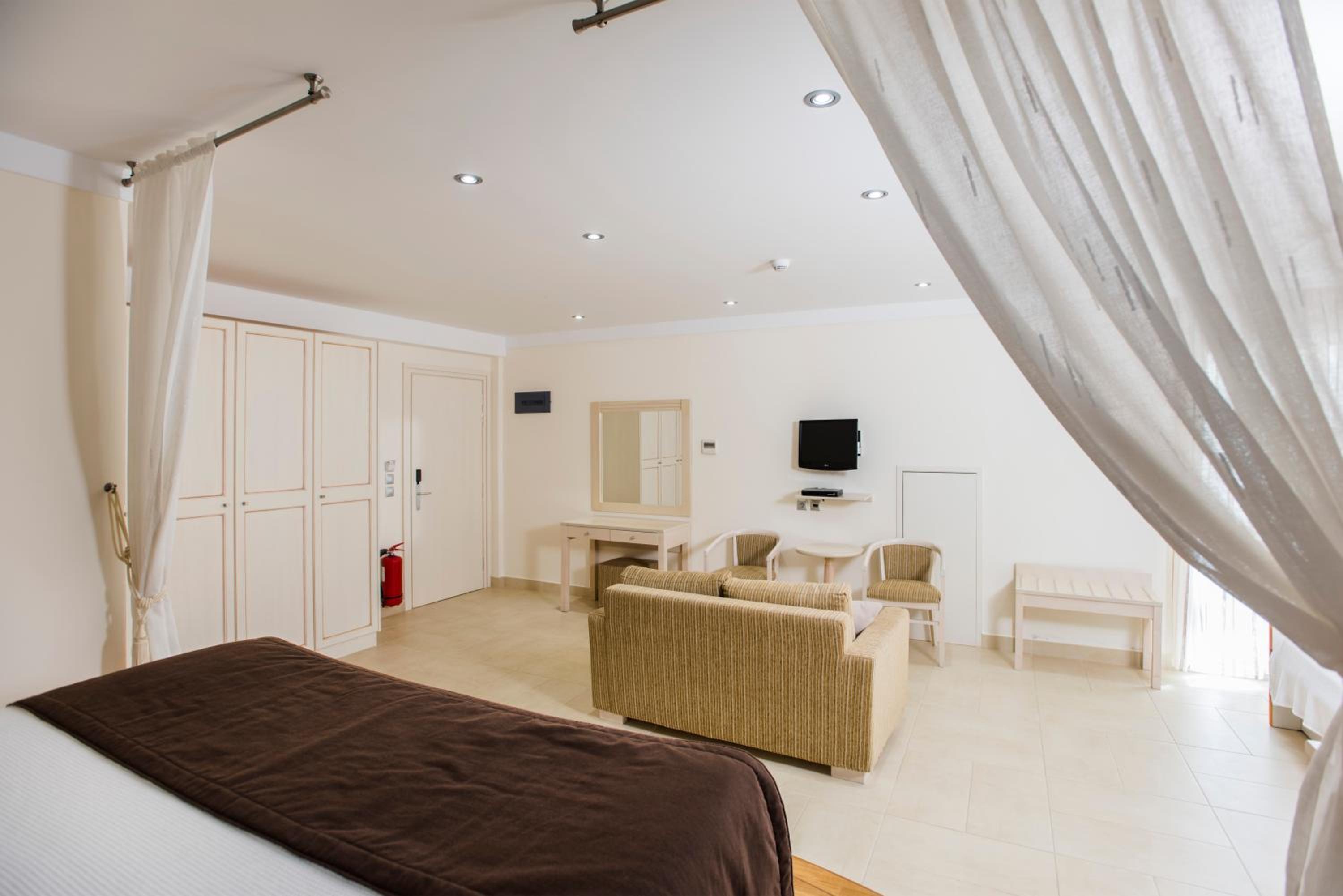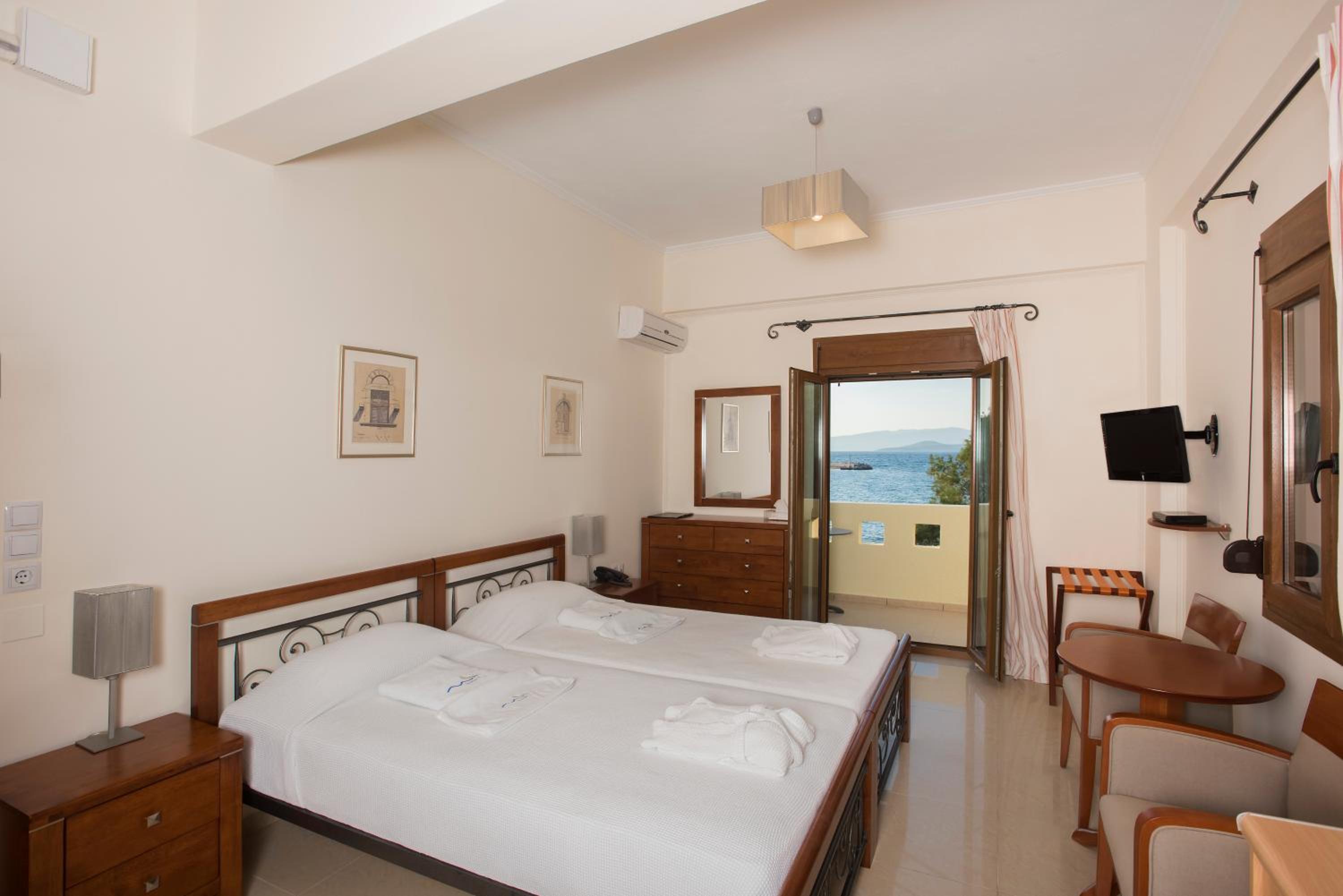 We stayed in a suite room with two bed rooms and two bathrooms. We had a large balcony and a saloon. Its’s large enough to accomodate up to 7 adults. It was very nicely decorated… There is even a fireplace in the saloon. It’s worths the price. The hotel is a great choice for romantic couples and families. The hotel is right on the seafront and sandy beach. The staff is friendly and helpful. The snack bar at the beginning of the day was delicious. It felt like home on Chios. When we left, we were sure we would return.