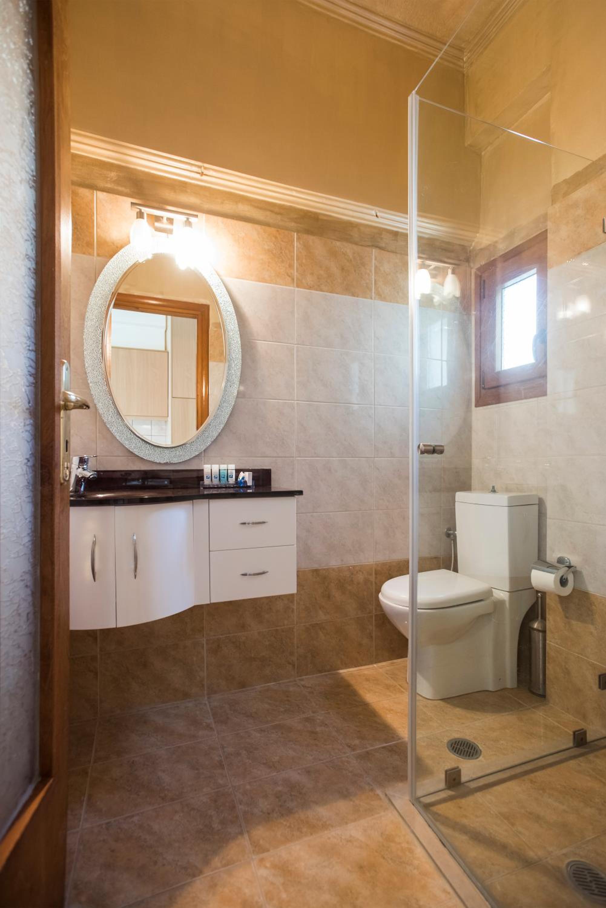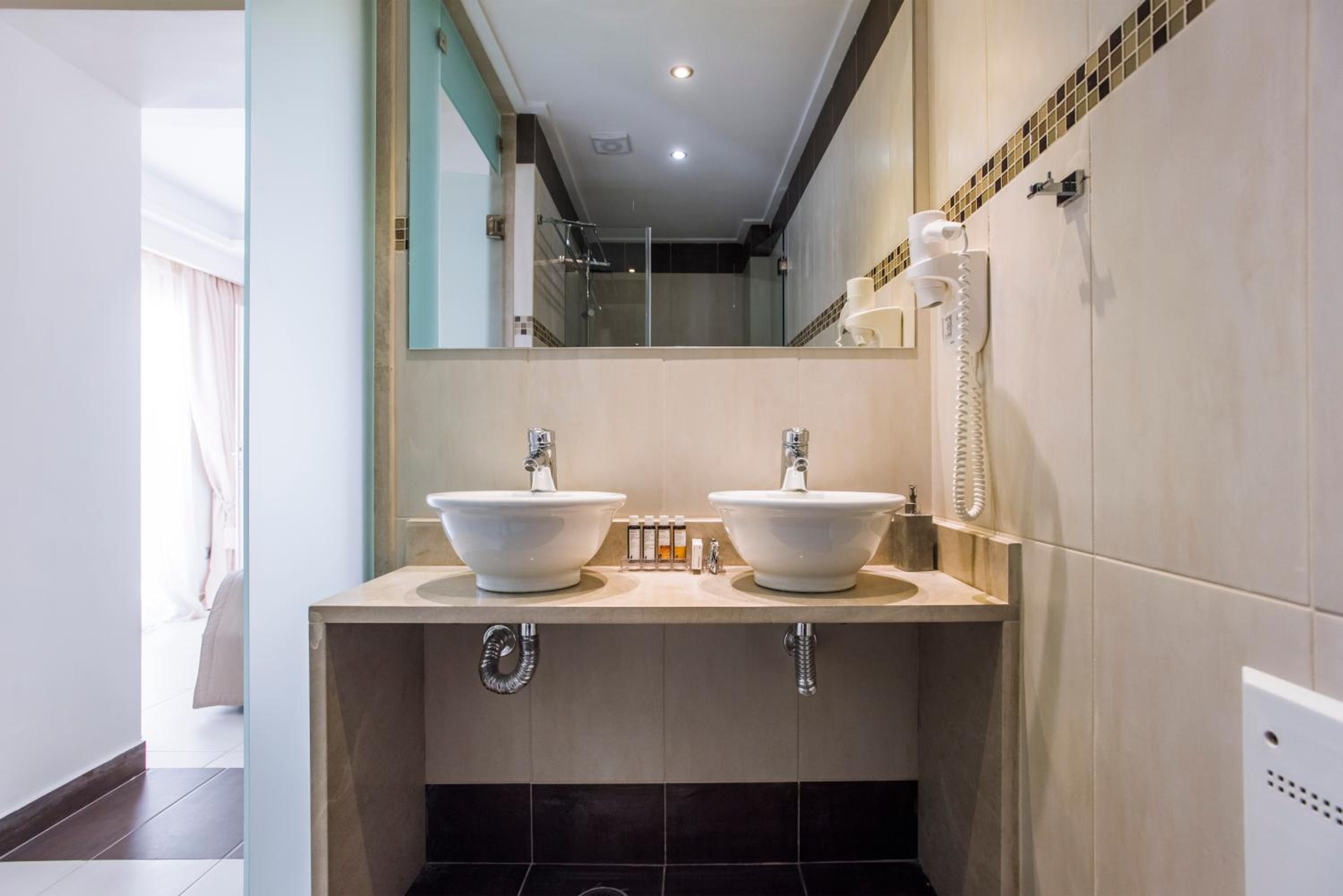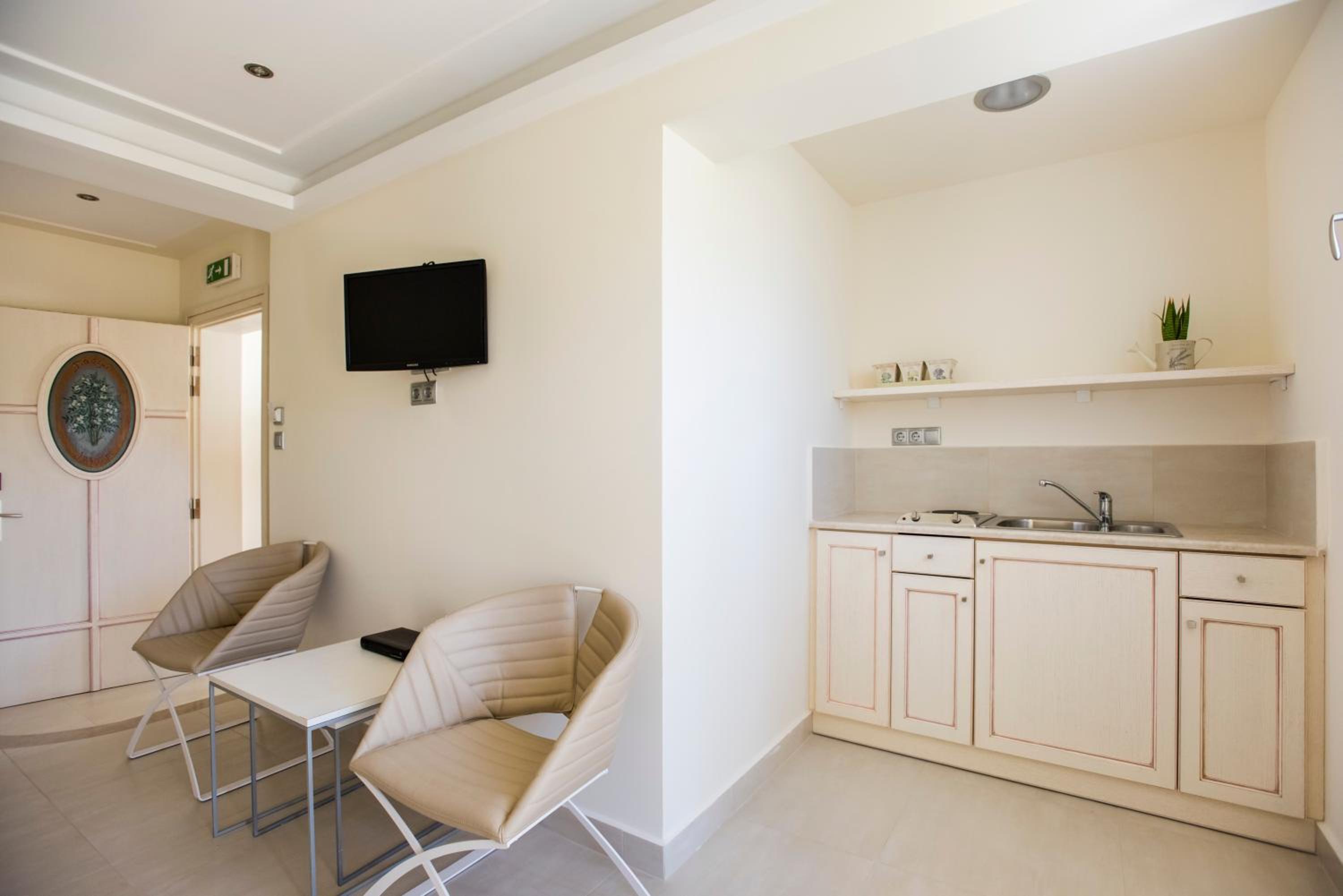 We stayed in a suite room with two bed rooms and two bathrooms. We had a large balcony and a saloon. Its’s large enough to accomodate up to 7 adults. It was very nicely decorated… There is even a fireplace in the saloon. It’s worths the price. The hotel is a great choice for romantic couples and families. The hotel is right on the seafront and sandy beach. The staff is friendly and helpful. The snack bar at the beginning of the day was delicious. It felt like home on Chios. When we left, we were sure we would return.