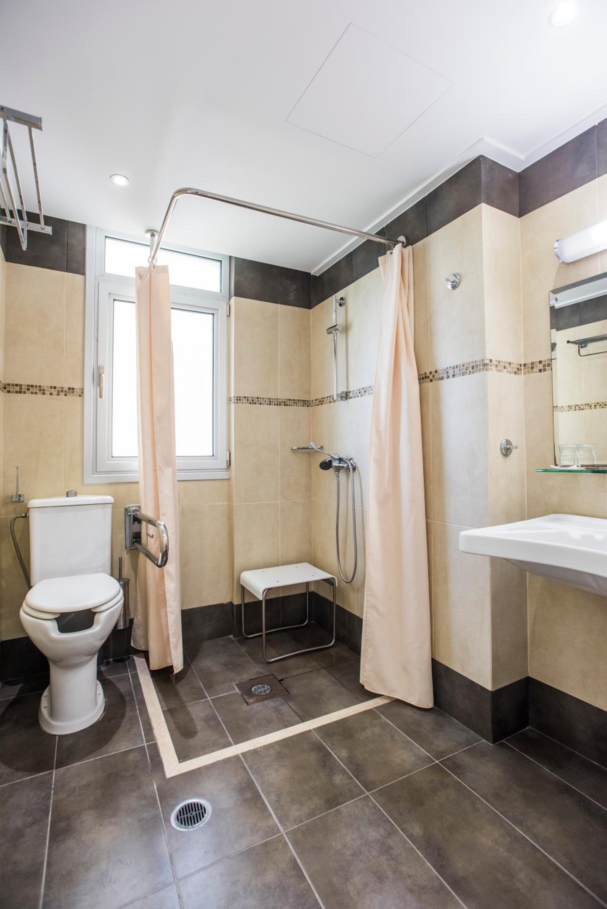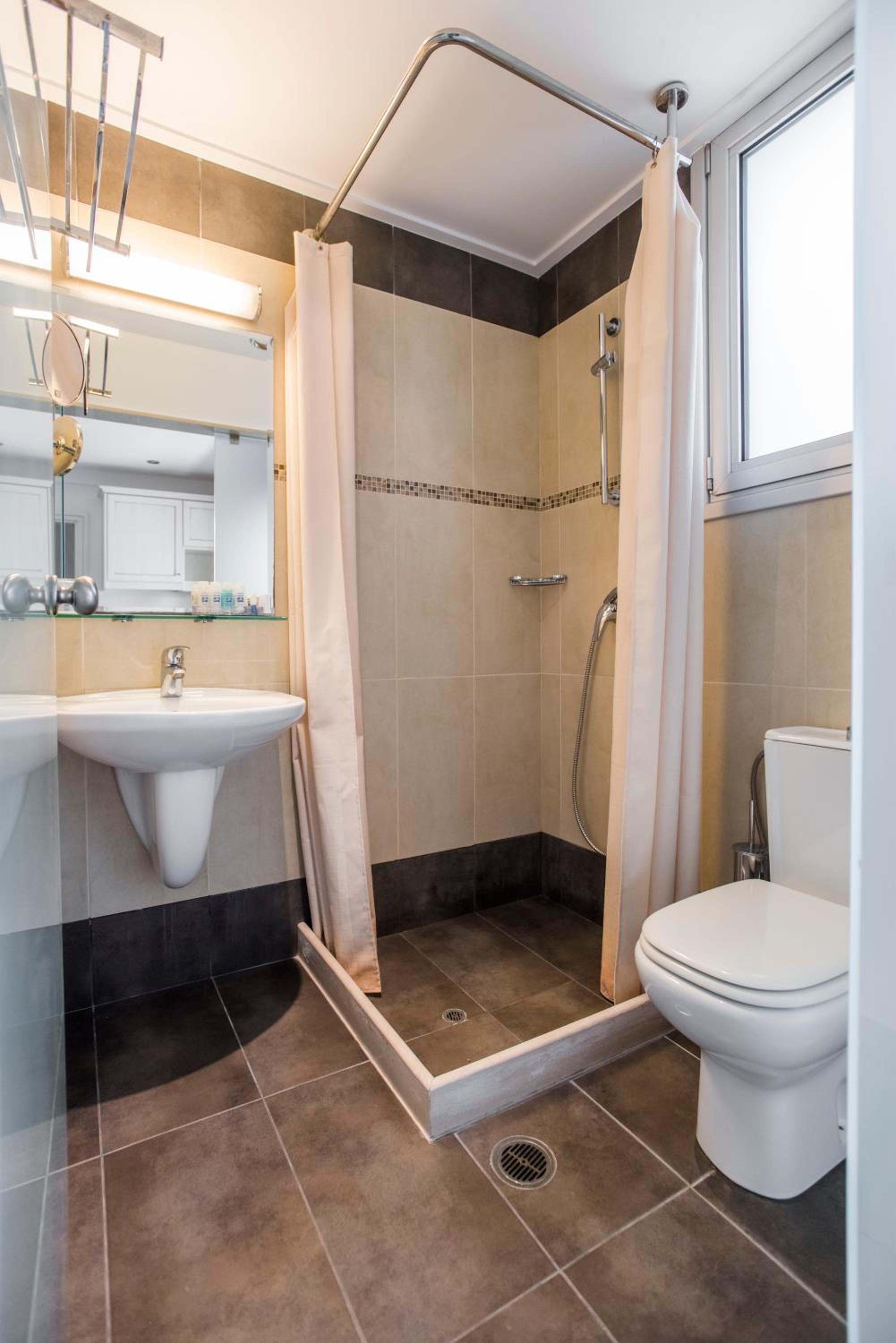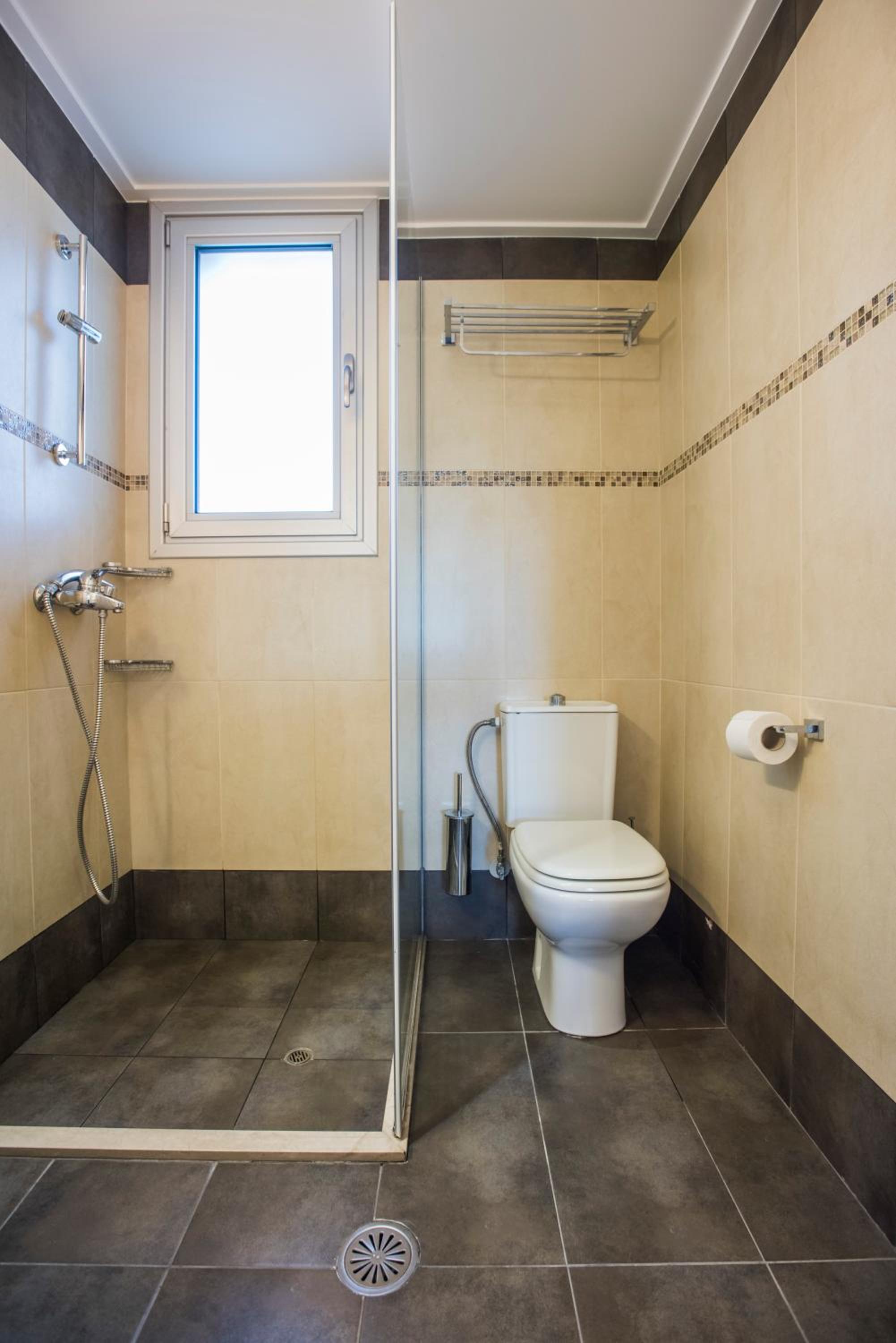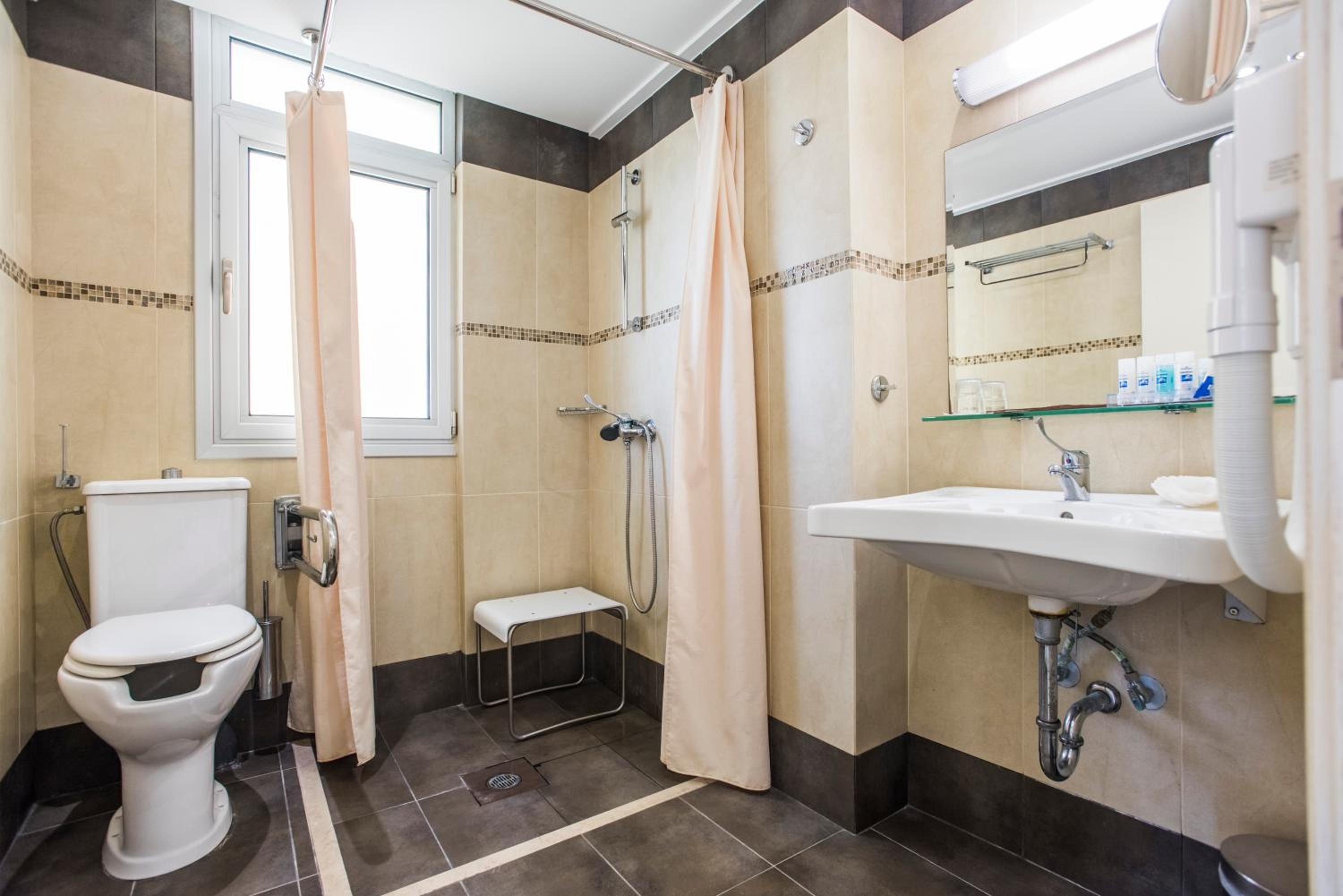 We stayed in a suite room with two bed rooms and two bathrooms. We had a large balcony and a saloon. Its’s large enough to accomodate up to 7 adults. It was very nicely decorated… There is even a fireplace in the saloon. It’s worths the price. The hotel is a great choice for romantic couples and families. The hotel is right on the seafront and sandy beach. The staff is friendly and helpful. The snack bar at the beginning of the day was delicious. It felt like home on Chios. When we left, we were sure we would return.