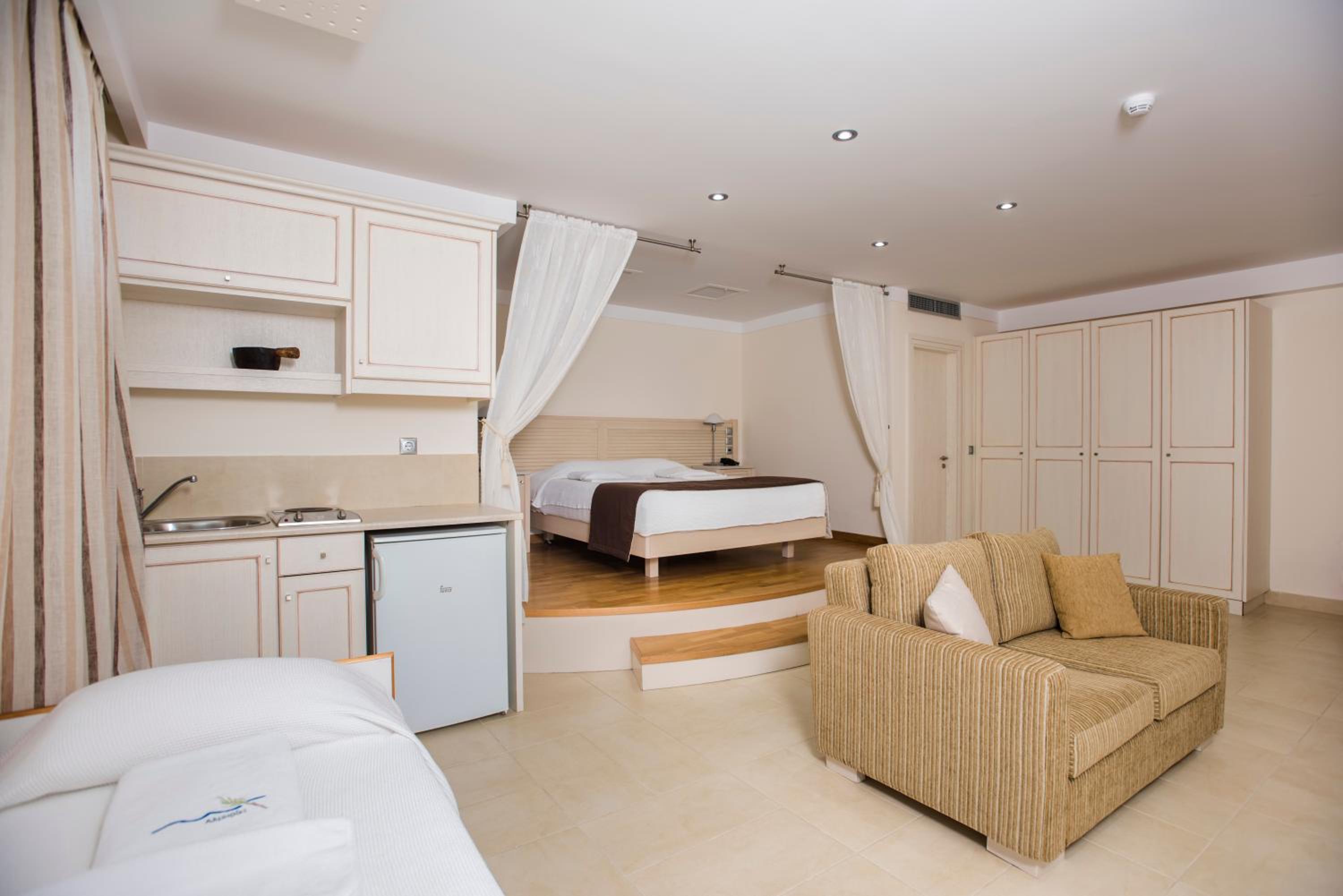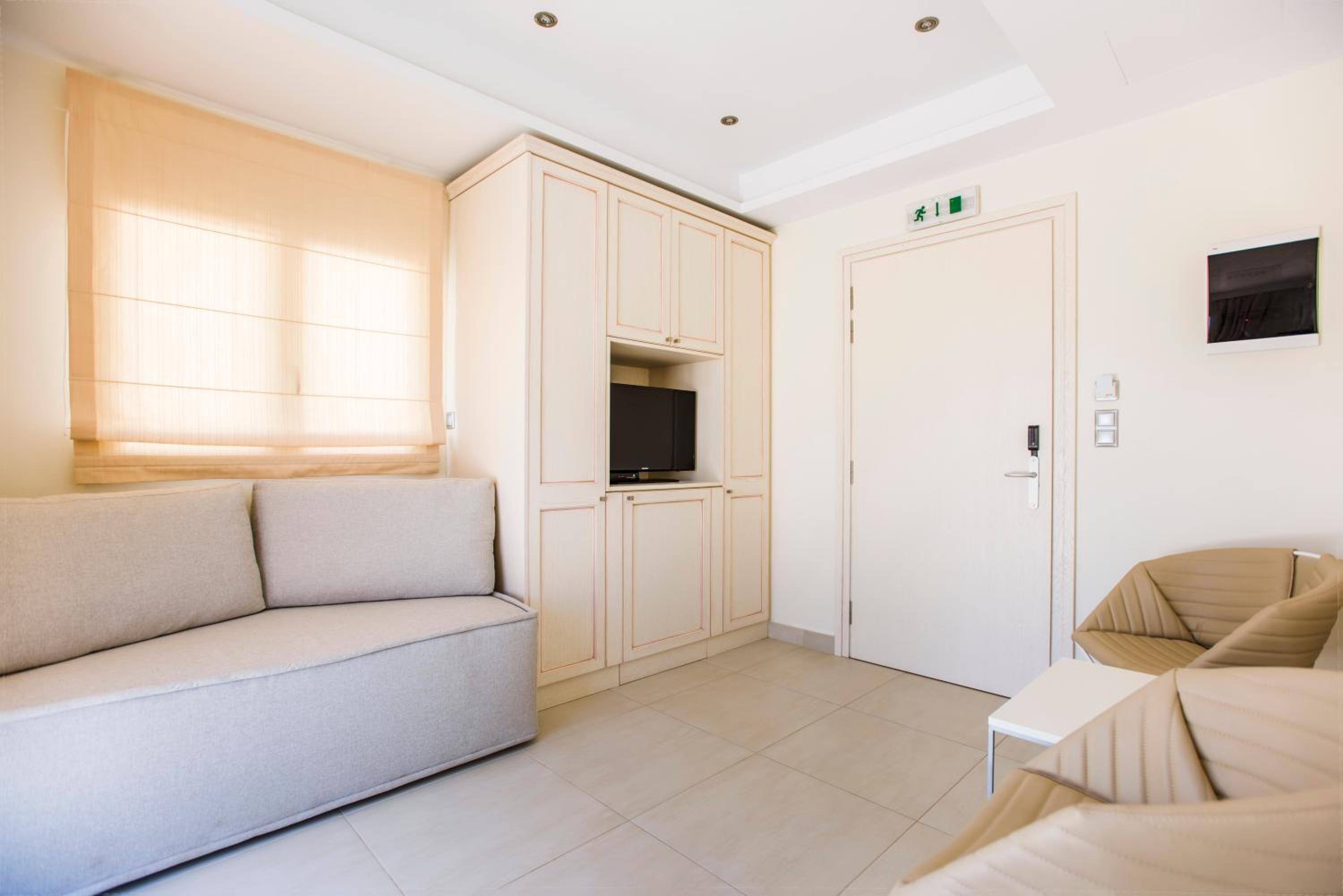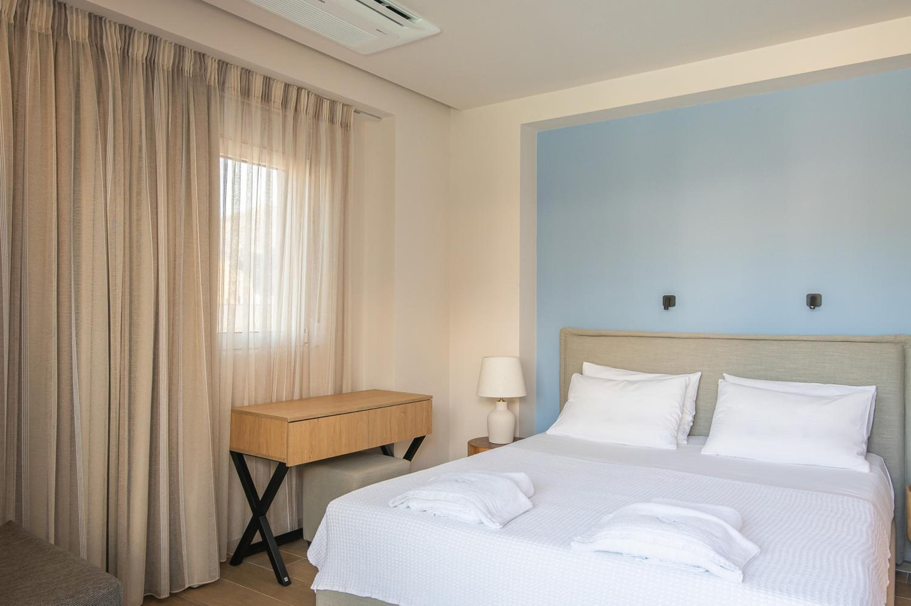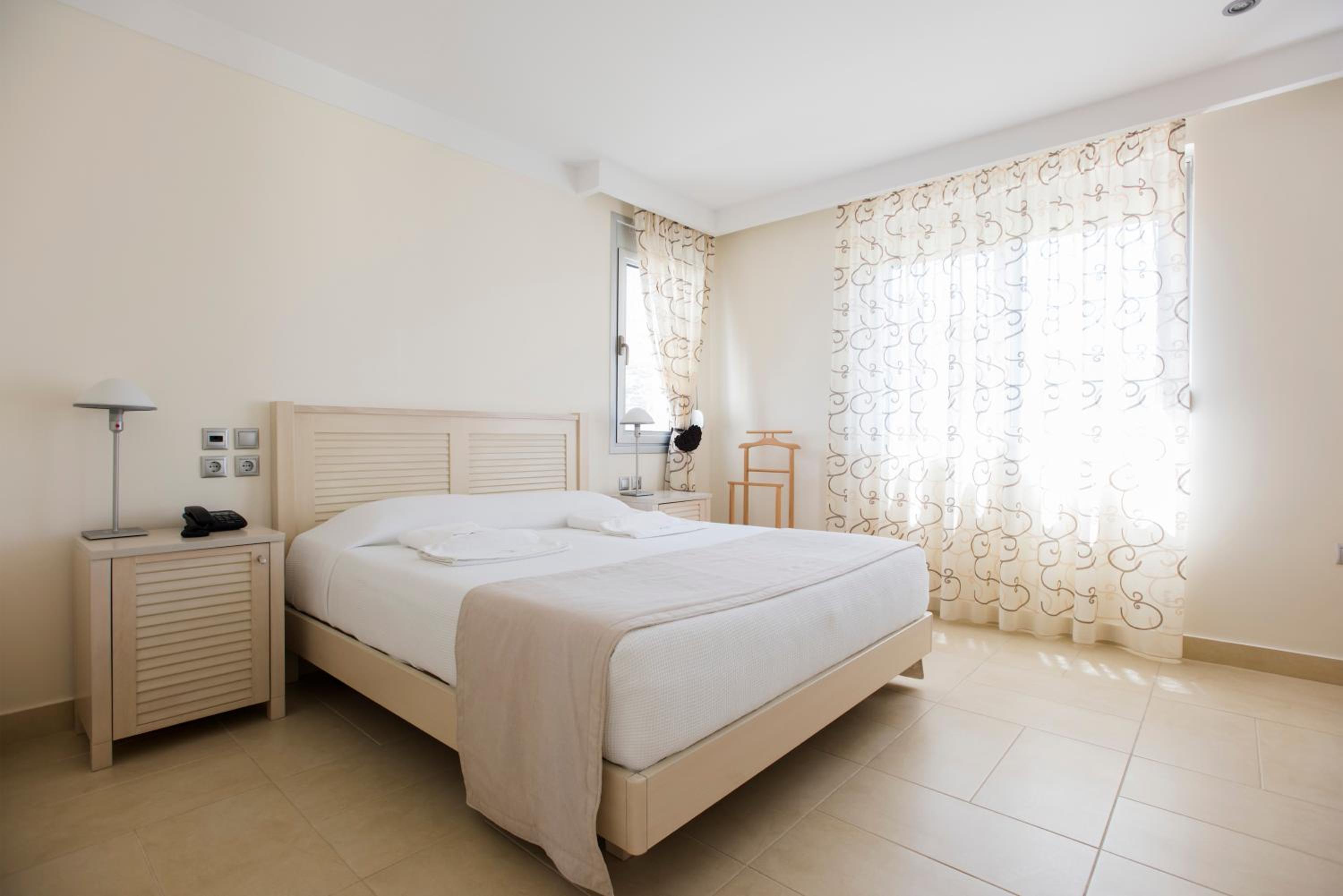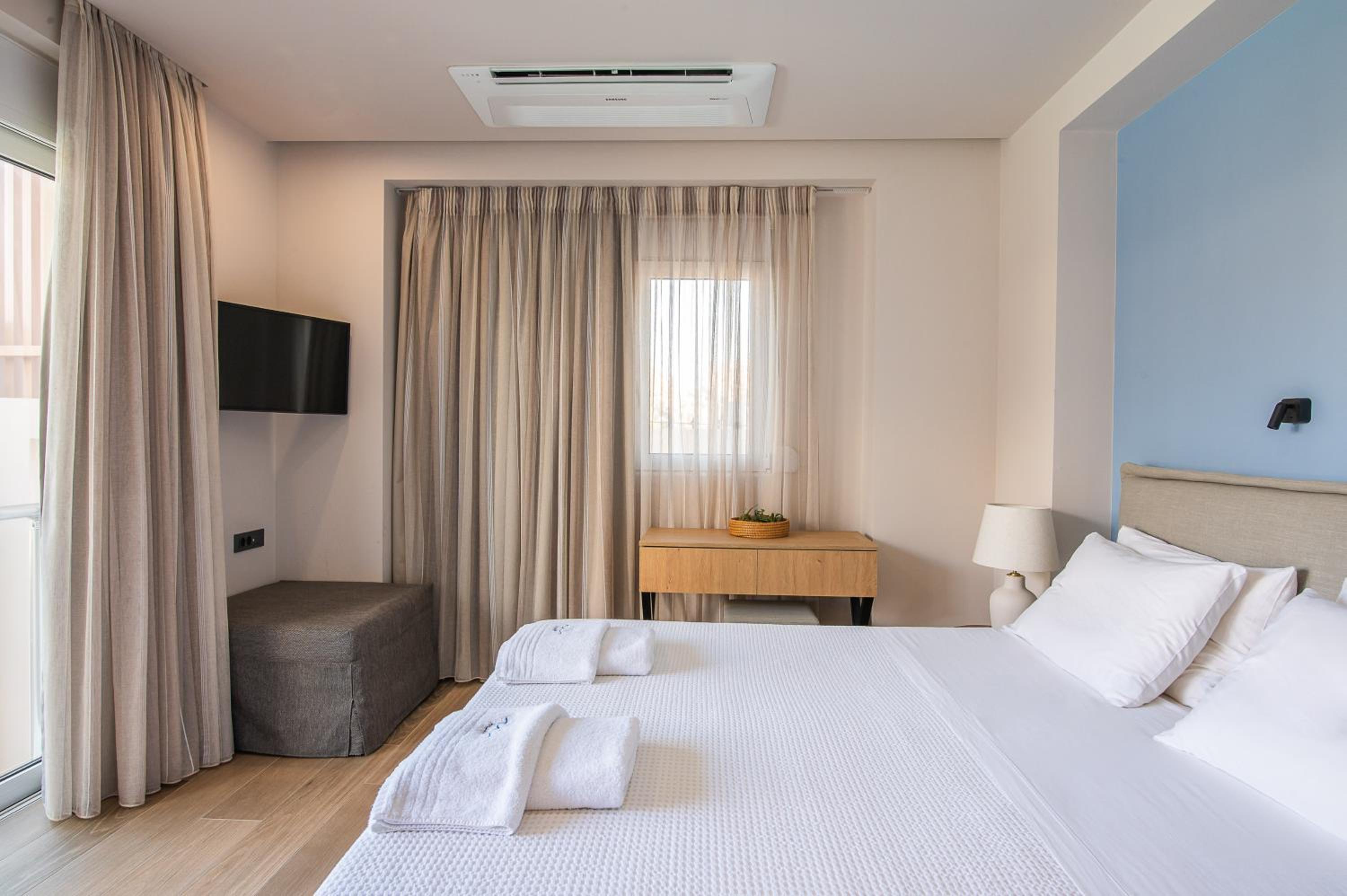 The light-filled rooms and apartments at Almiriki are elegantly decorated in soothing earthy tones and equipped with top-notch amenities such as Coco-Mat mattresses, bathrobes, and flat-screen TVs.