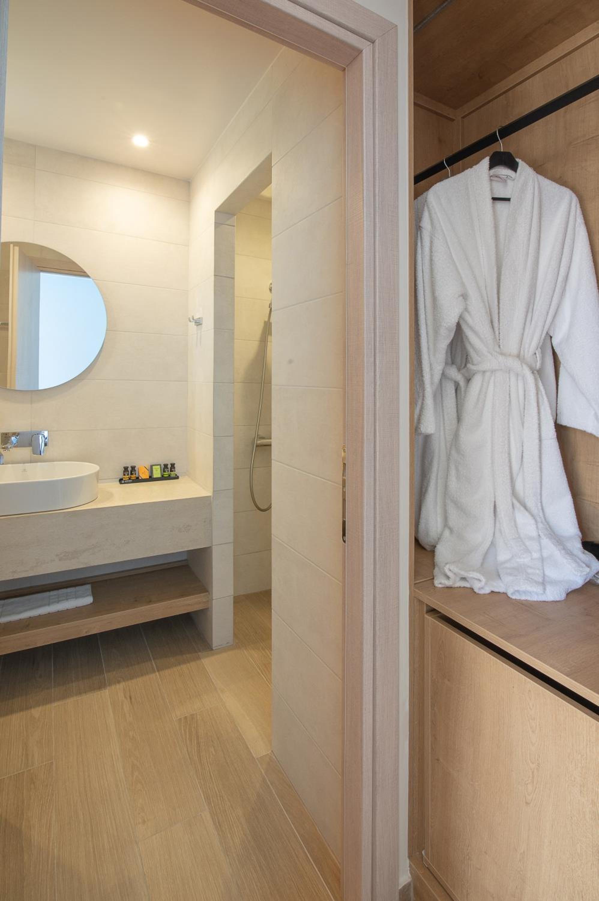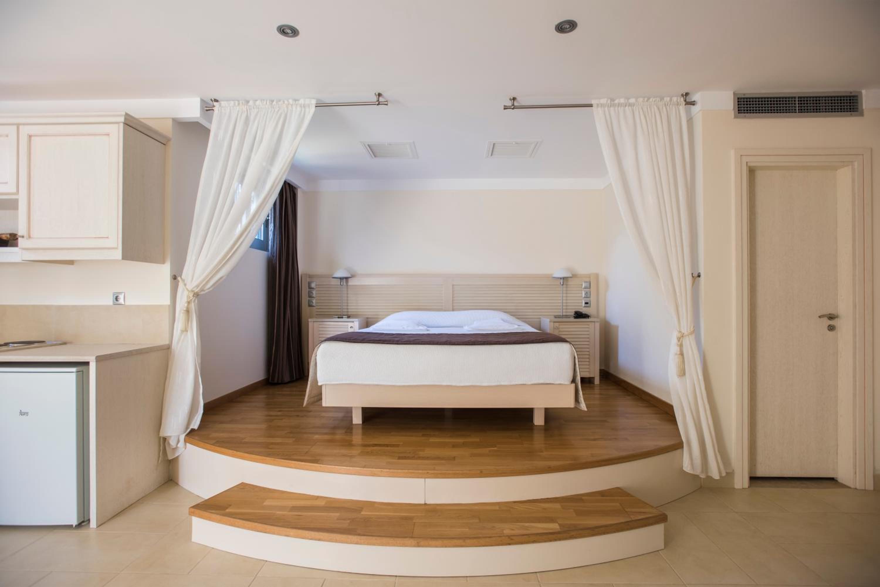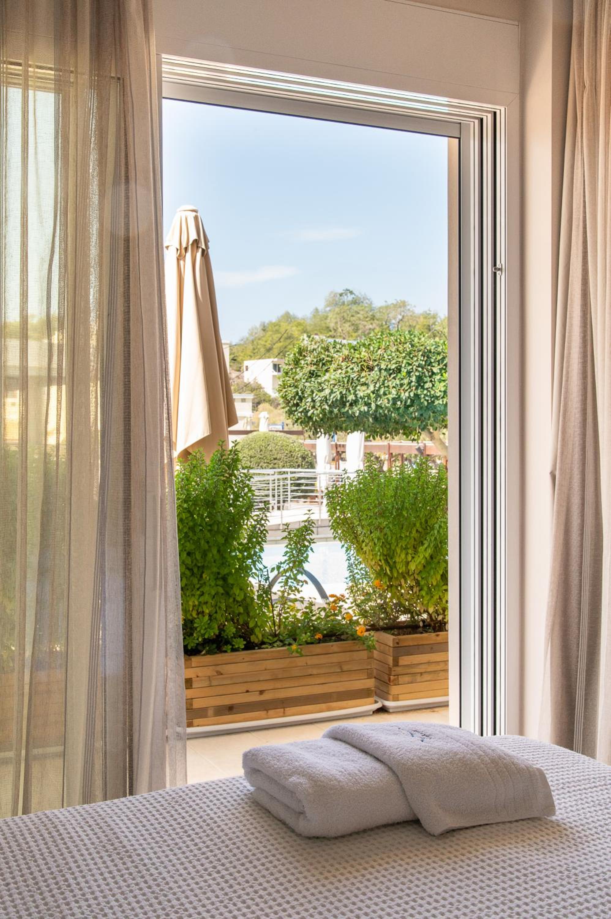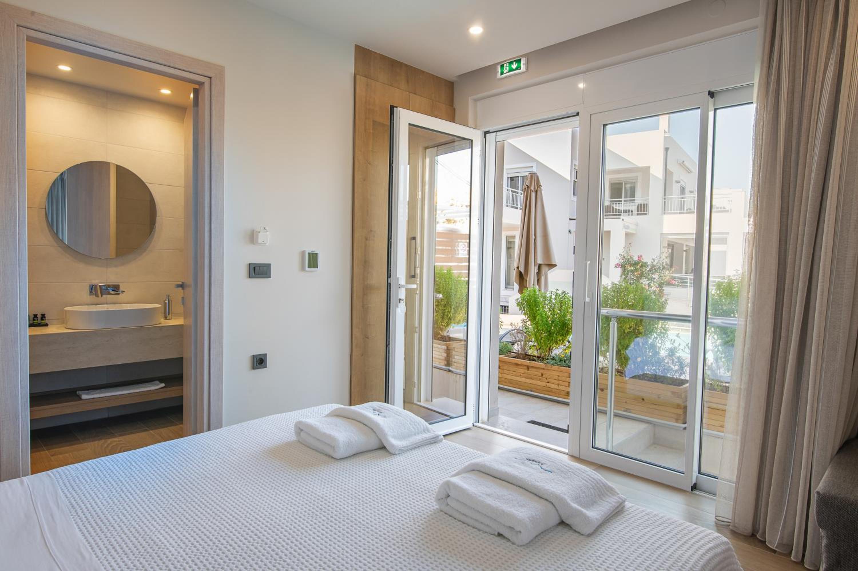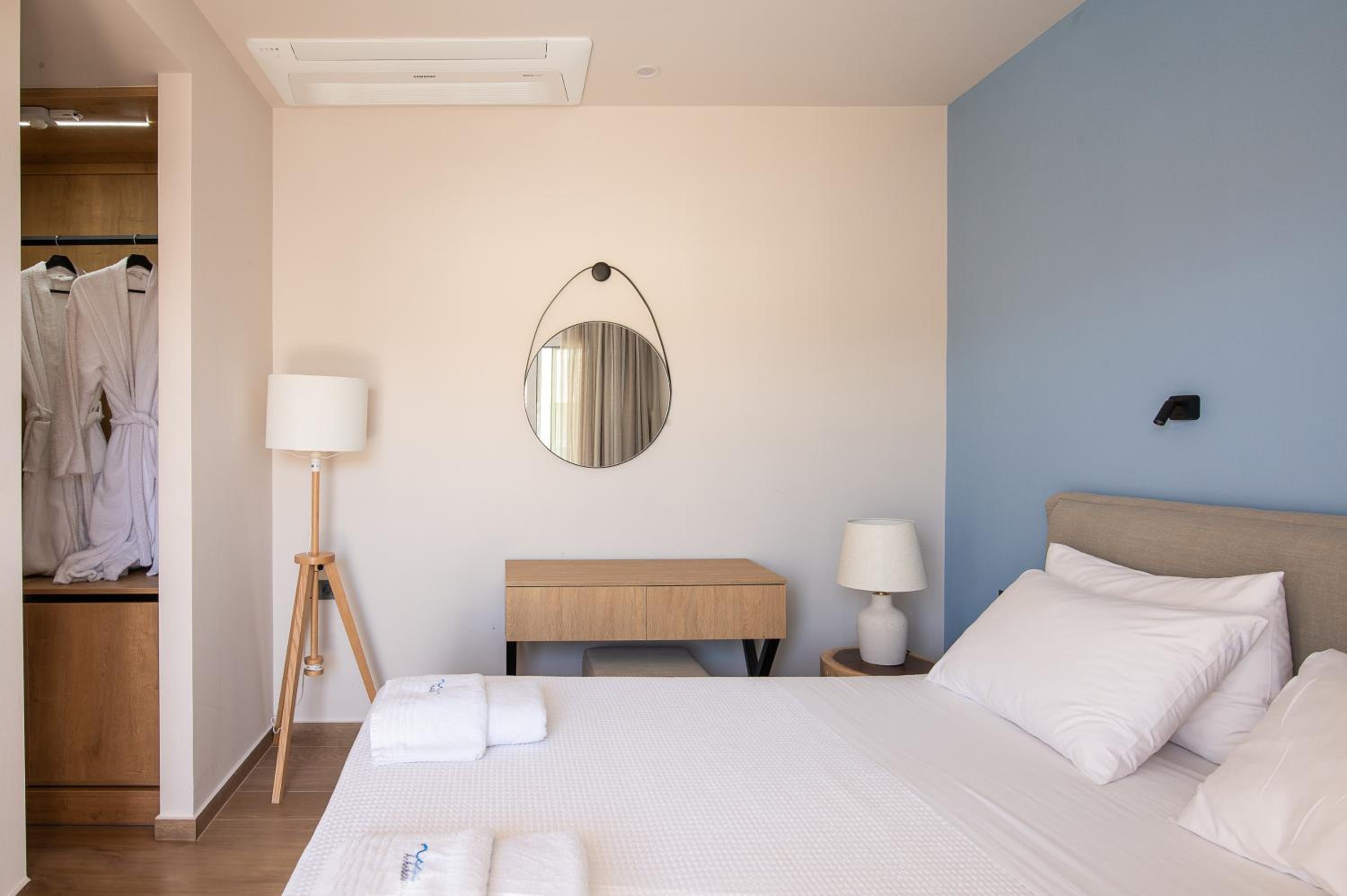 The light-filled rooms and apartments at Almiriki are elegantly decorated in soothing earthy tones and equipped with top-notch amenities such as Coco-Mat mattresses, bathrobes, and flat-screen TVs.