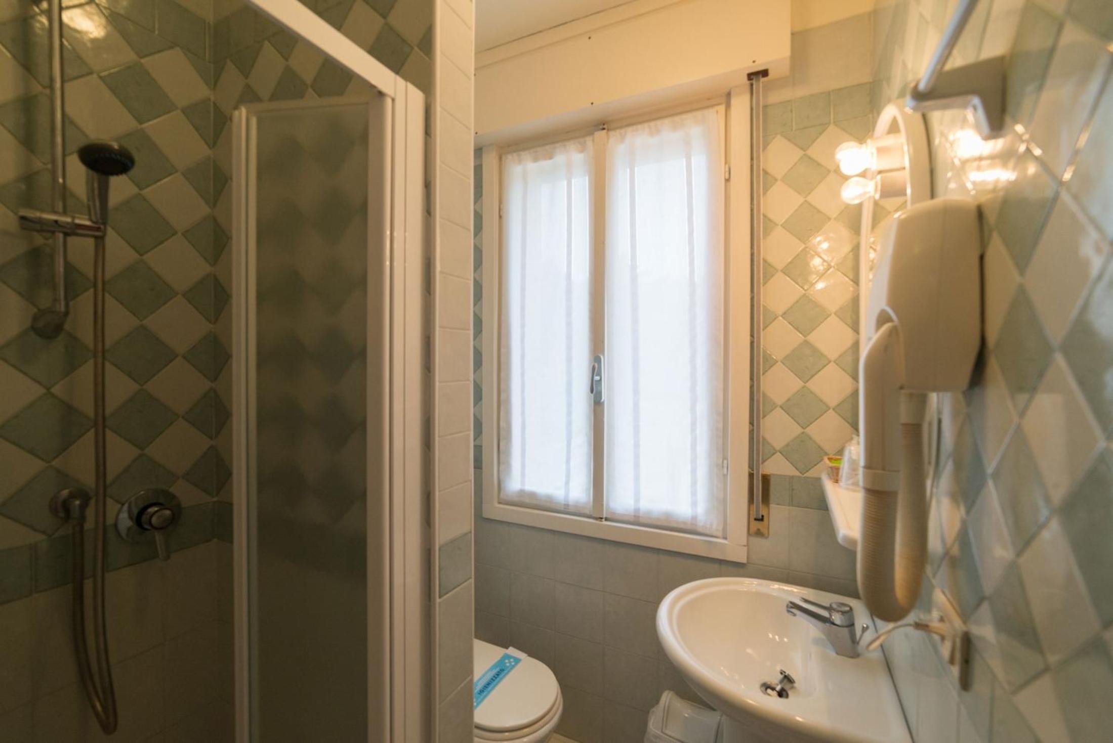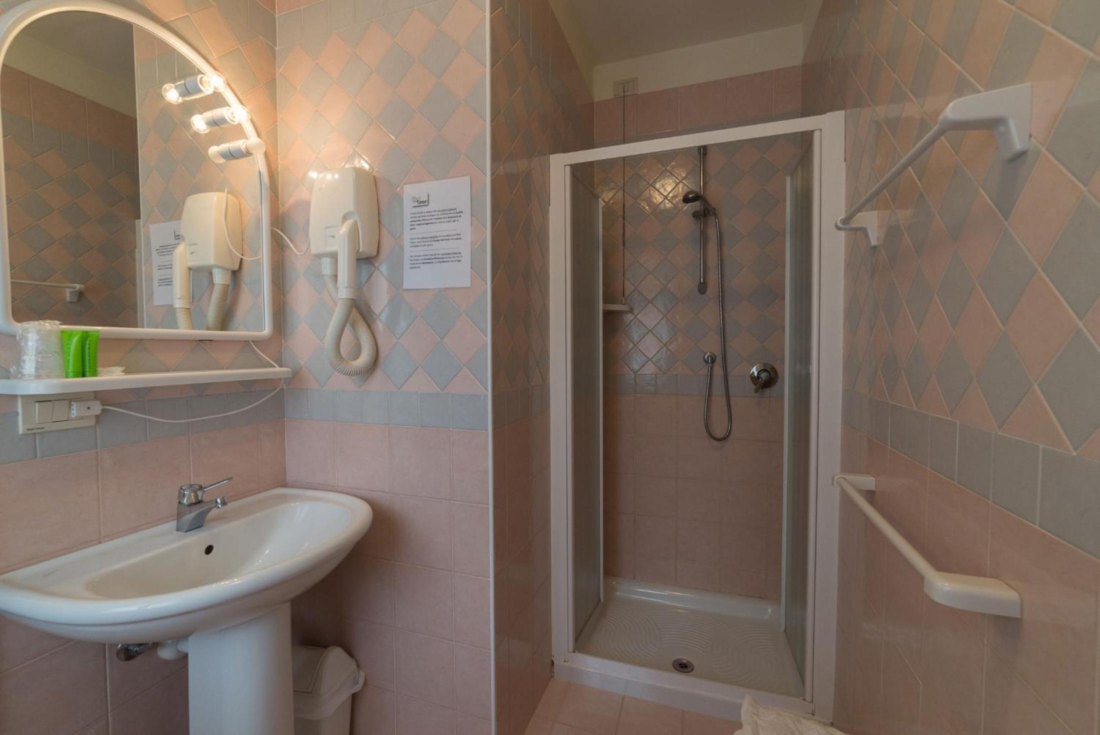 Dusjen er litt liten, men det funker. Harde senger og puter er et stort minus, spesielt om du er der flere netter 😔