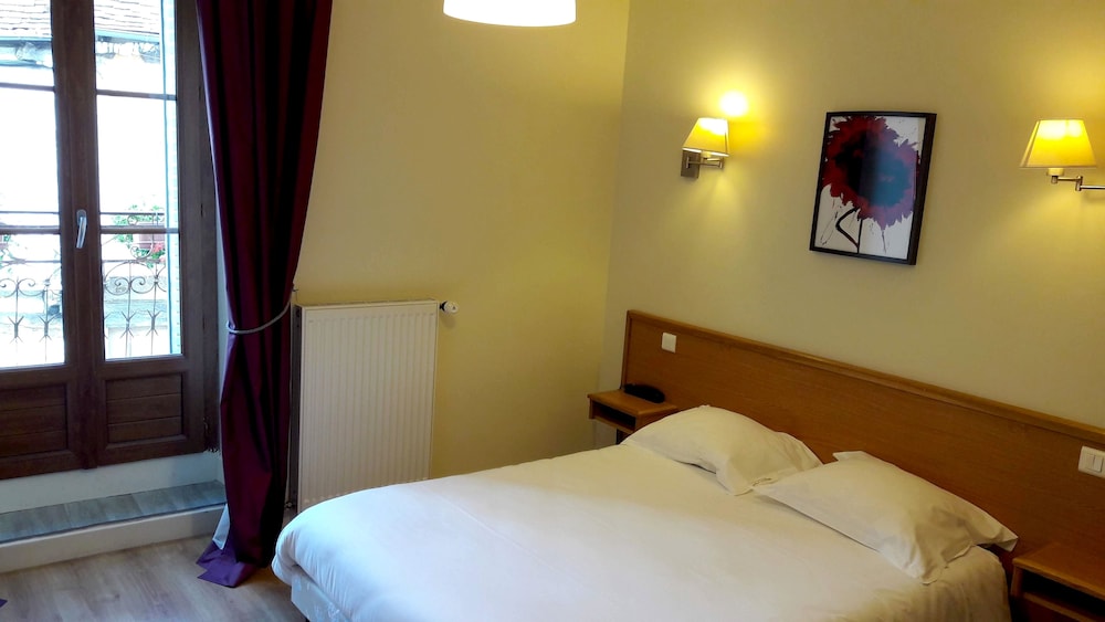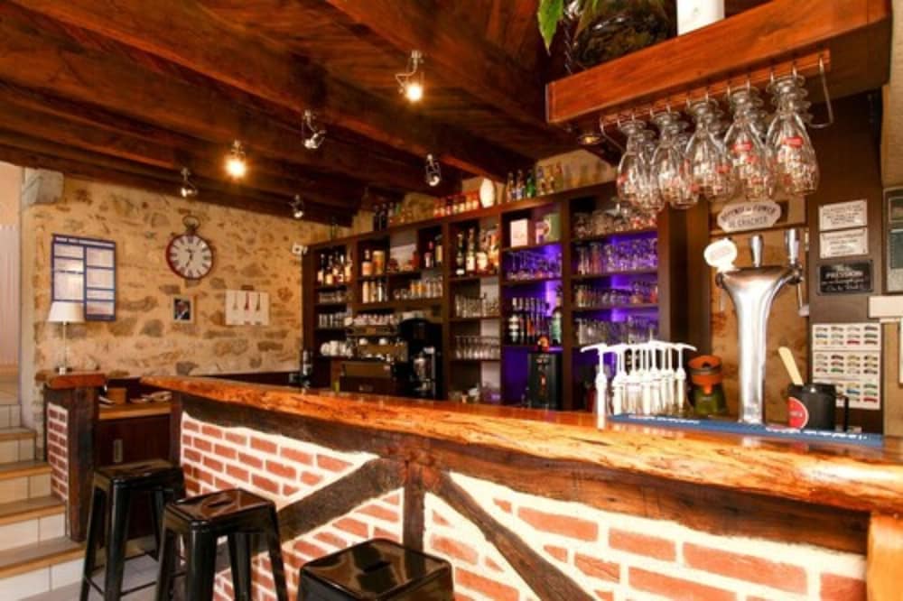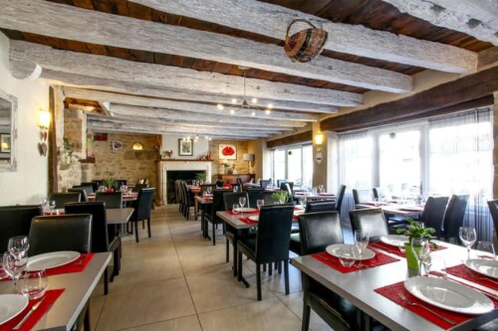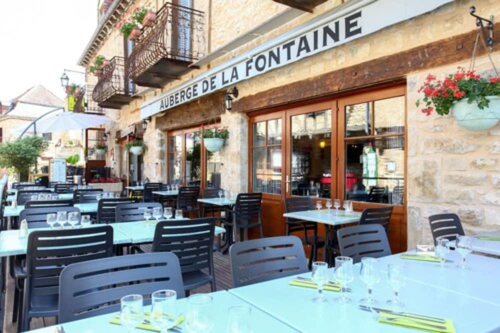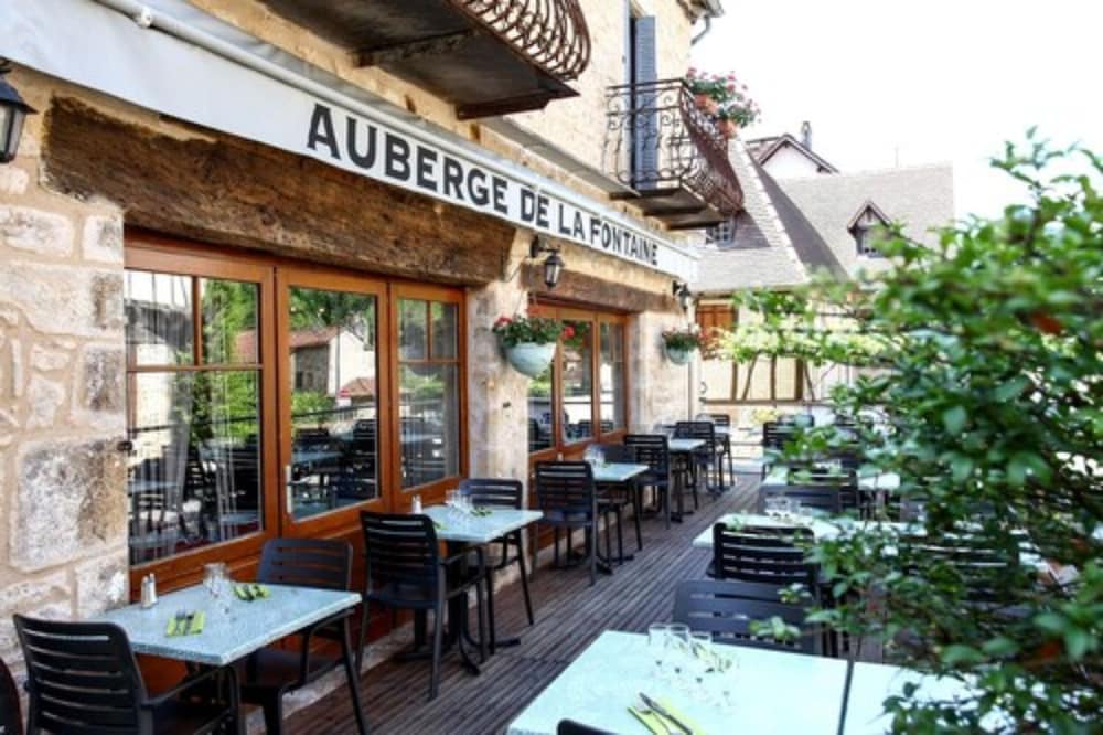 Logis Auberge de la Fontaine: Relax on the terrace with stunning views and enjoy a meal at the restaurant before unwinding in the bar/lounge. Book your stay now for a memorable experience.