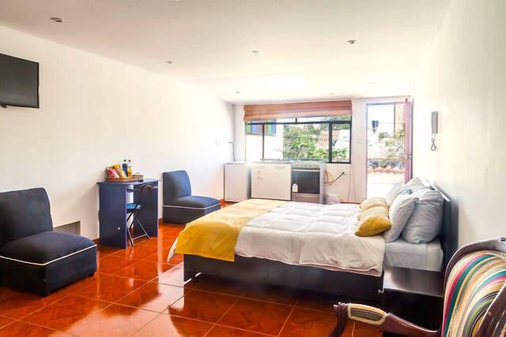 Great apartment-style living in a quiet upscale neighbourhood! Room was approximately 600 square feet. There was a kitchen, two bedrooms (master+standard), and a master bath. You're in a gated community with a beautiful view to the western hills. The staff members were extremely accommodating to my pidgin Spanish.
