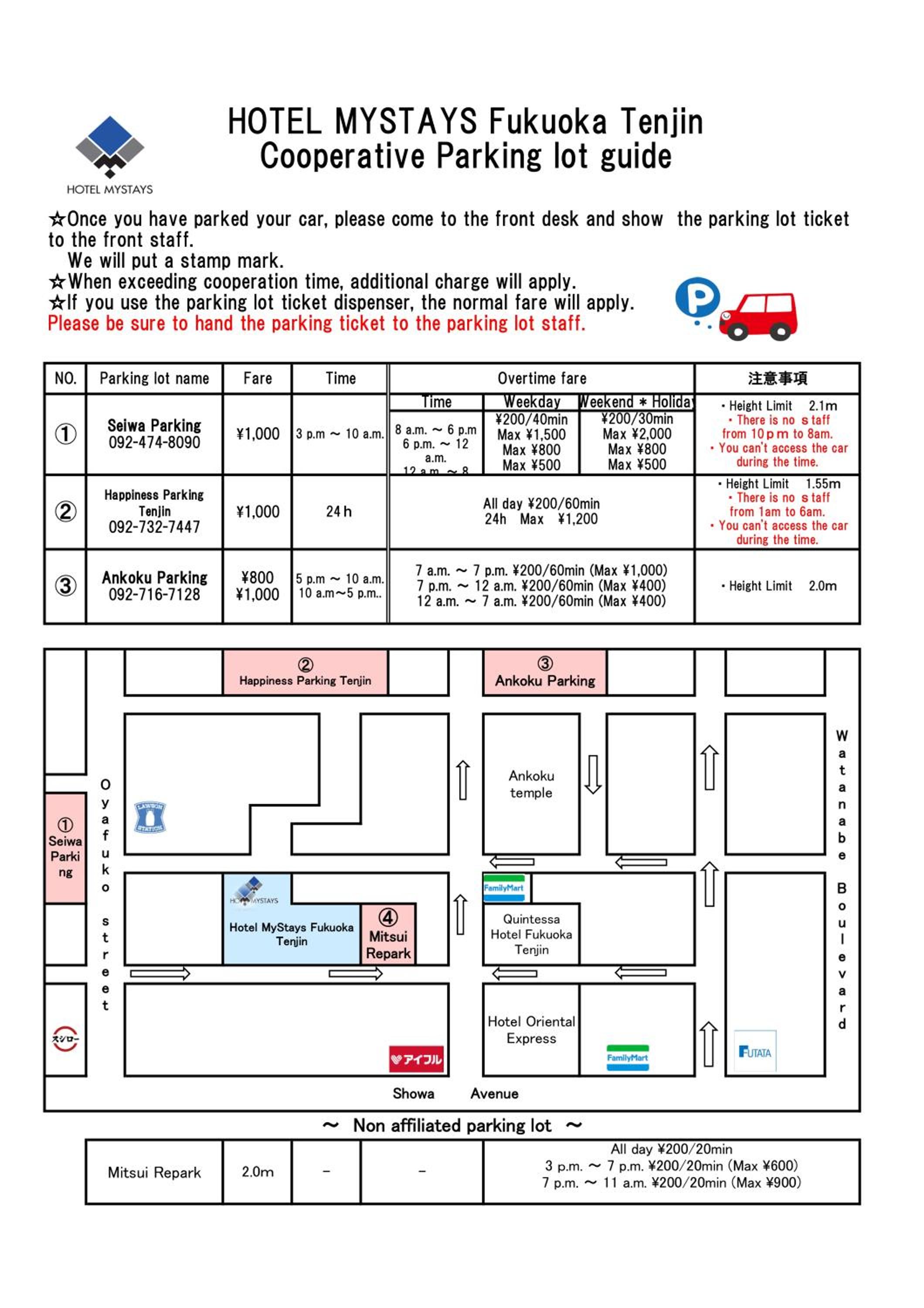 Public parking is possible at a location nearby (reservation is not possible) and costs JPY 2000 per day.