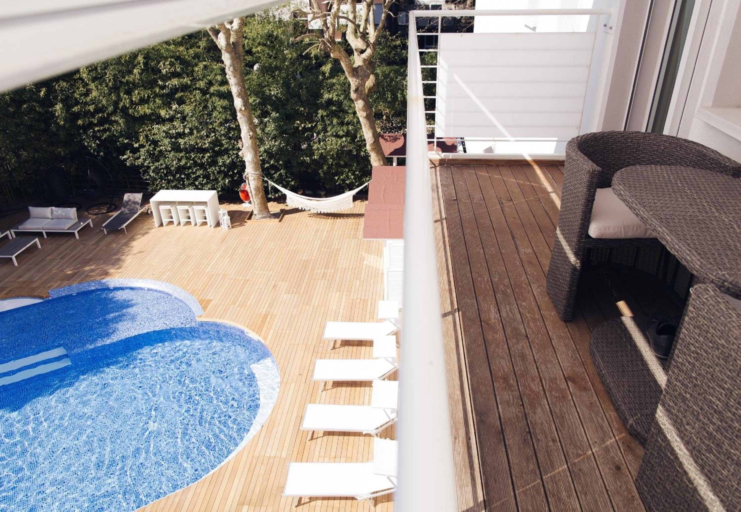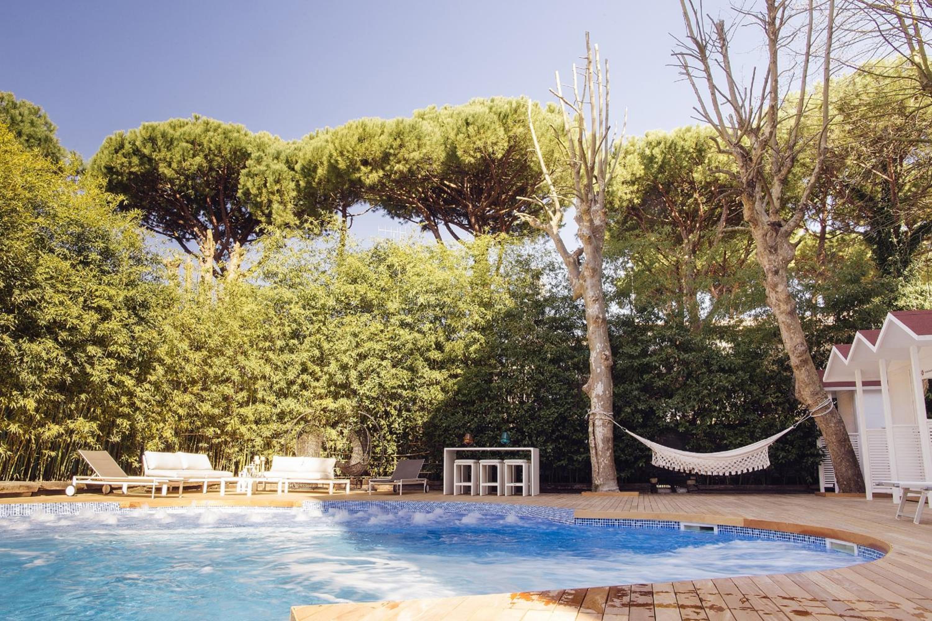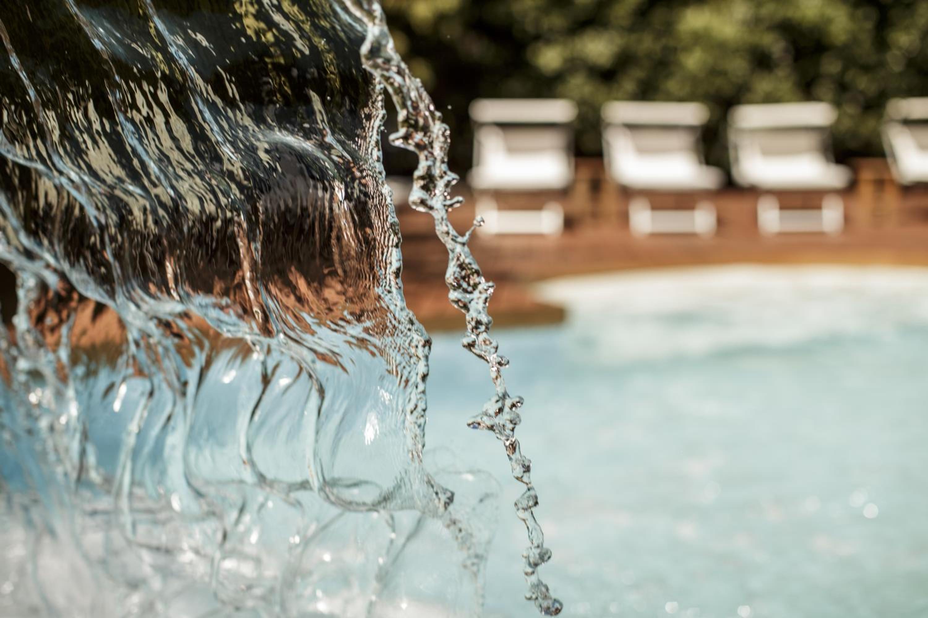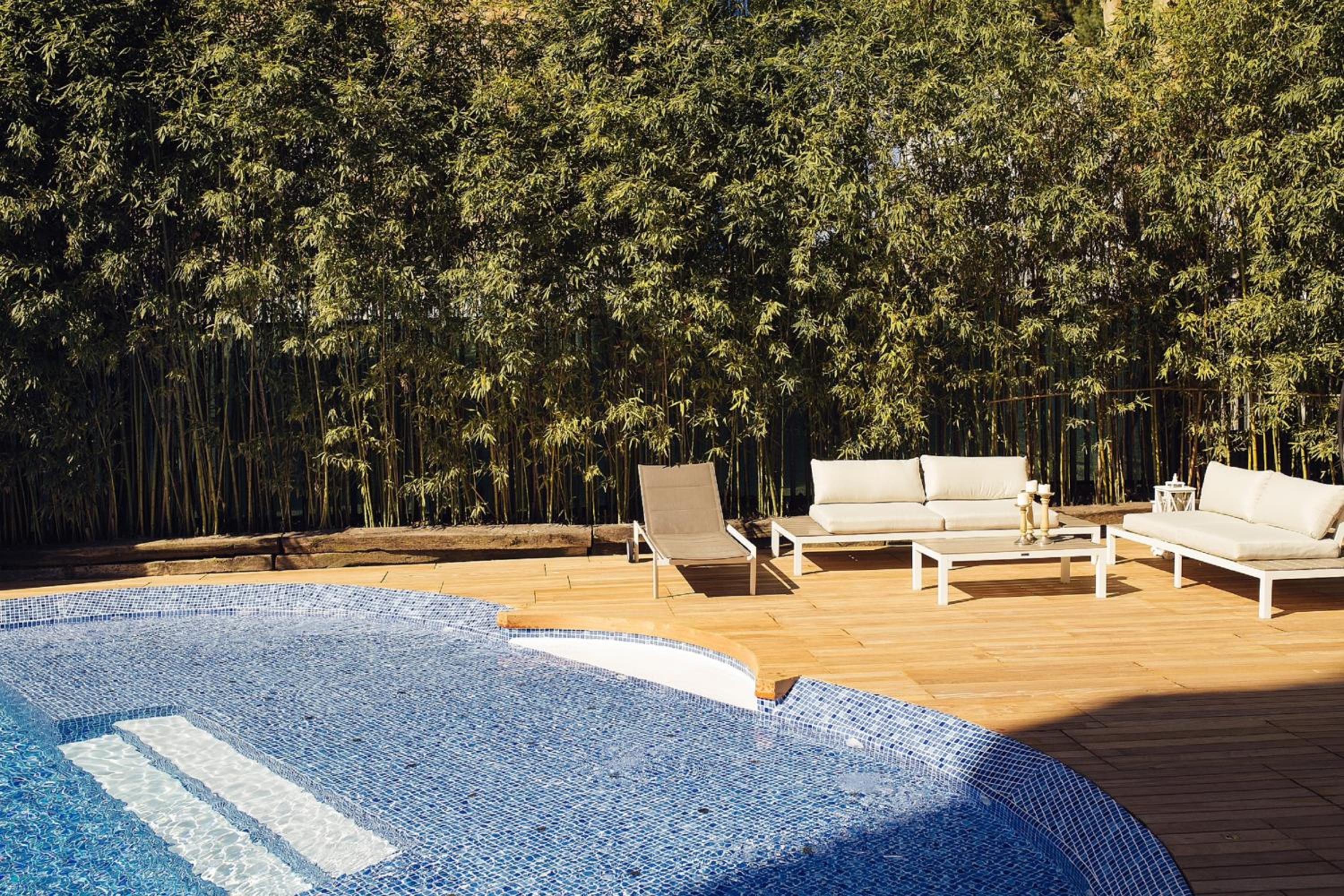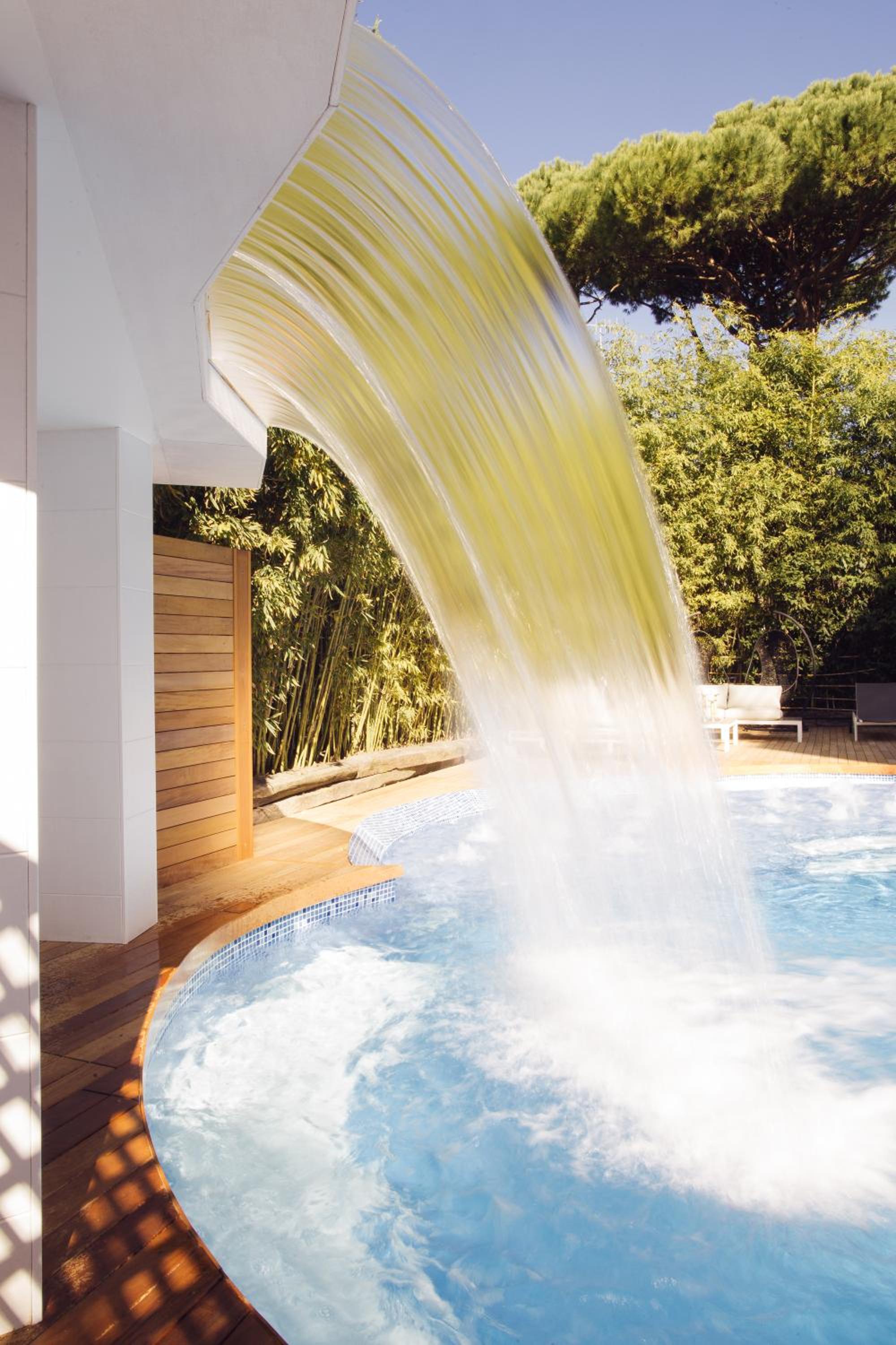 Indulge in relaxation with a heated swimming pool featuring rainfall and hydromassage, set in a spacious garden for a tranquil escape.