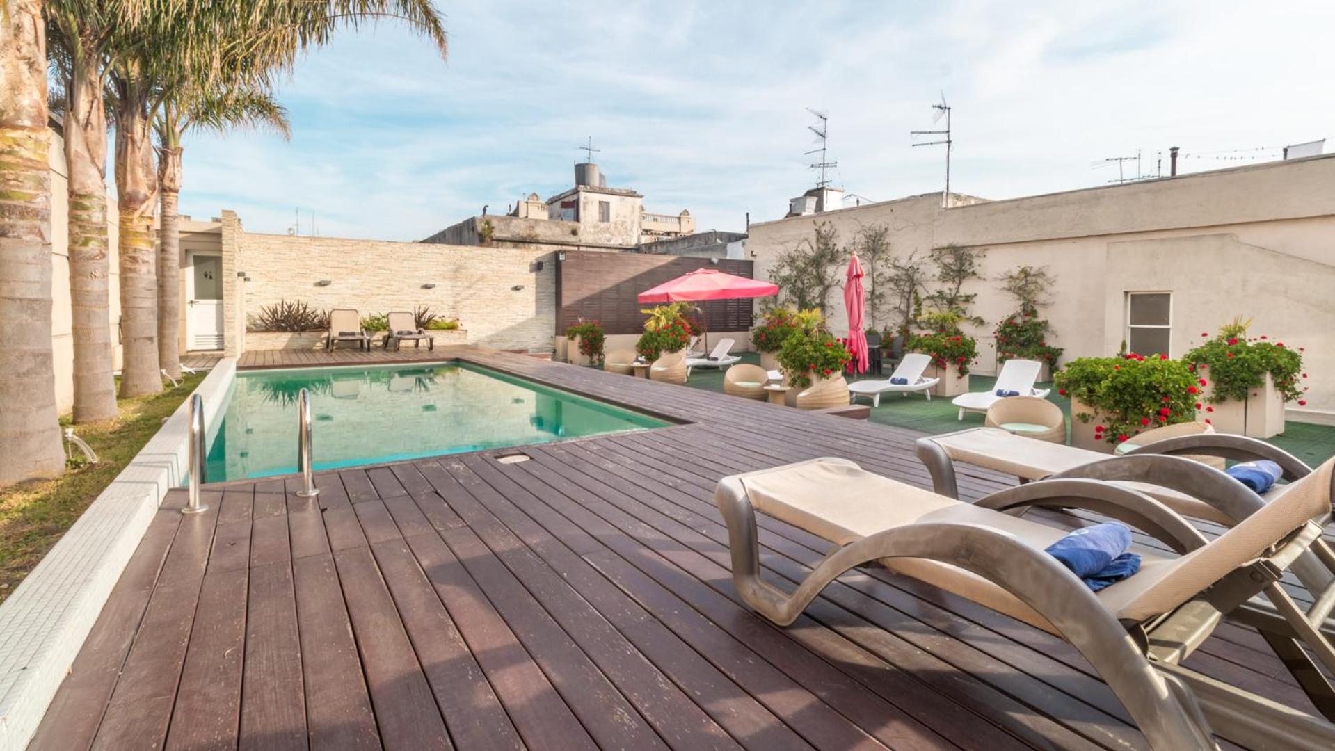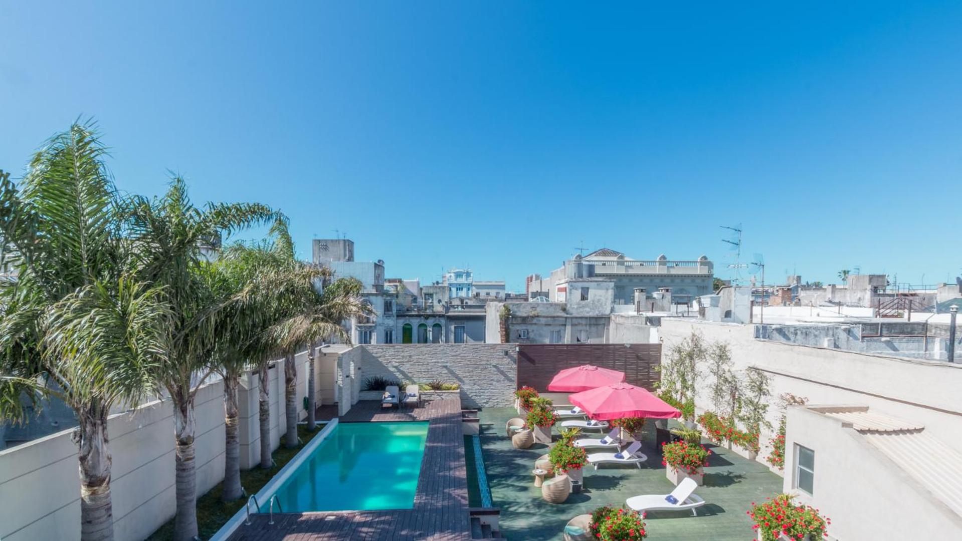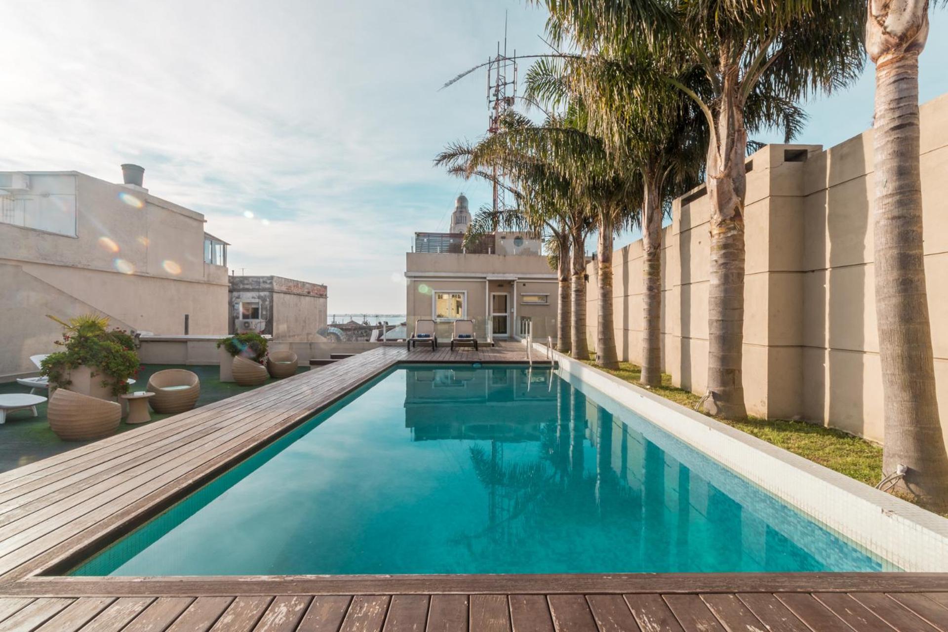 The panoramic rooftop boasts an outdoor pool, sun terrace, and a trendy rooftop bar with stunning views of downtown Montevideo and the Rio de la Plata river, perfect for relaxing and taking in the city's beauty.