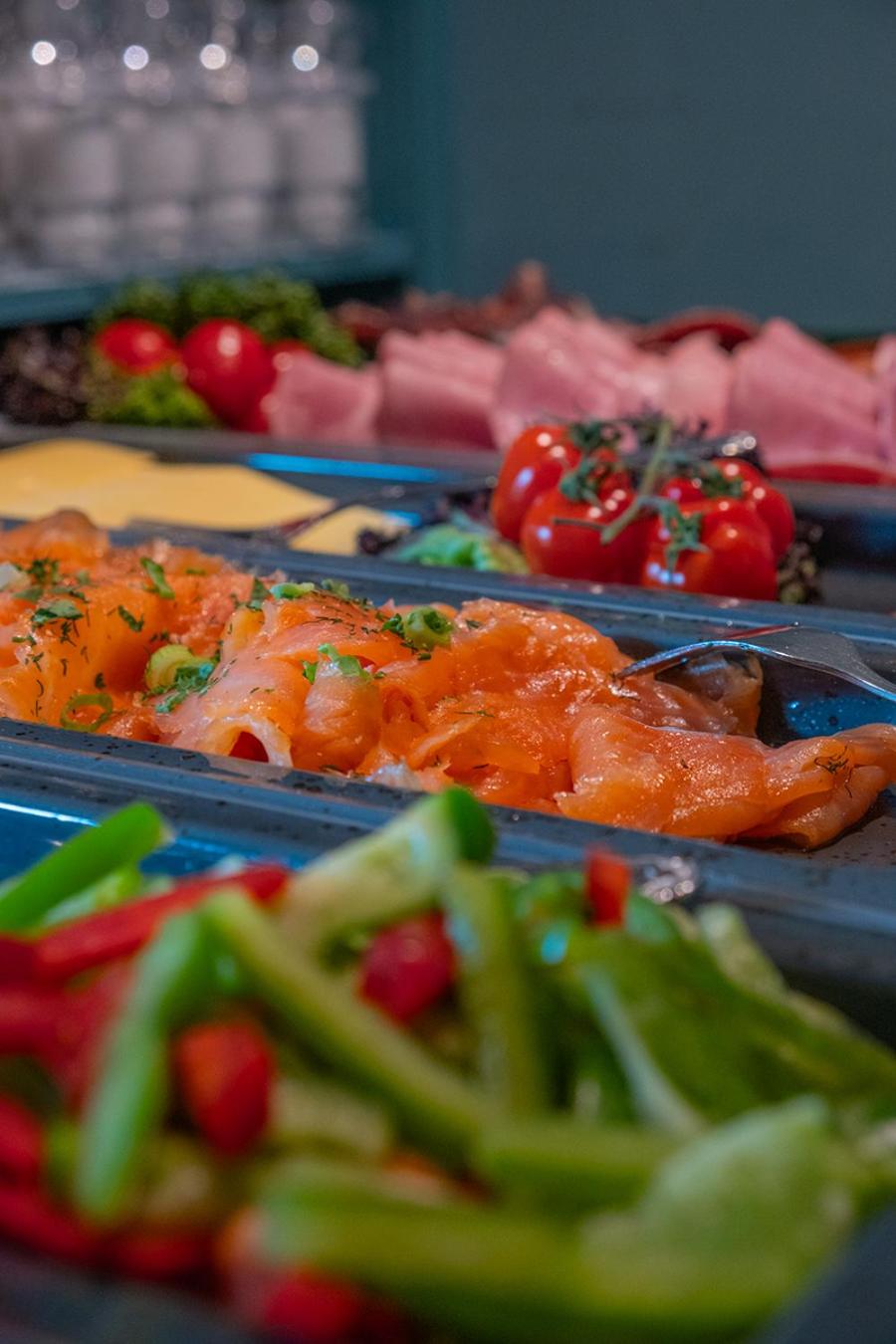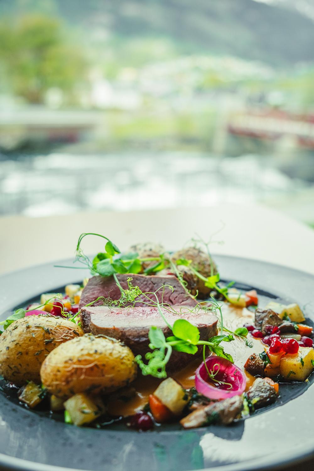 Dss Frühstück war reichhaltig und gut. Man hatte eine schöne Aussicht auf den Fjord und den Fluss.