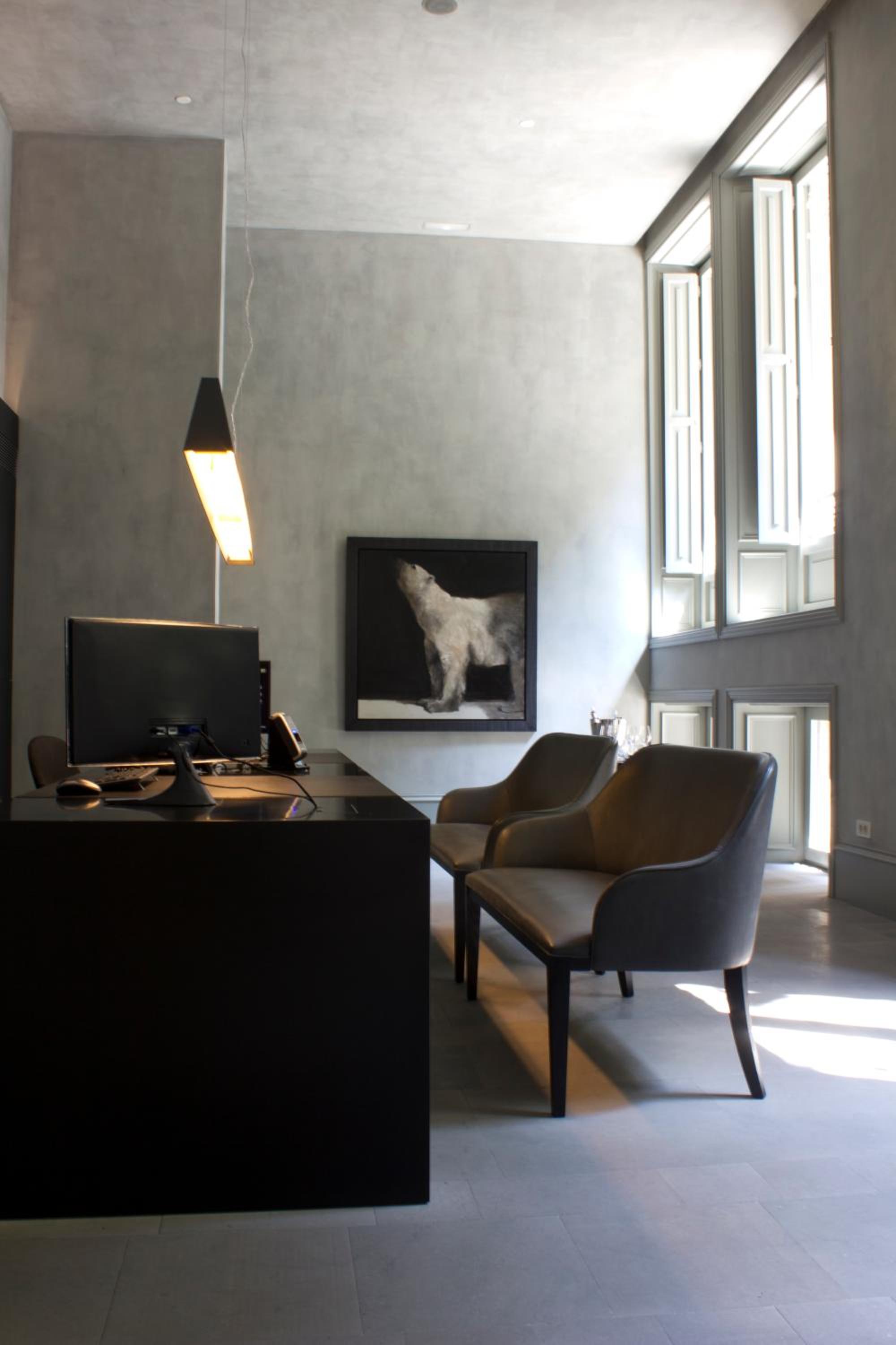 Modern and sleekly designed hotel in the Eixample area of Barcelona with dramatically dark lighting,full amenities and spa and uniquely private wooded courtyard. Large, quiet rooms with high ceilings with windows that open.