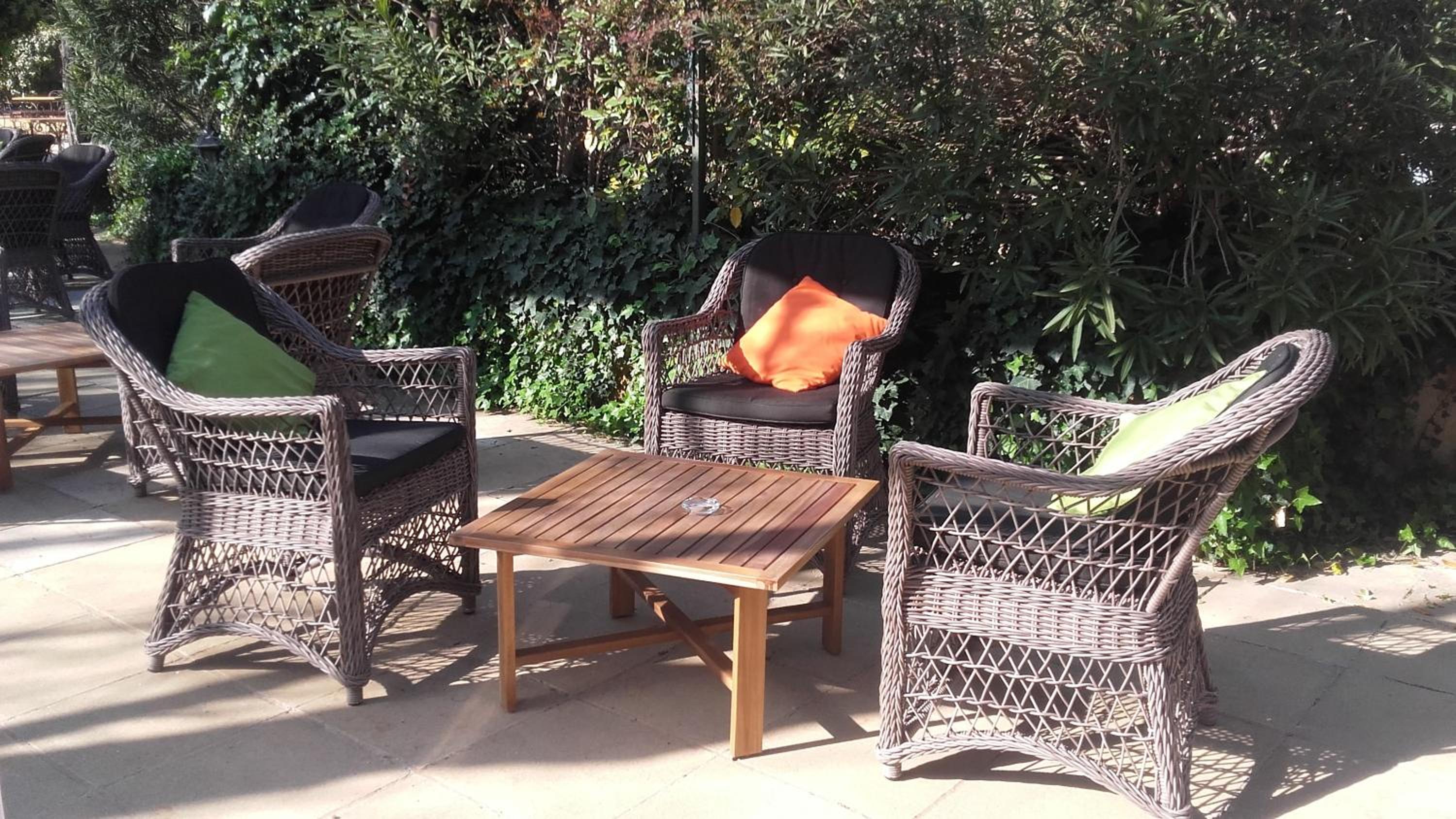 Table en terrasse au milieu de verdure avec le soleil