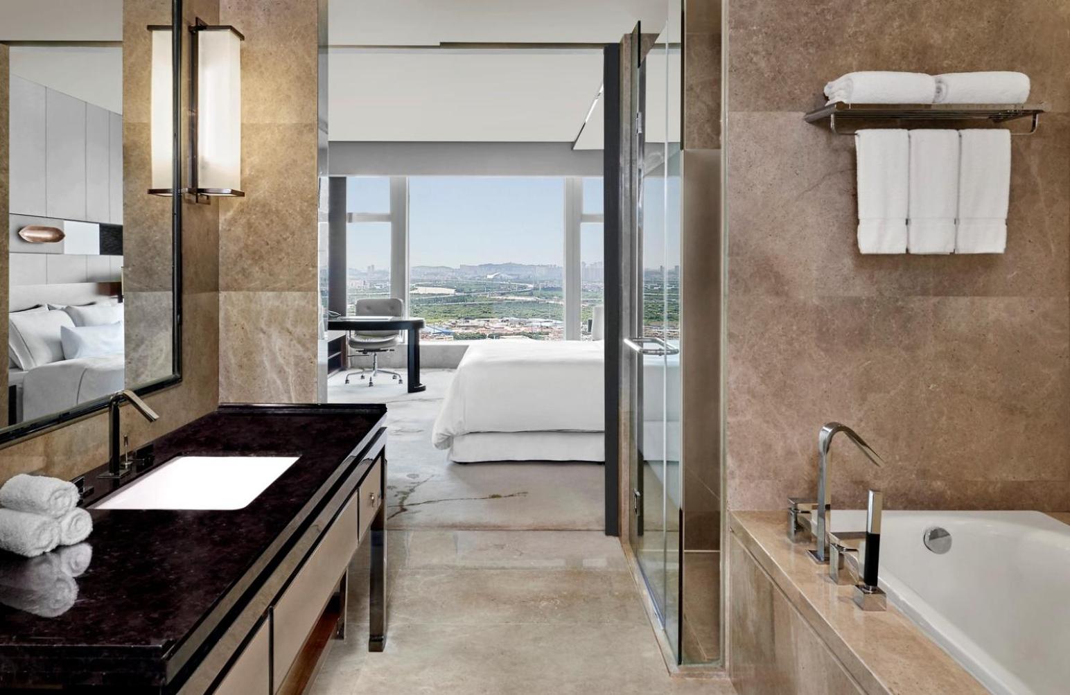 The Westin Pazhou offers spacious rooms with stunning city skyline or Pearl River views. Enjoy modern amenities such as a 42-inch flat-screen TV, iPod docking station, and a luxurious en suite bathroom with a rain shower and bathtub.