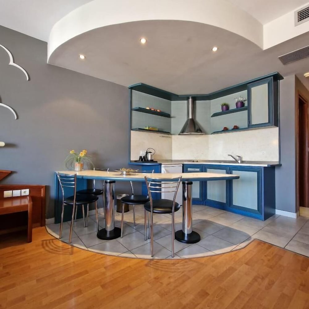 We stayed here 2 nights, my wife wnd my 3 sons aged 12, 10 and 5. We had a family room with 2 bedrooms and a bed for wach of us, a bathroom and a kitchenette which had heaps of space for us and our stuff. The place was spotless and had everything we needed. The staff were very friendly & informative right from check-in and througout our stay. My in-laws were in Greece and tagged along with us for a few days, and a whilst there was no availalibilty for an extra room online, I called a couple of days before & explained & without trouble they arranged a room for my in-laws right next door to ours. There is ample parking, the beach is a short walk, as are the restaurant and shops. We ate lunch and had drinks at the restaurant & pool bar, and the food was great. We also spent the day at their beach area on the lounges, had lunch and cocktails on the beach. Will definitely stay again and for longer!