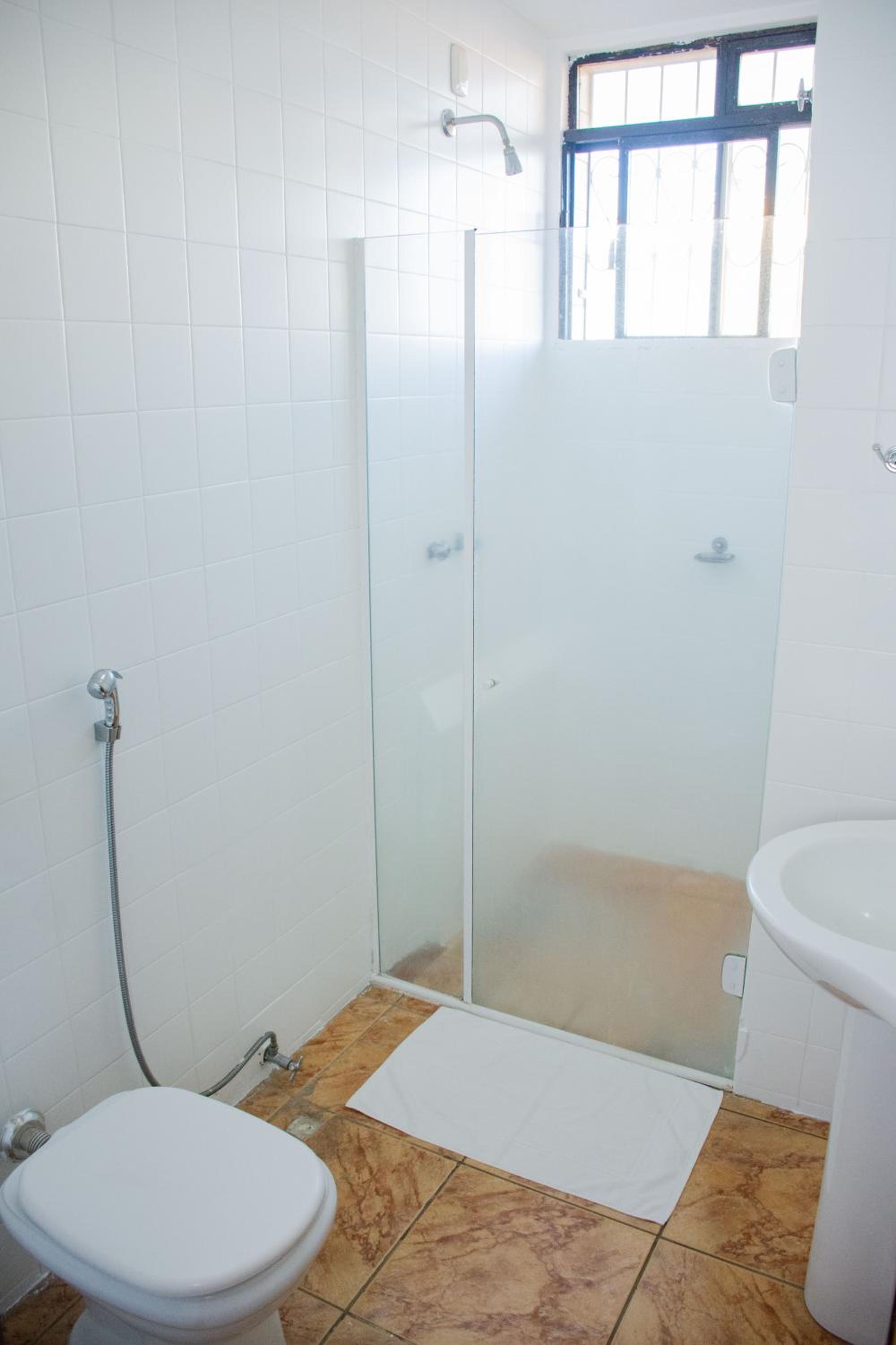 Banheiro com estrutura antiga, precisando de melhorias, em especial na ducha que não estava com água completamente aquecida.