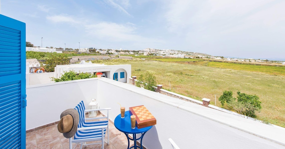 A real lap pool. Vineyard and palm trees out front and a great view of Thira at the rear. First class breakfasts and super staff .