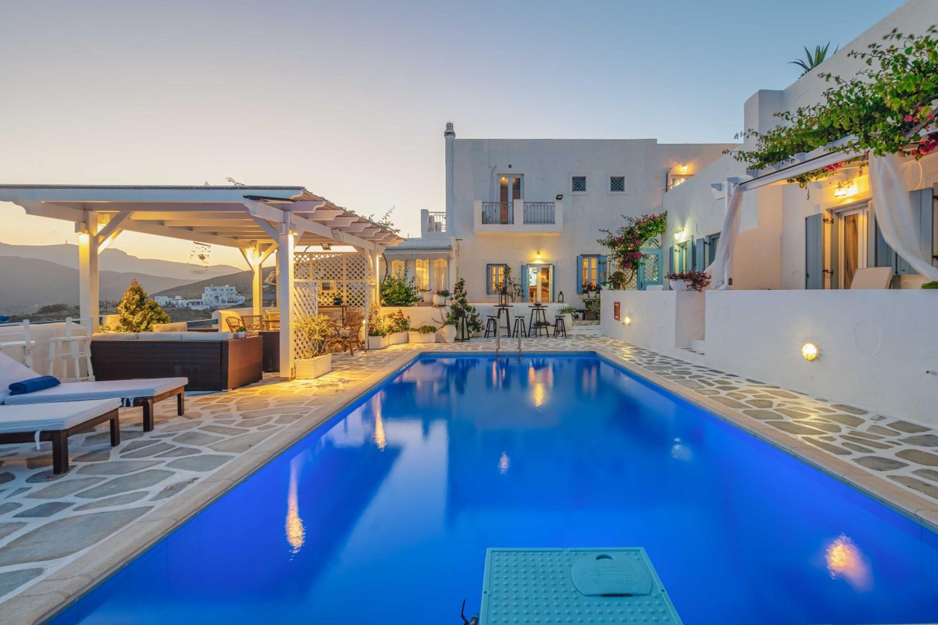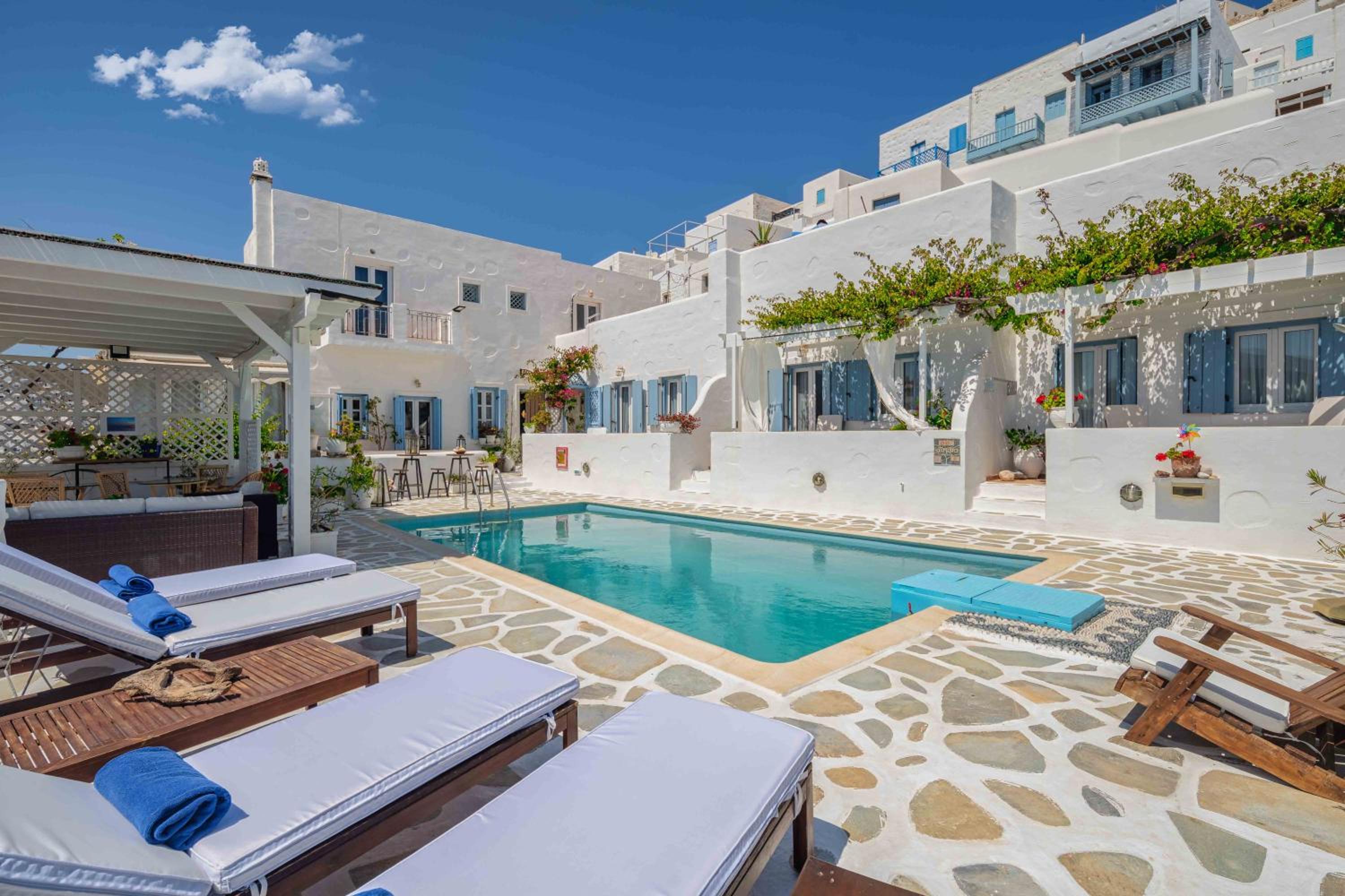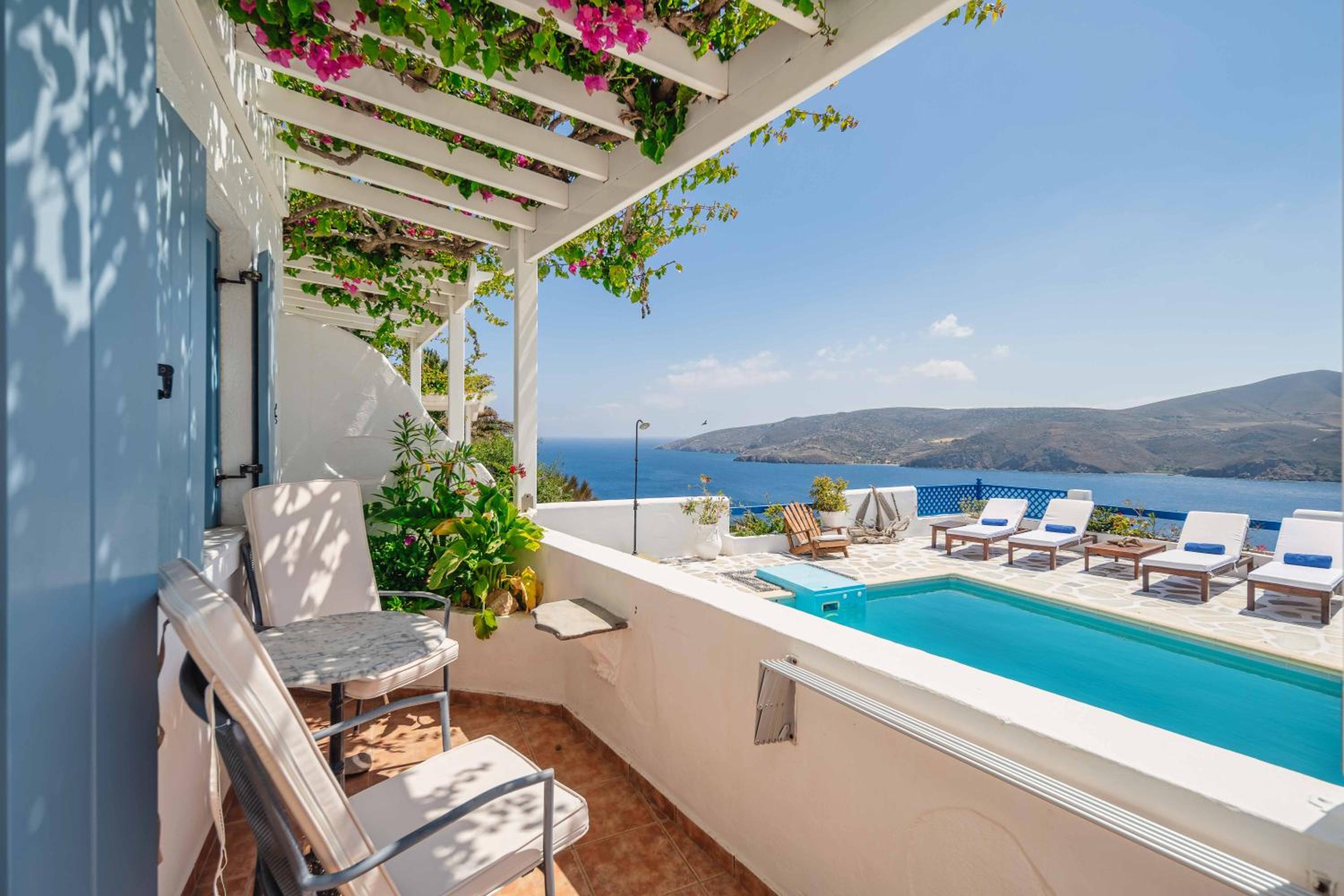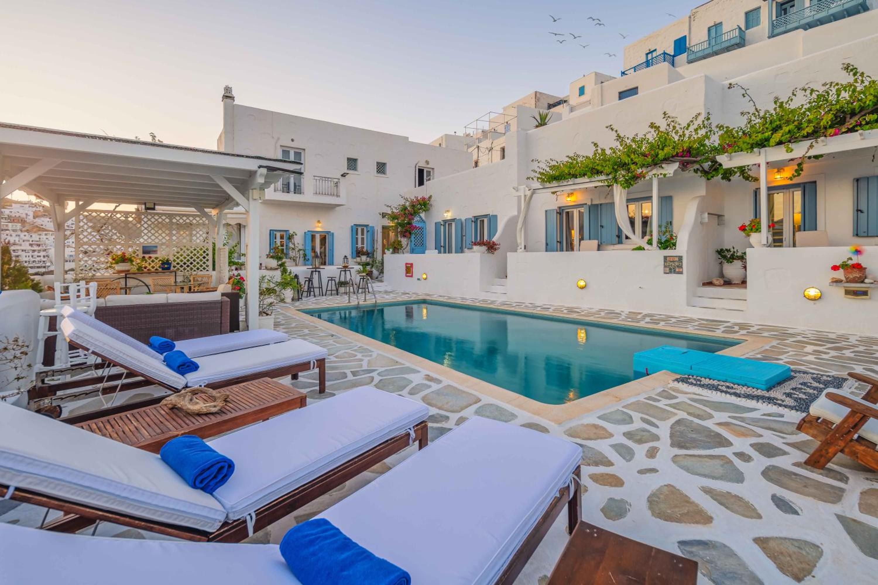 Charming boutique hotel with stunning sea views located in the heart of Chora. Beautiful courtyard/pool area with bougainvilleas. Good size room stylishly decorated. Stable WiFi. Continental breakfast included in the room rate. Some minor maintenance issues (ceiling fan, AC) needed attention. Recommend!