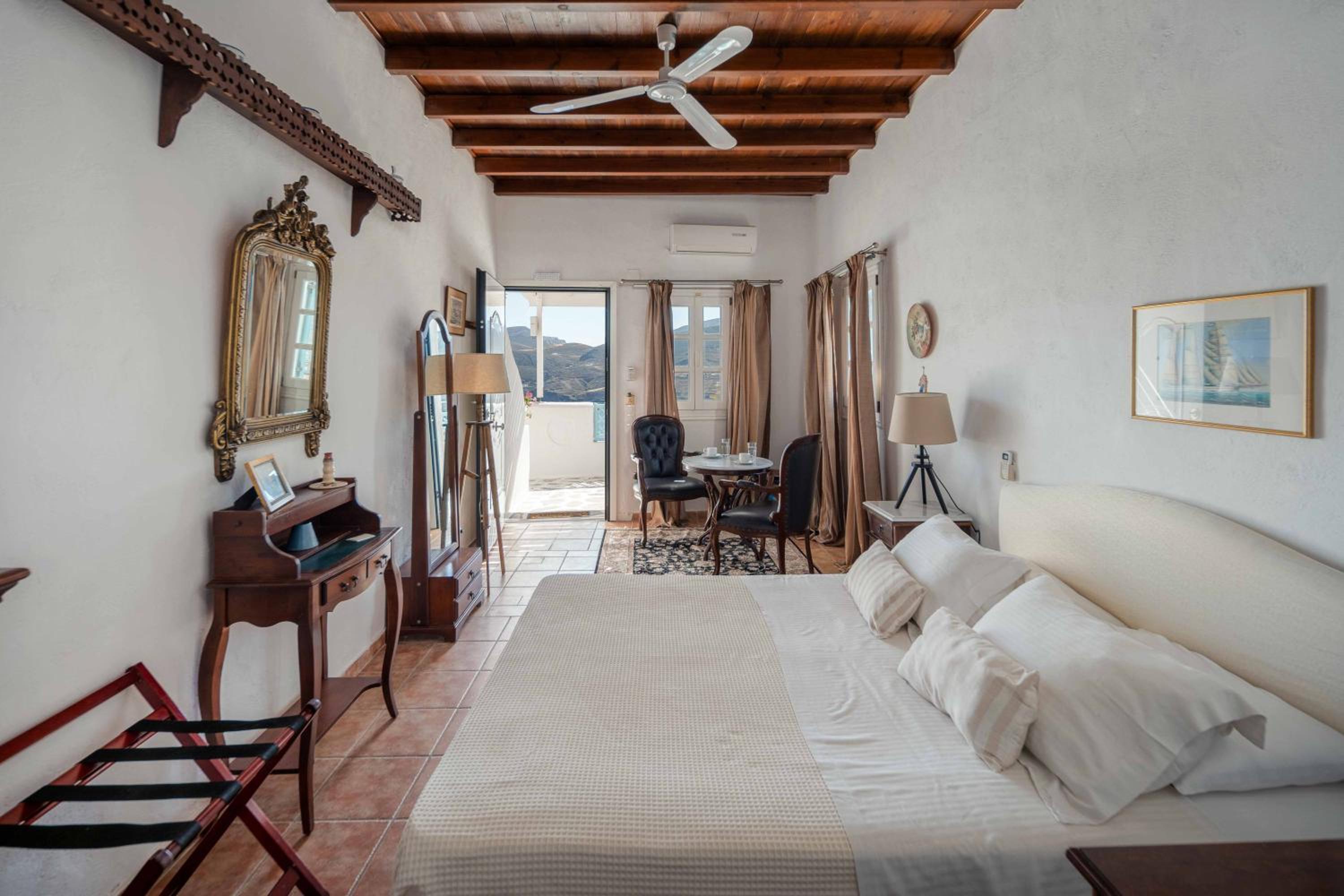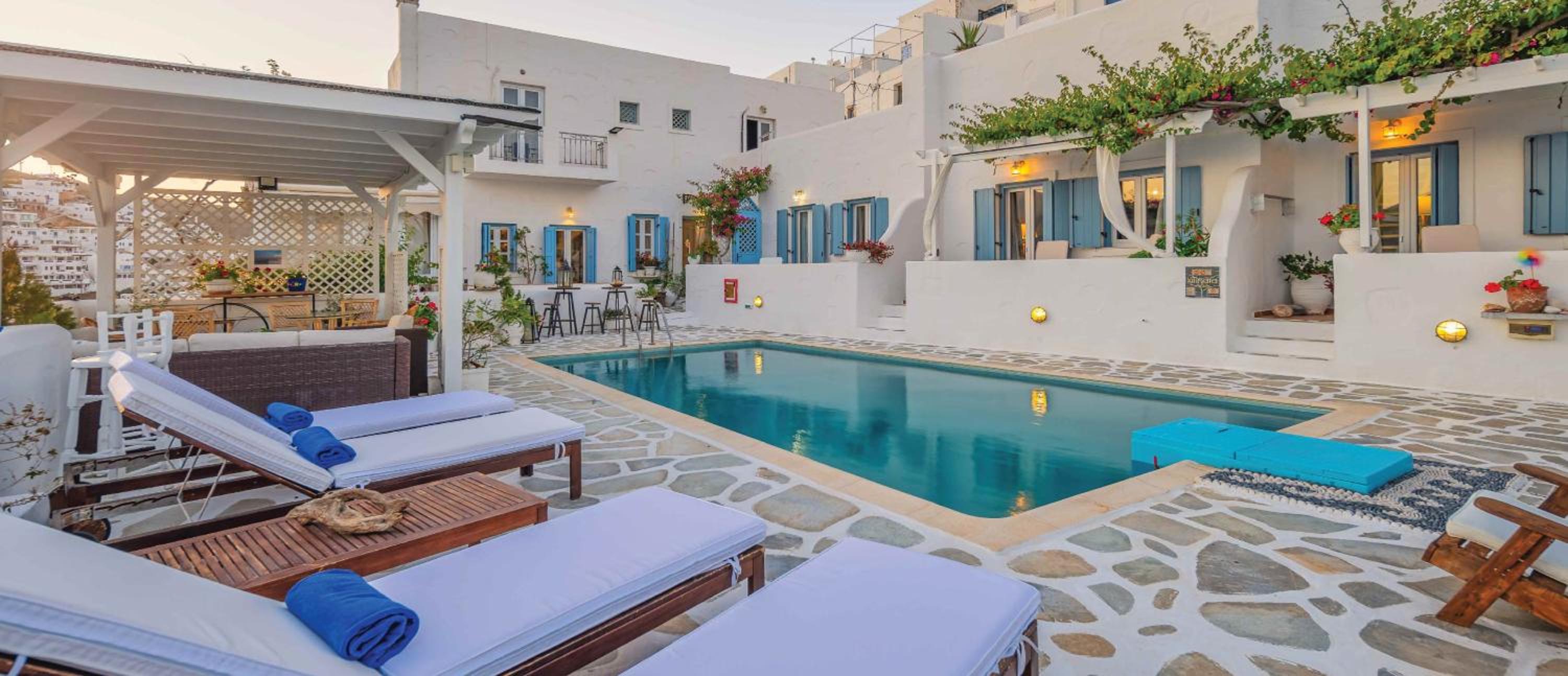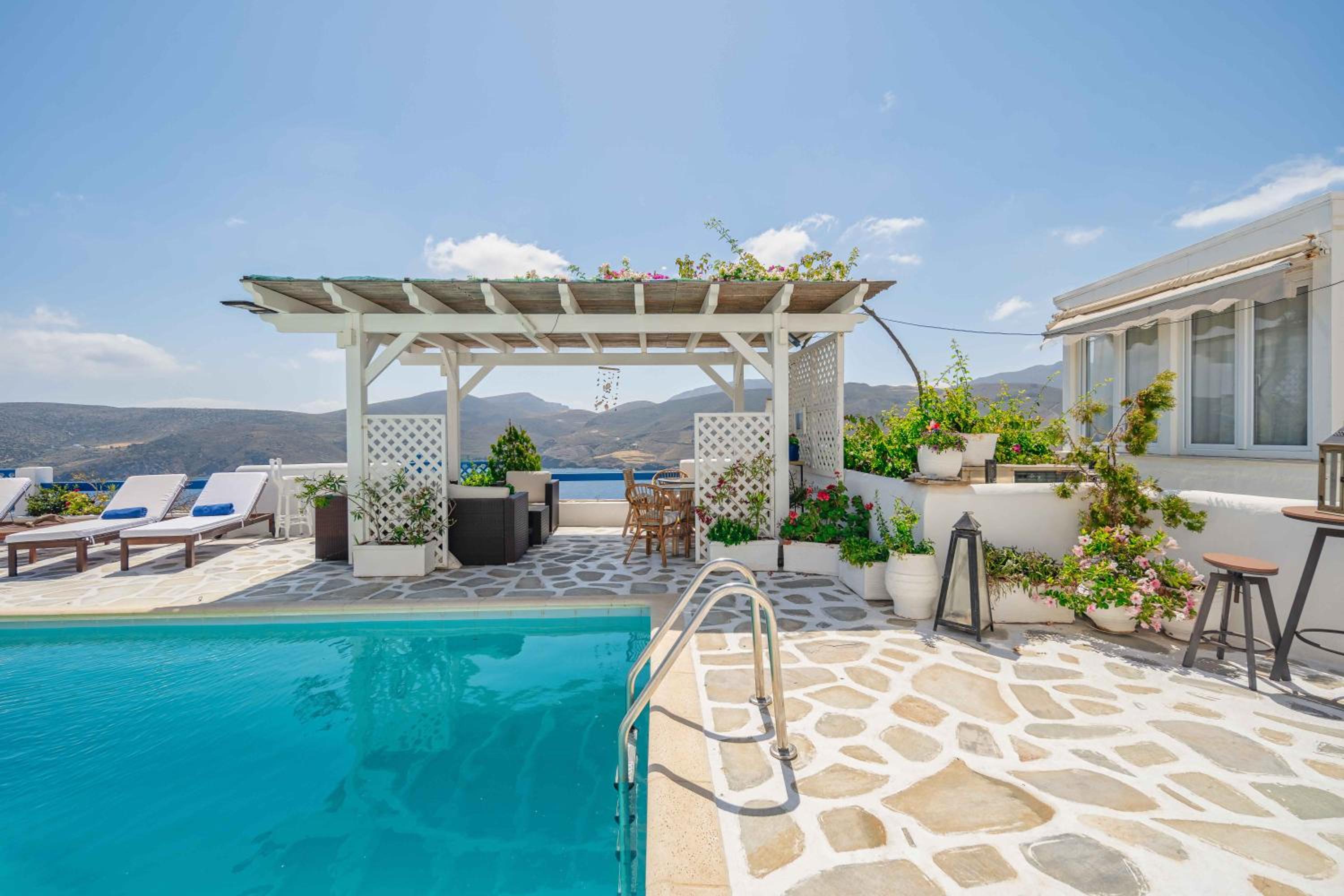 Charming boutique hotel with stunning sea views located in the heart of Chora. Beautiful courtyard/pool area with bougainvilleas. Good size room stylishly decorated. Stable WiFi. Continental breakfast included in the room rate. Some minor maintenance issues (ceiling fan, AC) needed attention. Recommend!