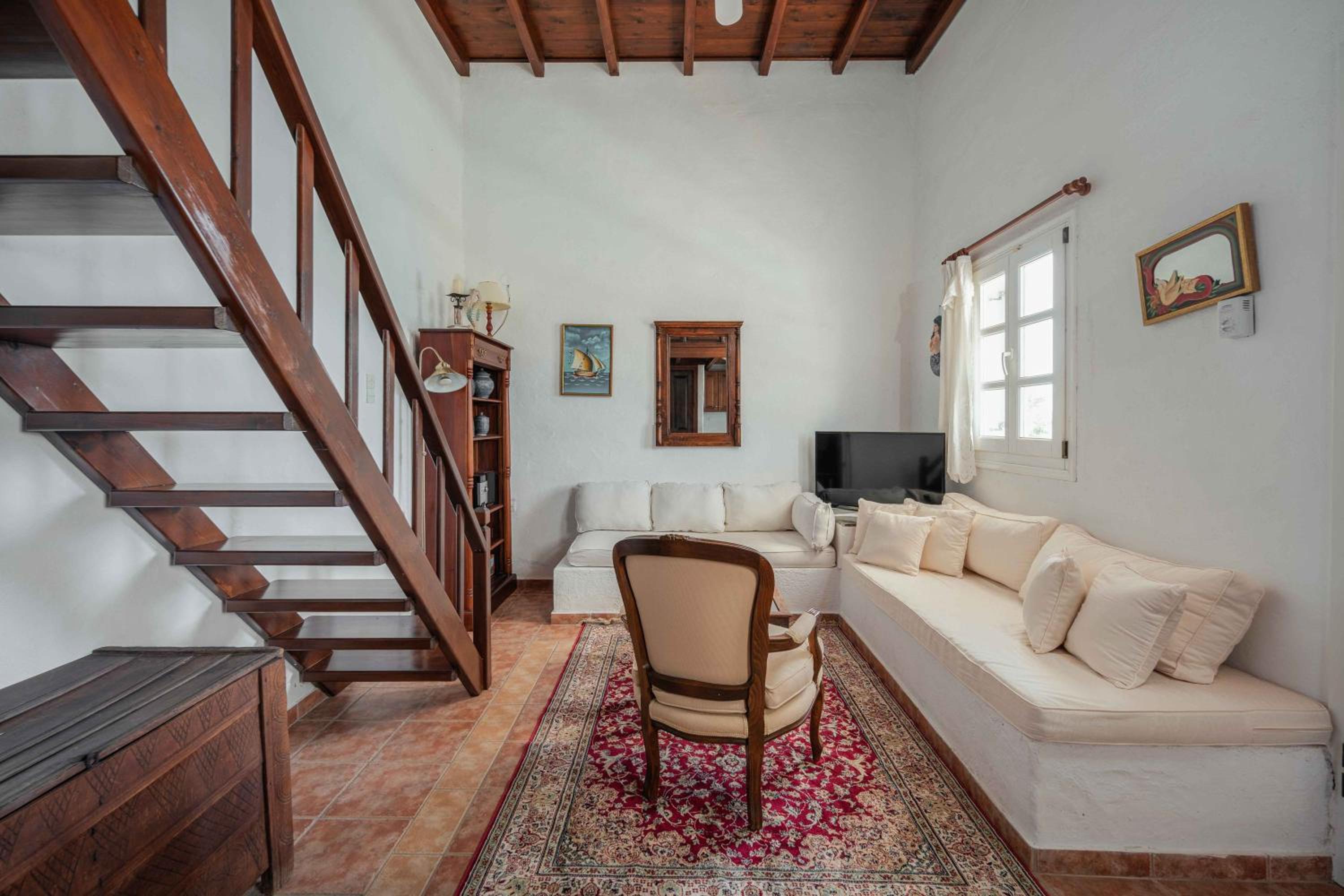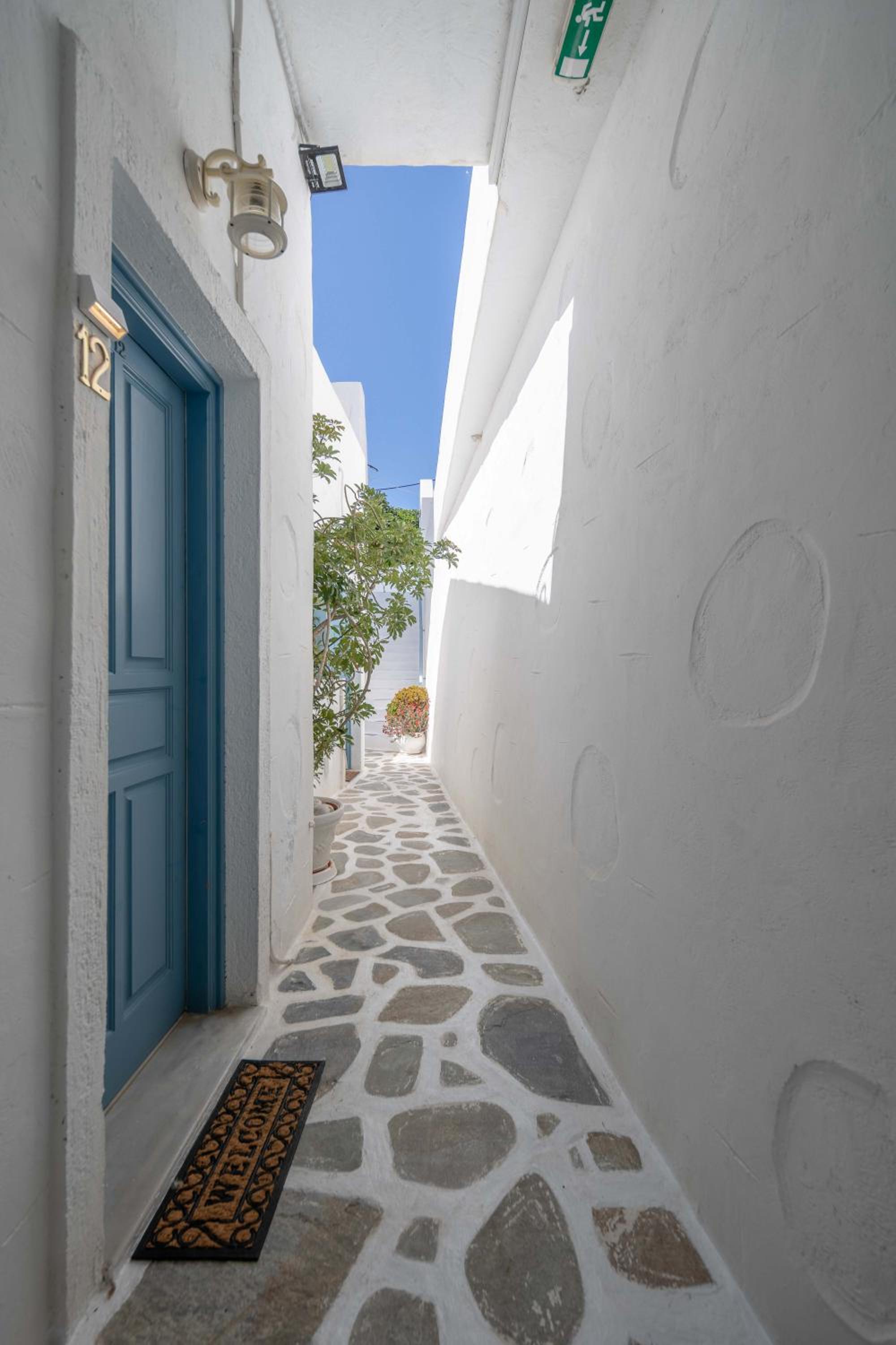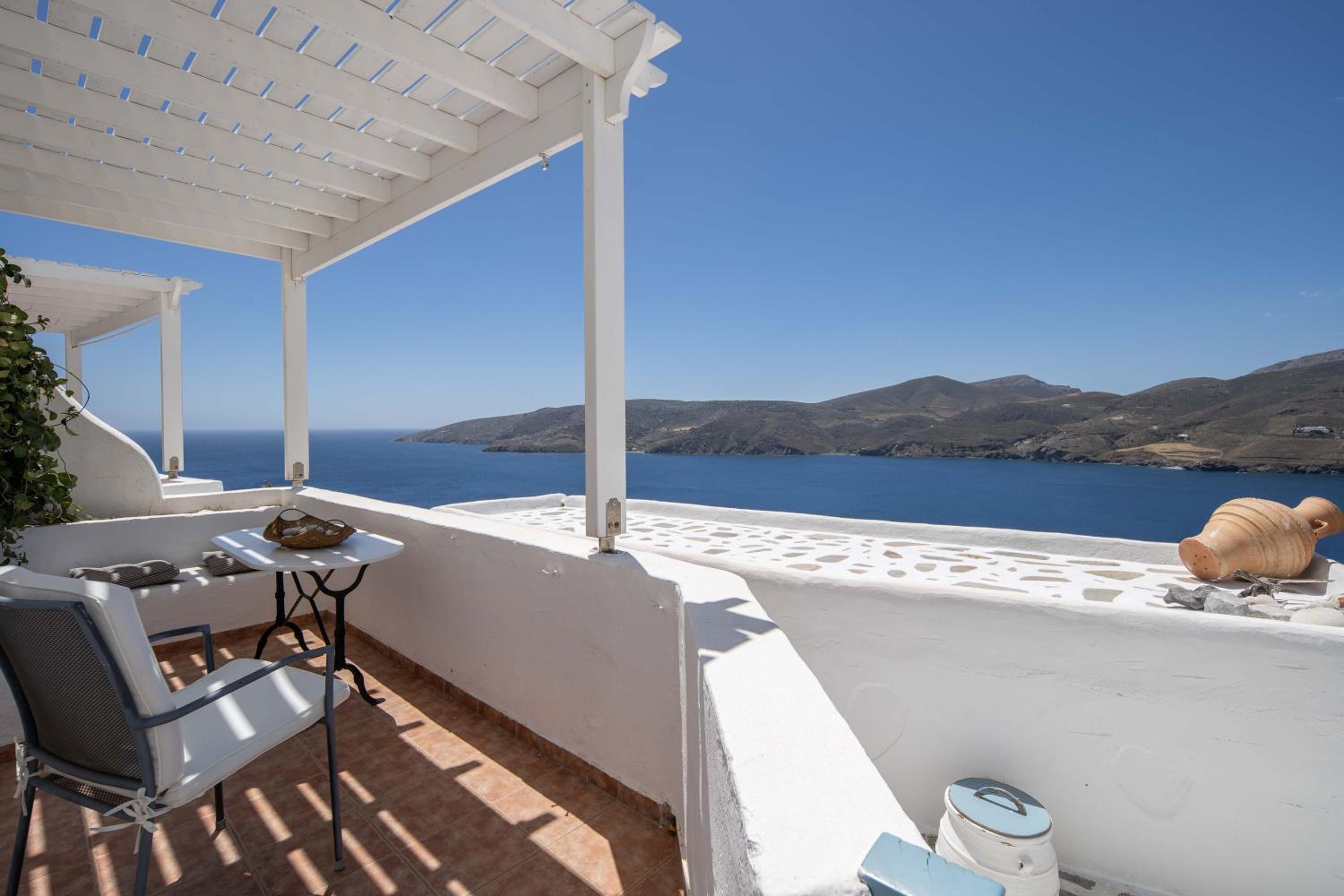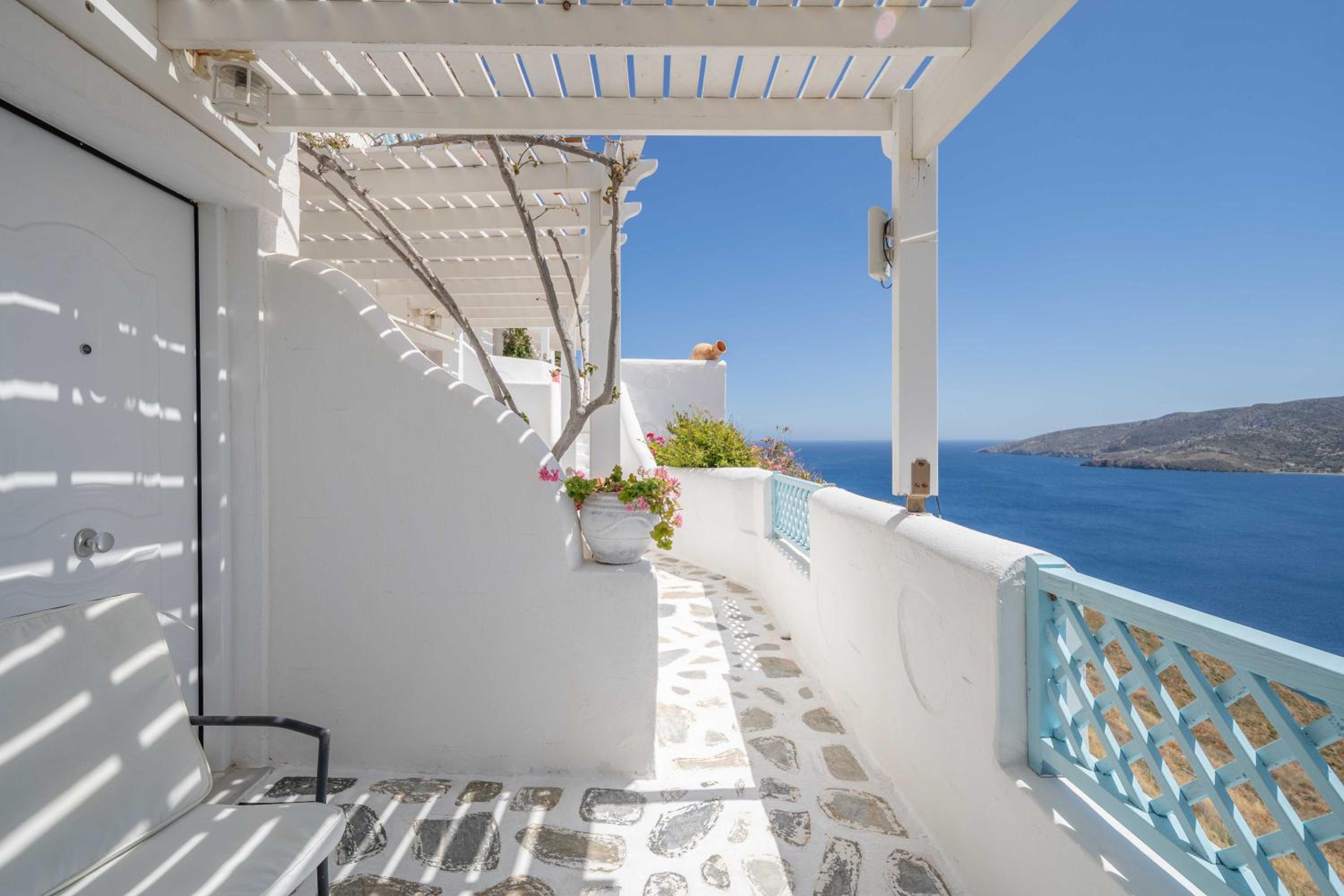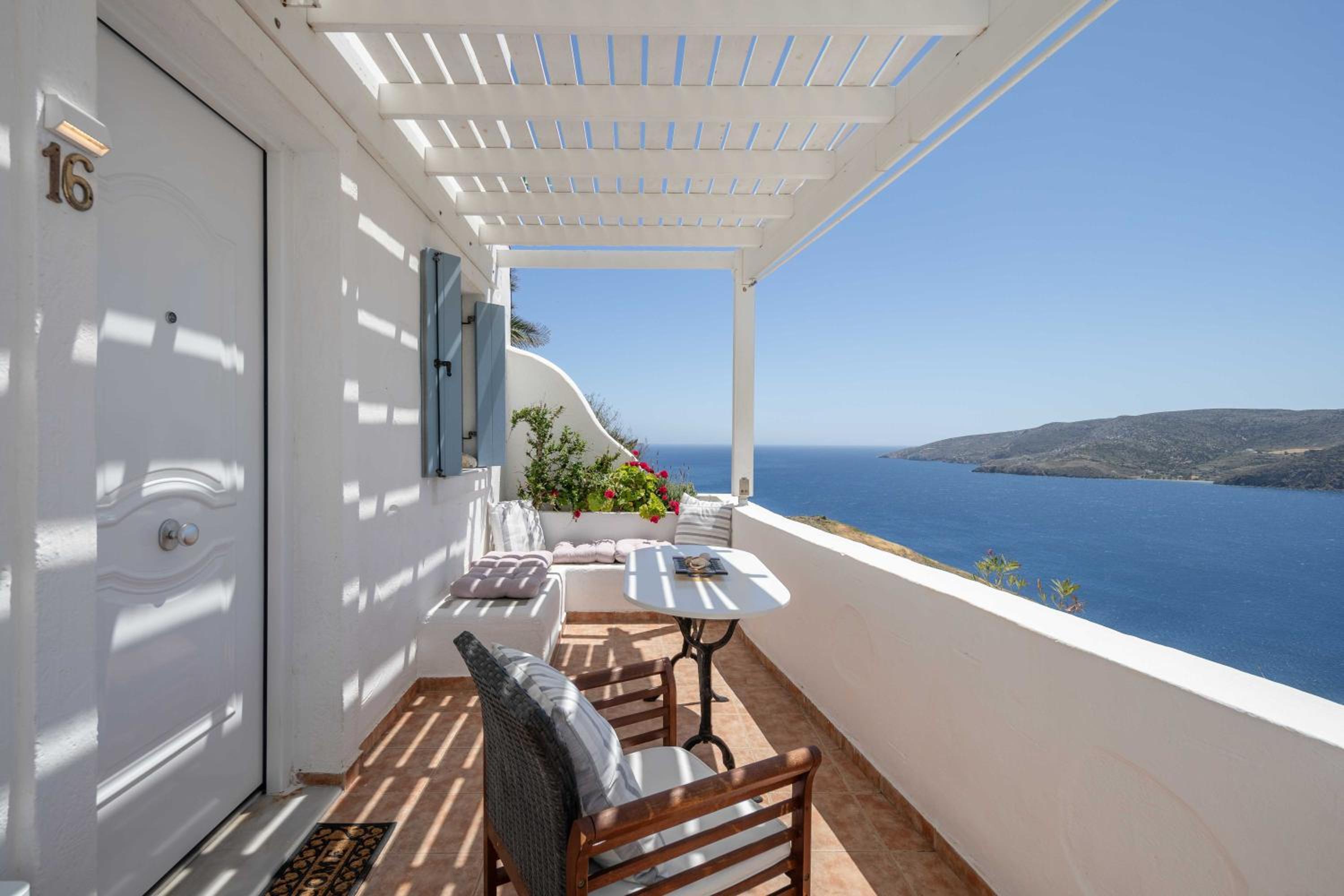 The view from our balcony was awesome. The room was very clean when we arrived and cleaned again everyday. Our host was very welcoming and sincere. Close enough to Chora to have access to restaurants and public transport. Very nice stay.