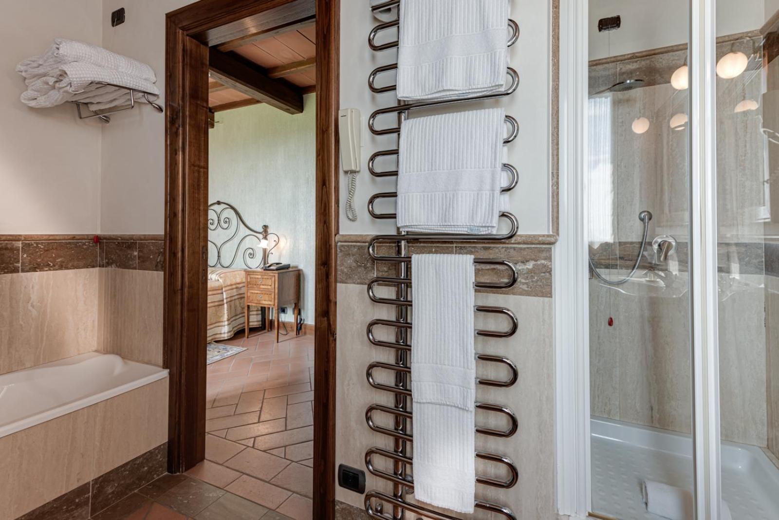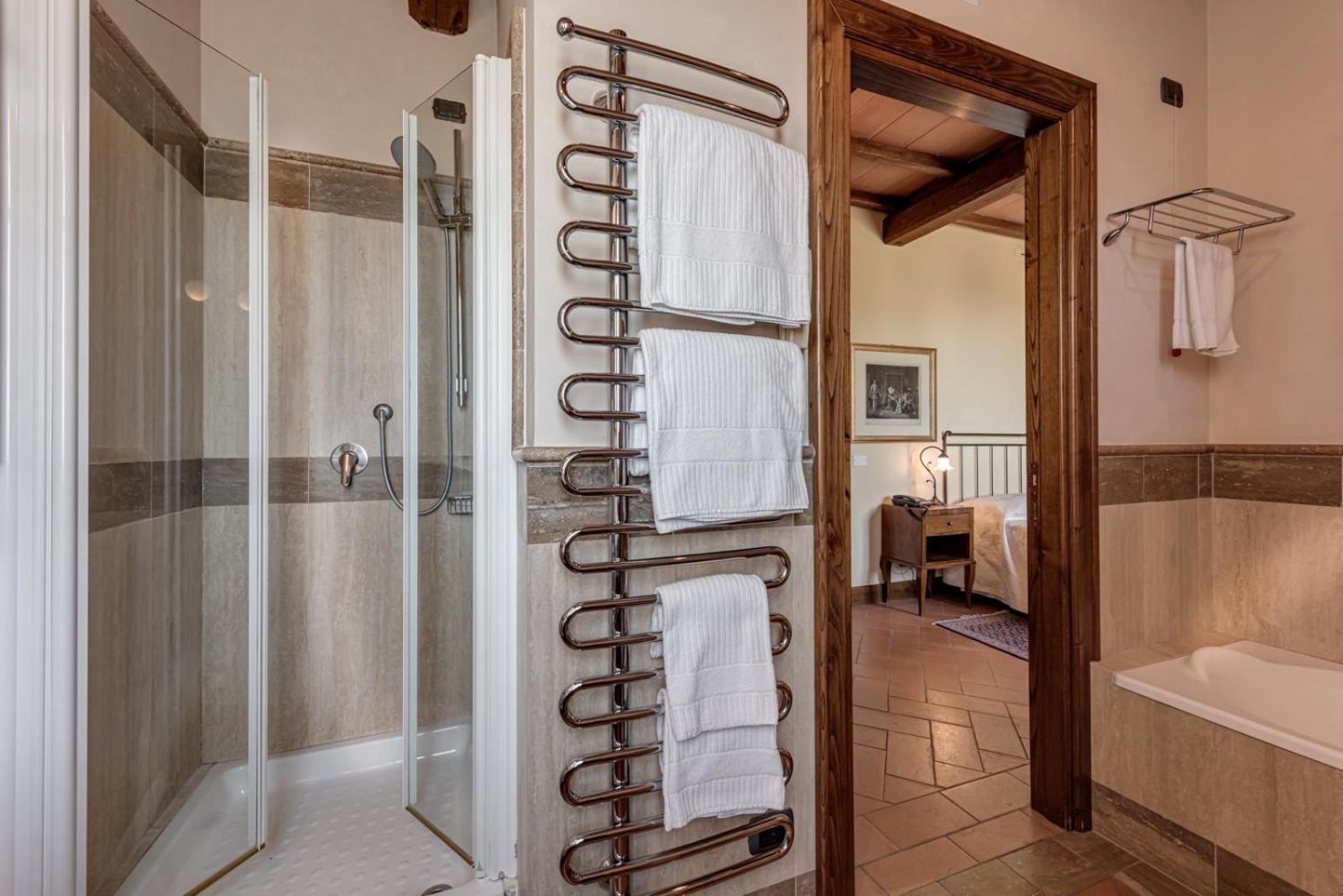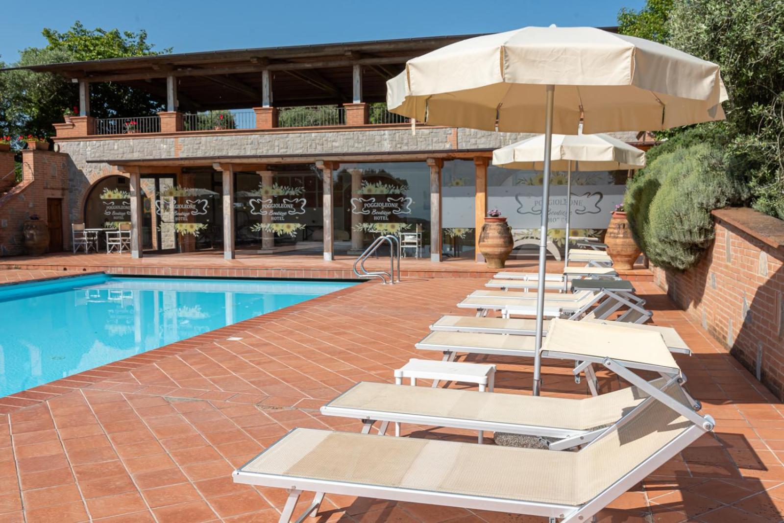 Each room at Poggioleone is a blend of comfort and style, equipped with air conditioning, LCD satellite TV, and a minibar.