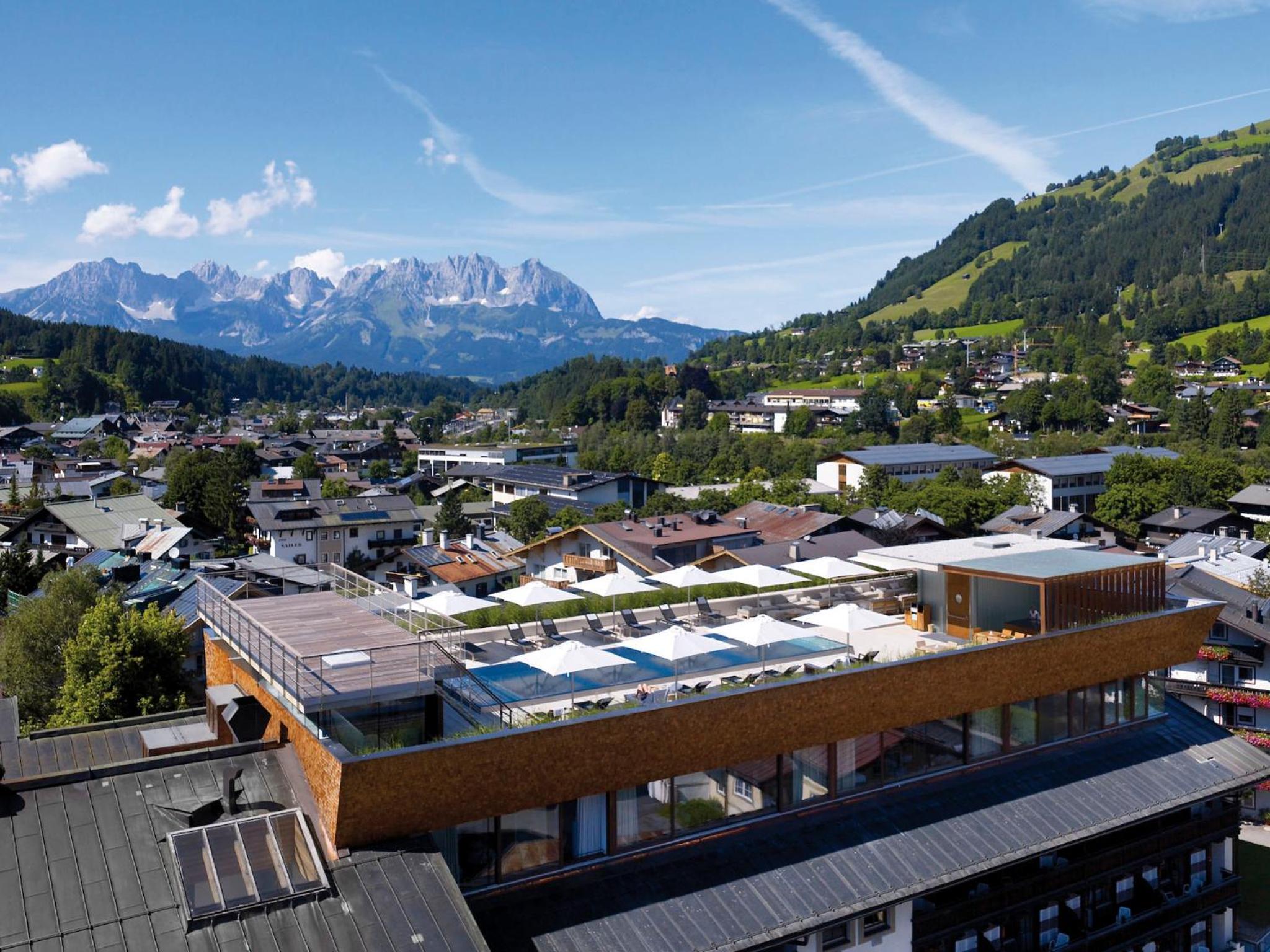Experience summer bliss at the Schwarzer Adler Kitzbühel - Adults Only with a refreshing outdoor pool on the roof terrace overlooking the majestic mountains.