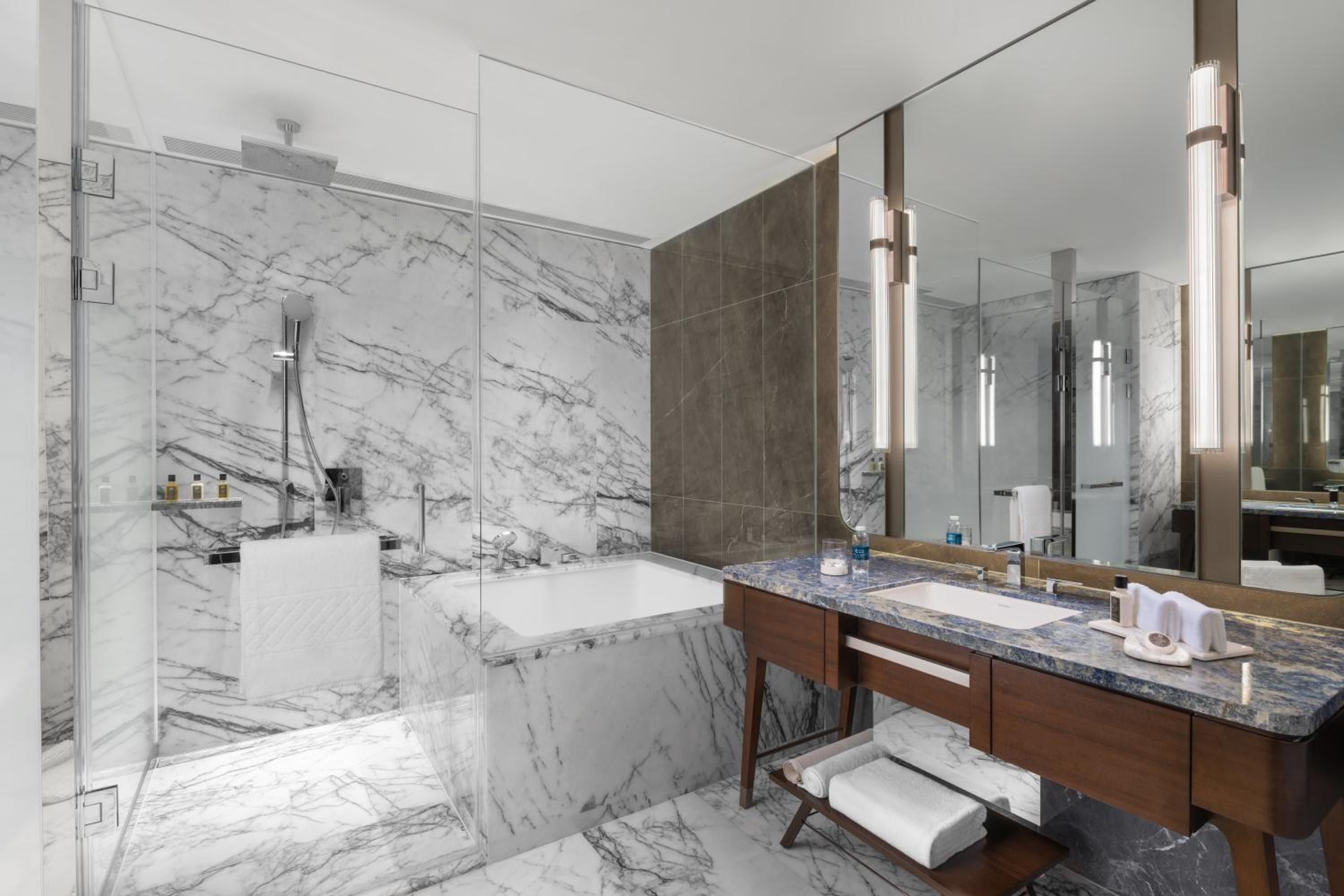 Nüwa at City of Dreams offers 300 guest rooms, including 33 villas, designed to provide an exclusive and refined experience. The rooms feature modern amenities such as a 42-inch flat-screen TV, iPod dock, and breathtaking views of Cotai through floor-to-ceiling windows. Guests can unwind in the deep soaking tub or separate rain shower in the en suite bathrooms, complete with complimentary bath amenities.