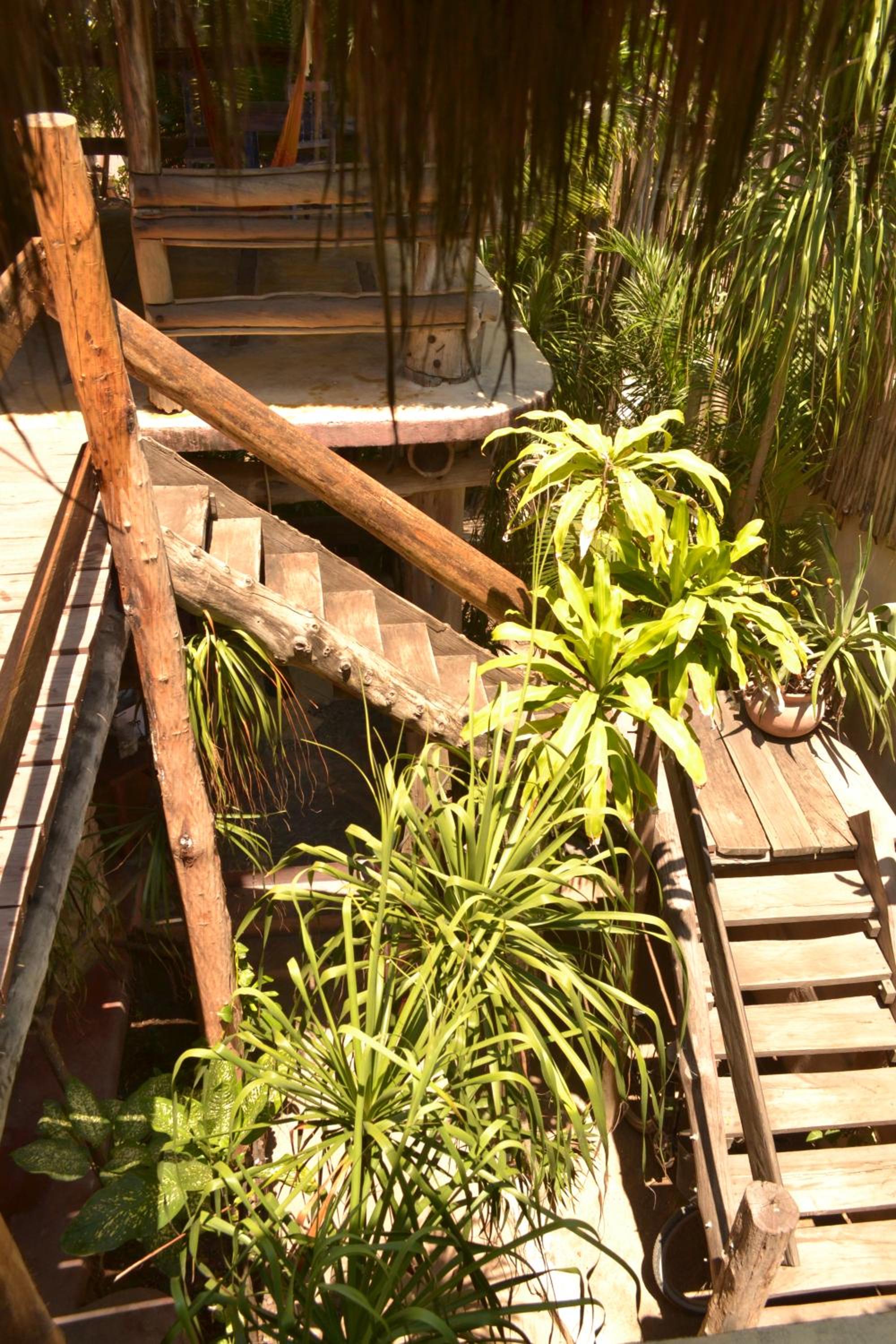 Acceso a la playa con mirador. La habitación y terrasa con hamaca.