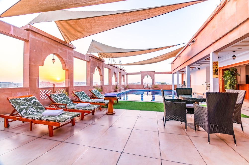 The Platinum is close (15 minutes) from the airport and located close to a busy roundabout and local shopping area. The hotel itself needs some redecoration. The rooms, the dining area are a bit dated. I thought the breakfast selection was weird, ( cheese pizzas ) but I guess some people like it. Disappointed with the gym, old equipment and no air-con. The rooftop pool is pretty cool though with great views to the city. 30 minutes from the Murtah Souk.