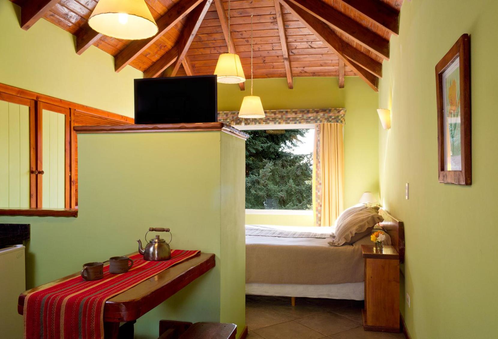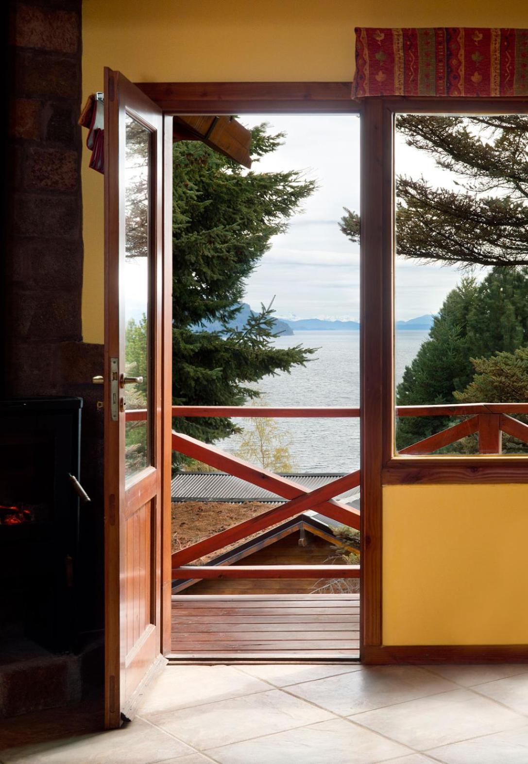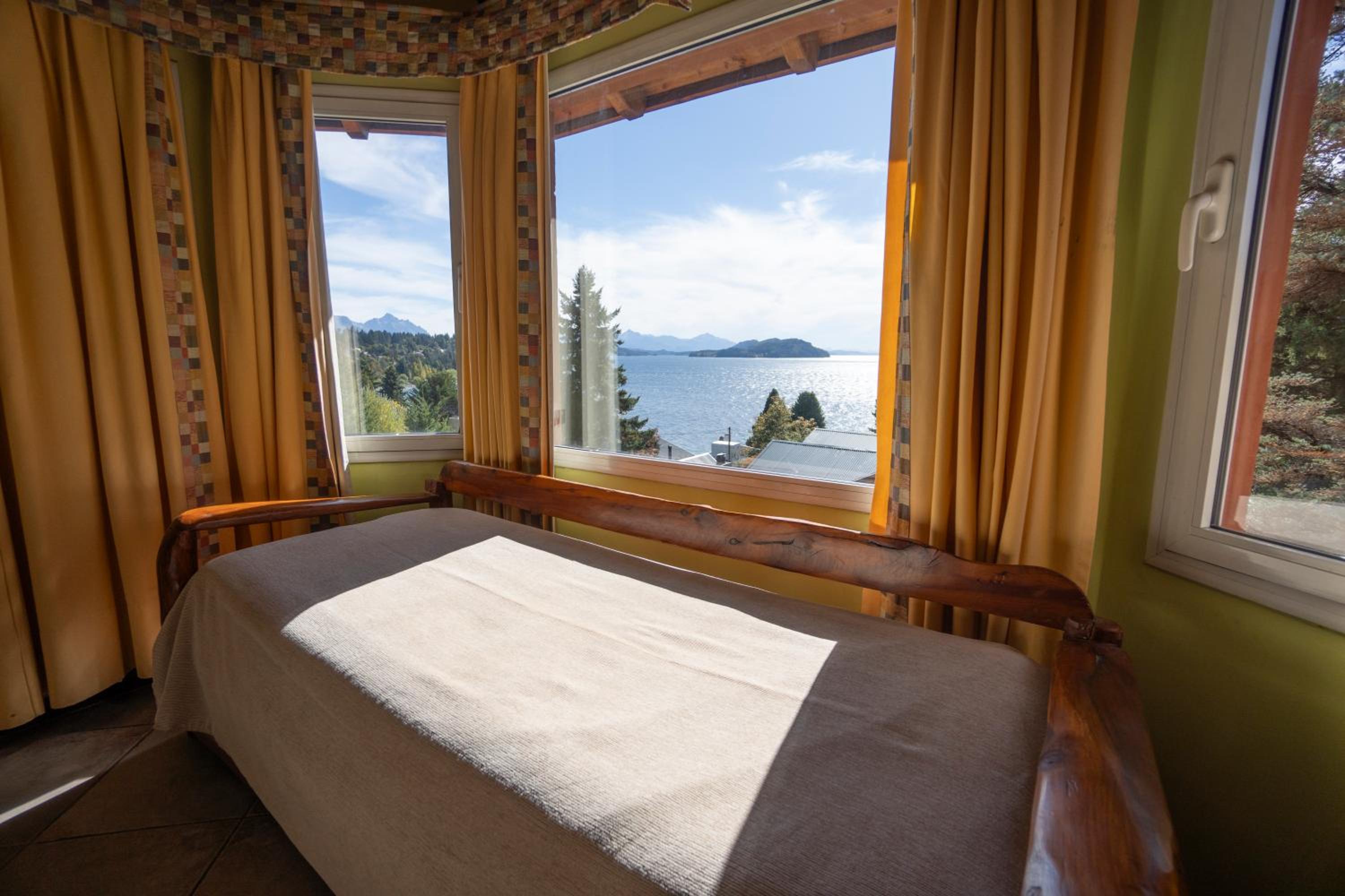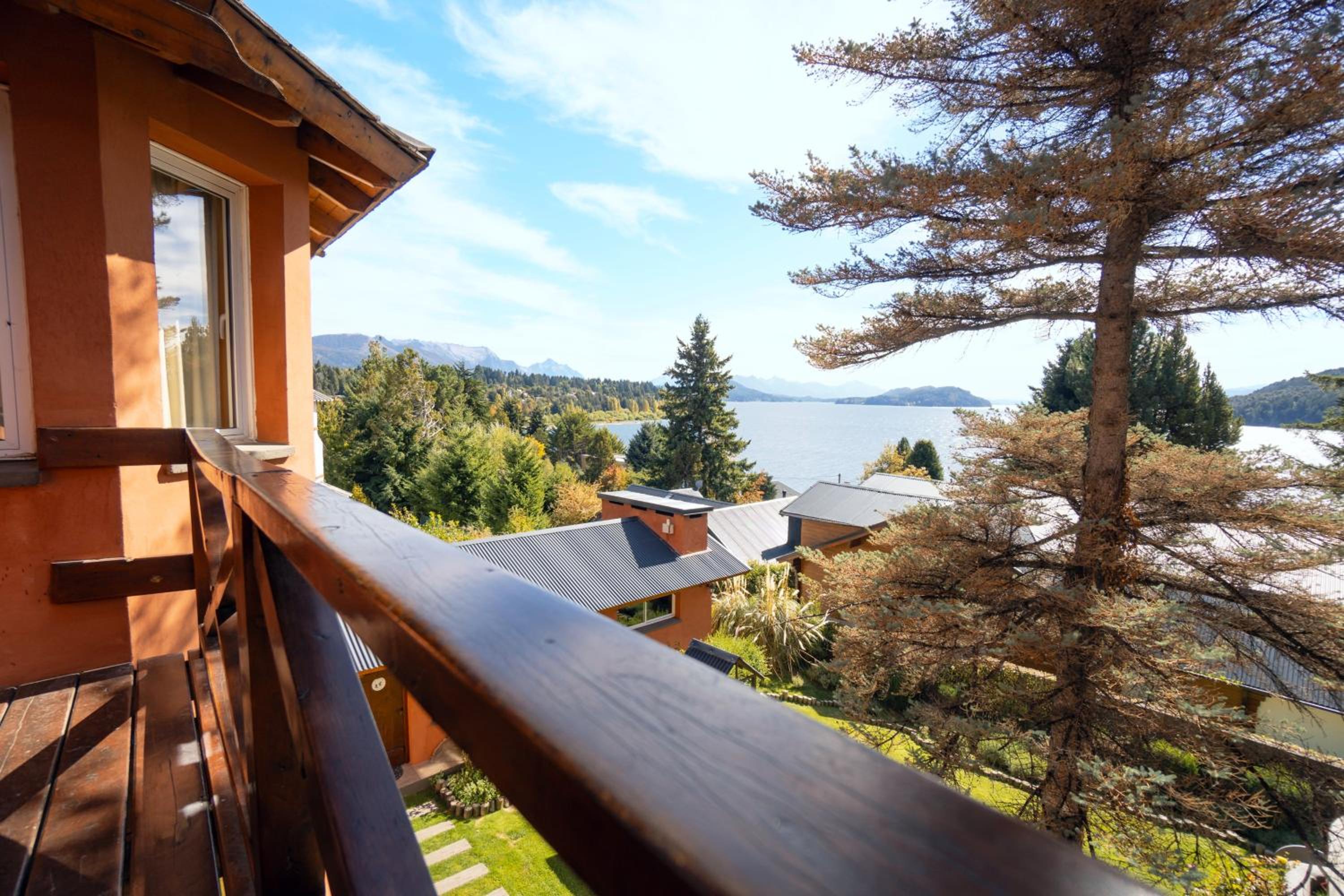 Charming Rustic Bungalows: Enjoy the cozy atmosphere of wooden rustic furniture and the convenience of self-catering facilities in our bungalows, each with a private balcony overlooking Nahual Huapi Lake.