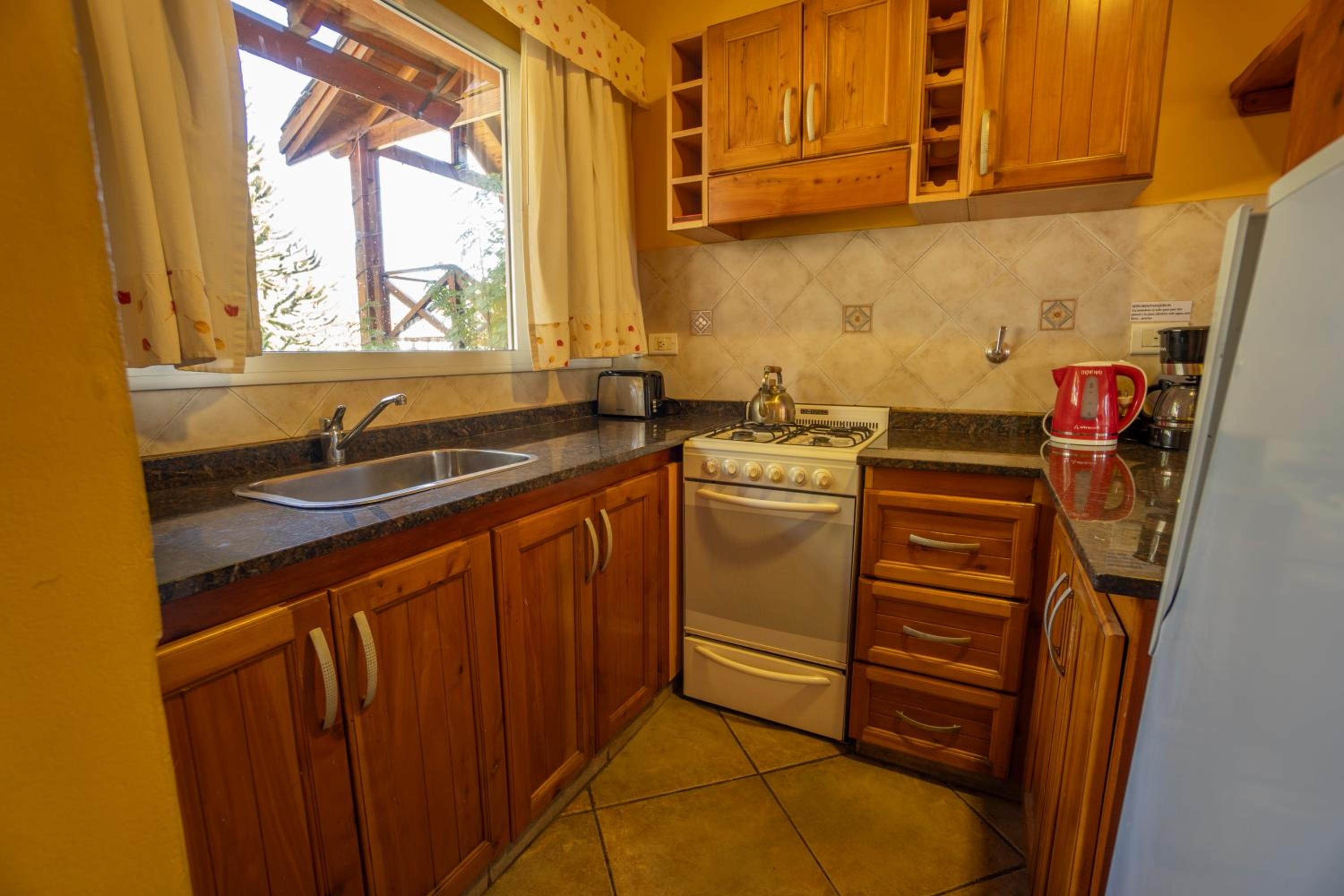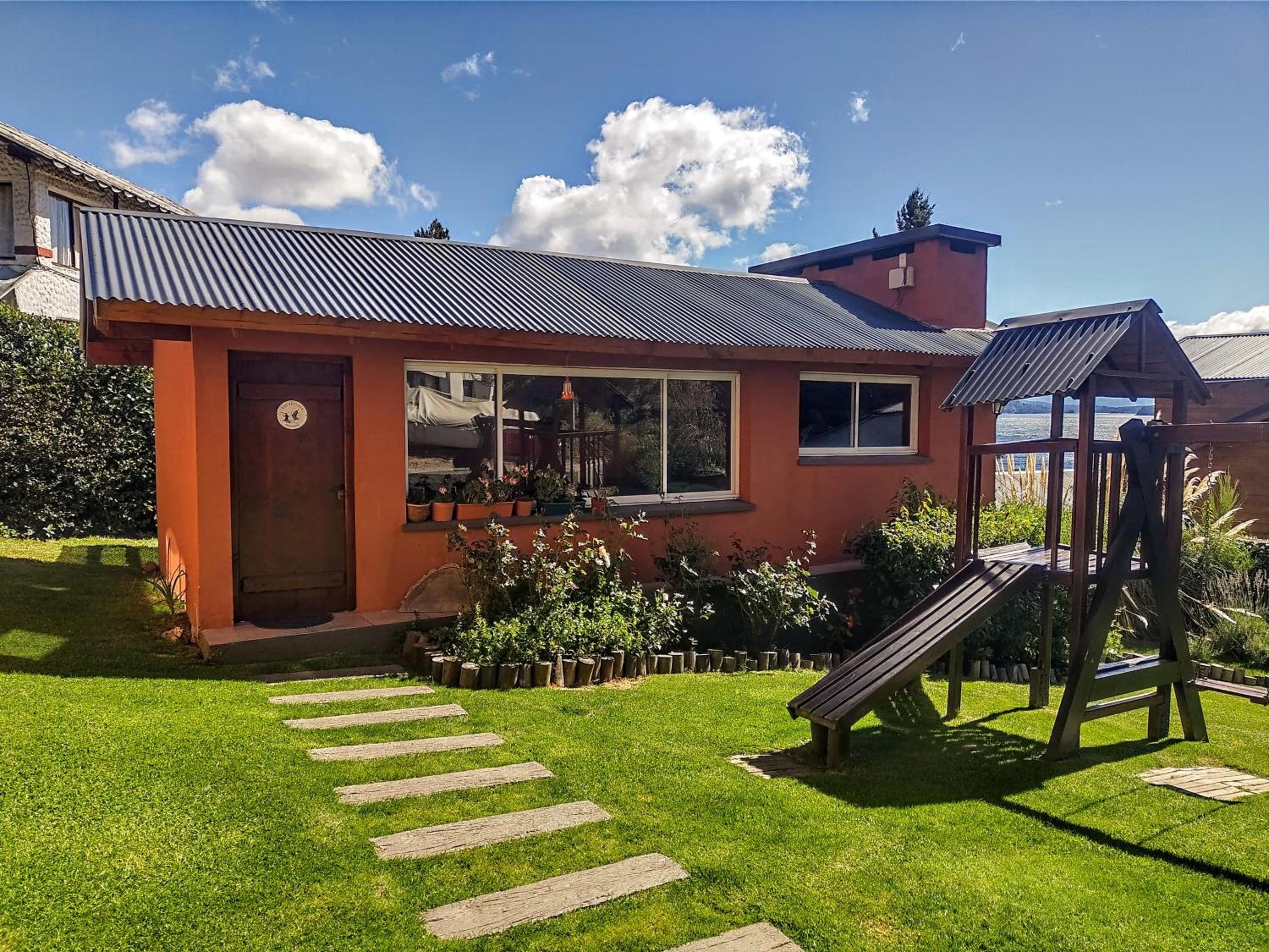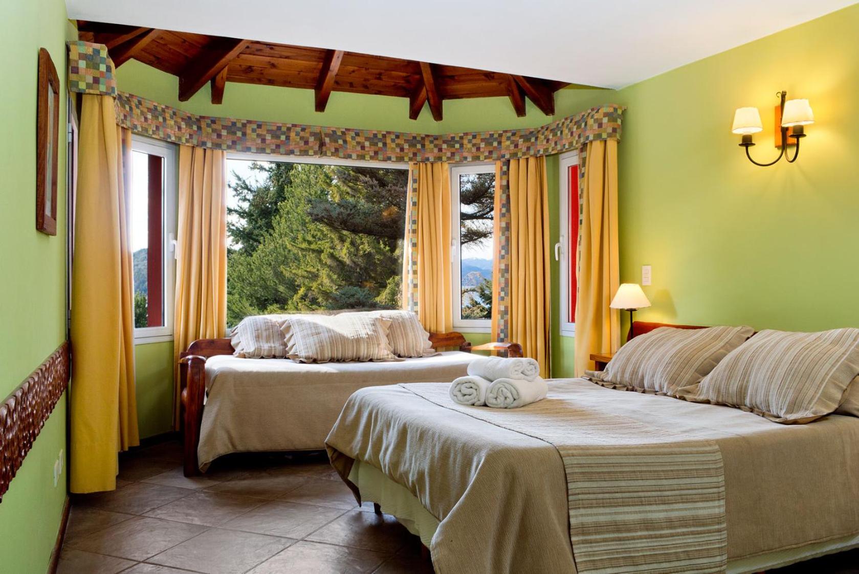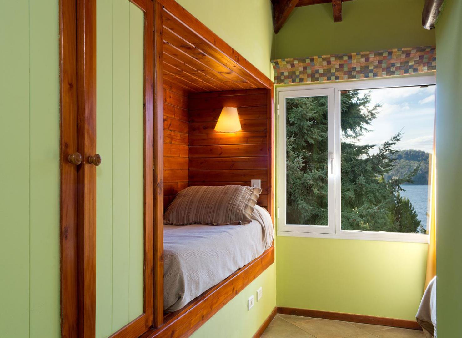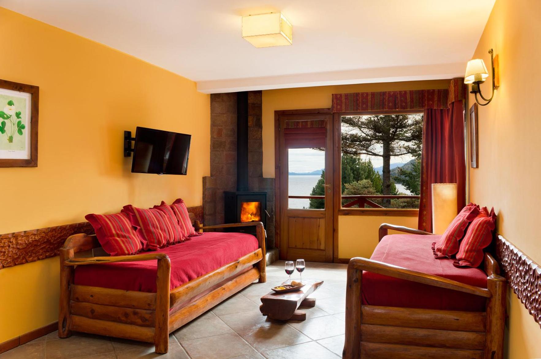 Charming Rustic Bungalows: Enjoy the cozy atmosphere of wooden rustic furniture and the convenience of self-catering facilities in our bungalows, each with a private balcony overlooking Nahual Huapi Lake.