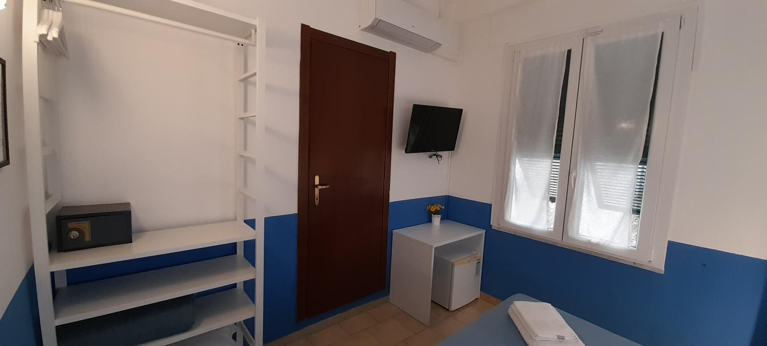 Room was small and blue and white but ok for 1 night. Nowhere to store luggage just next to wall although they did do this.G