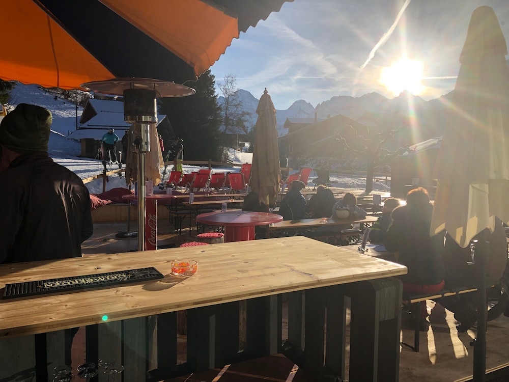 Prima locatie, vlak naast de piste ('s ochtends skien naar de lift, 's avonds terug naar het hotel). Goed ontbijtbuffet met voldoende keuze. Het hotel is stijlvol maar wel oud en een beetje gehorig. Wij hadden een vrij kleine 2persoons kamer die net ruim genoeg was door een praktischs inrichting, met balkon en uitzicht op de bergen, en met een nogal krakende vloer (niet handig als je 's nachts naar de wc moet).