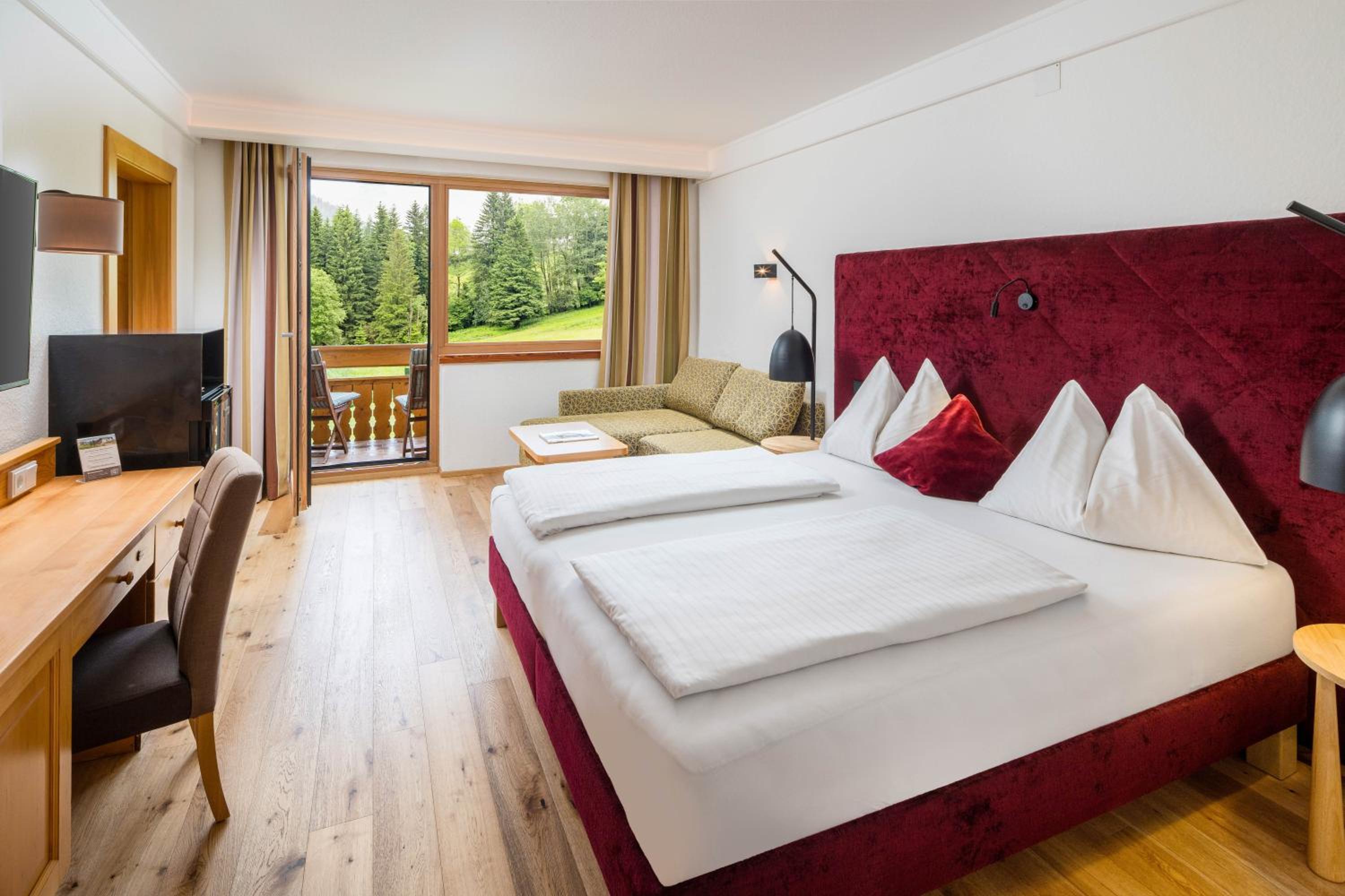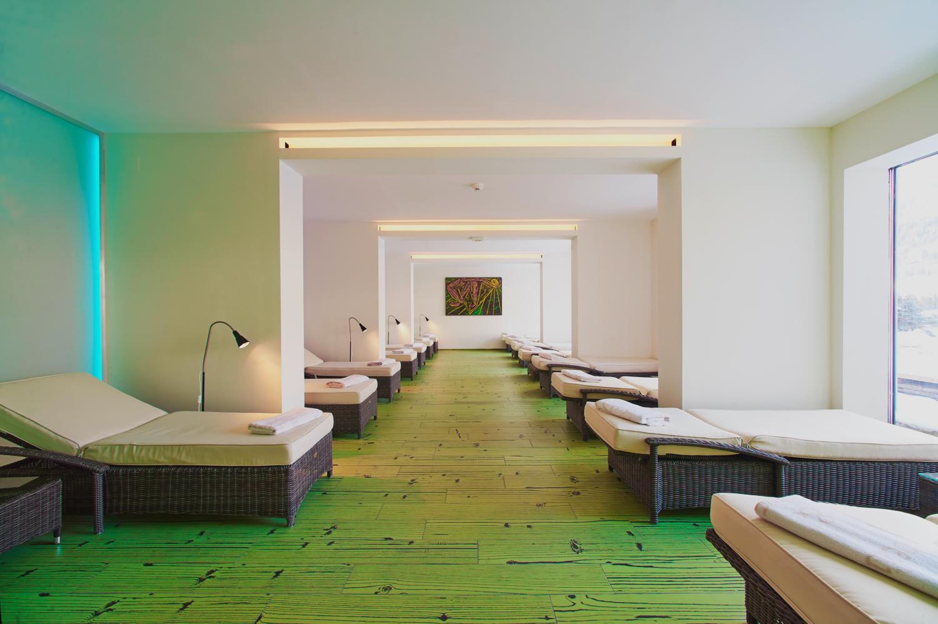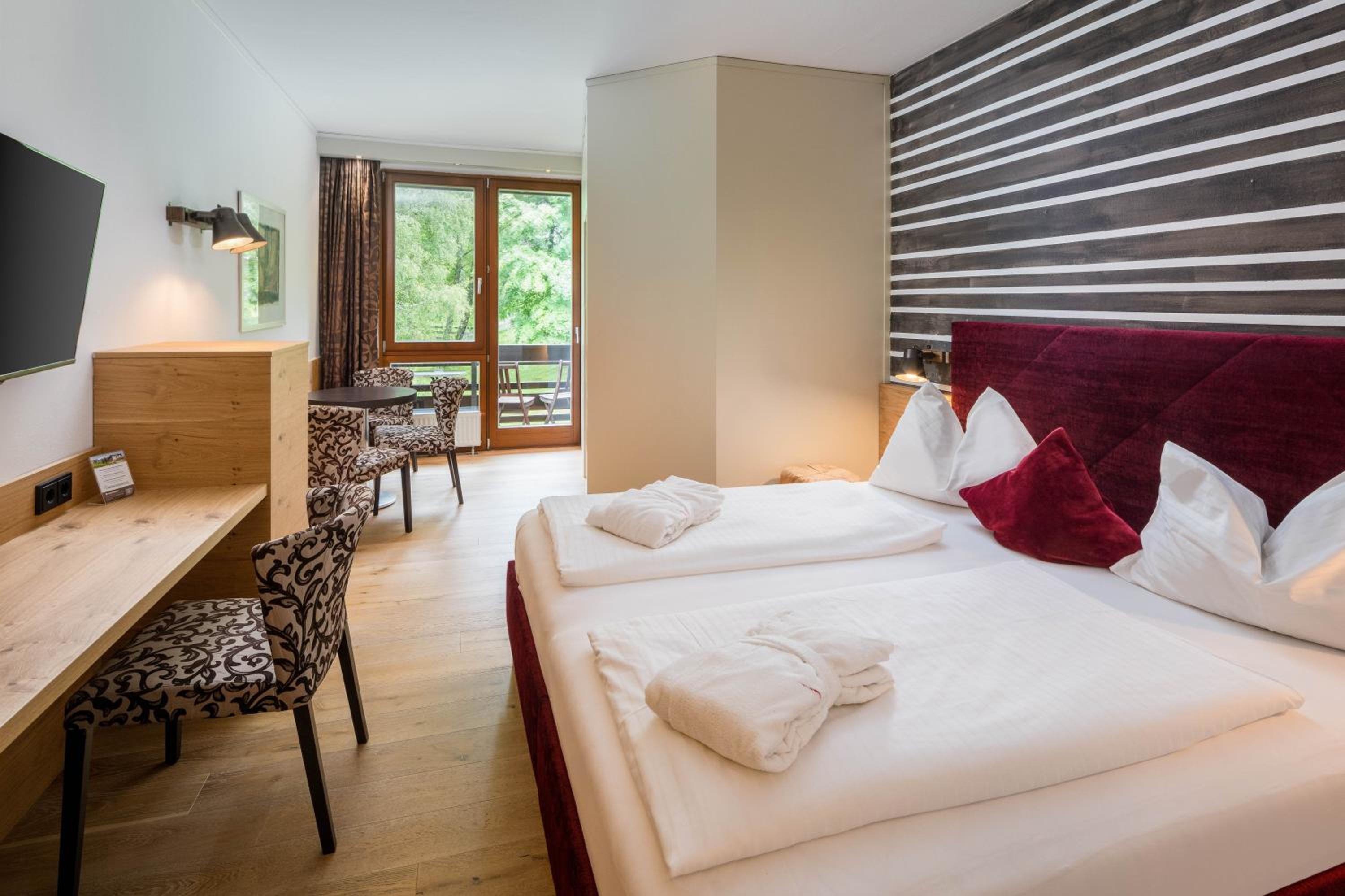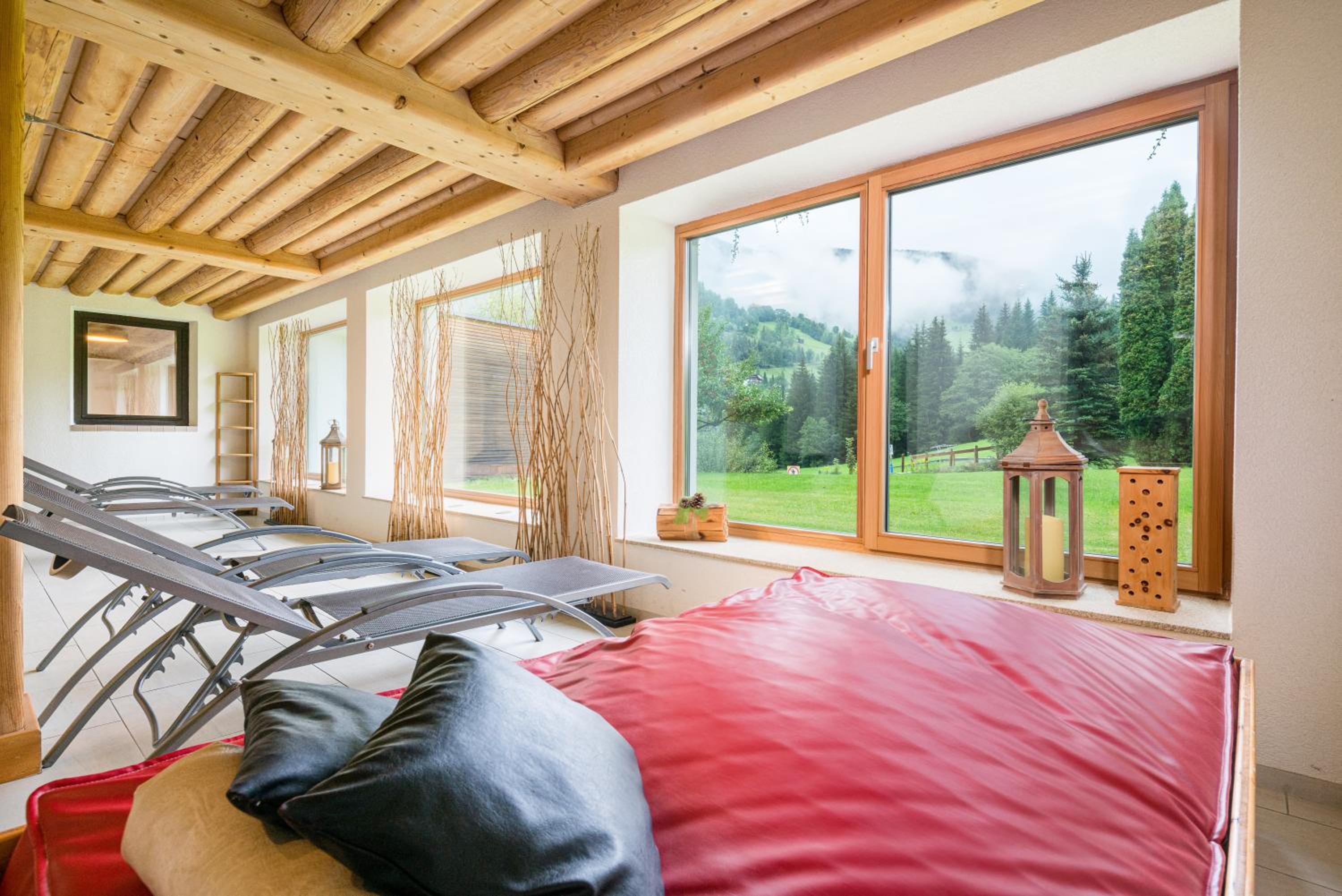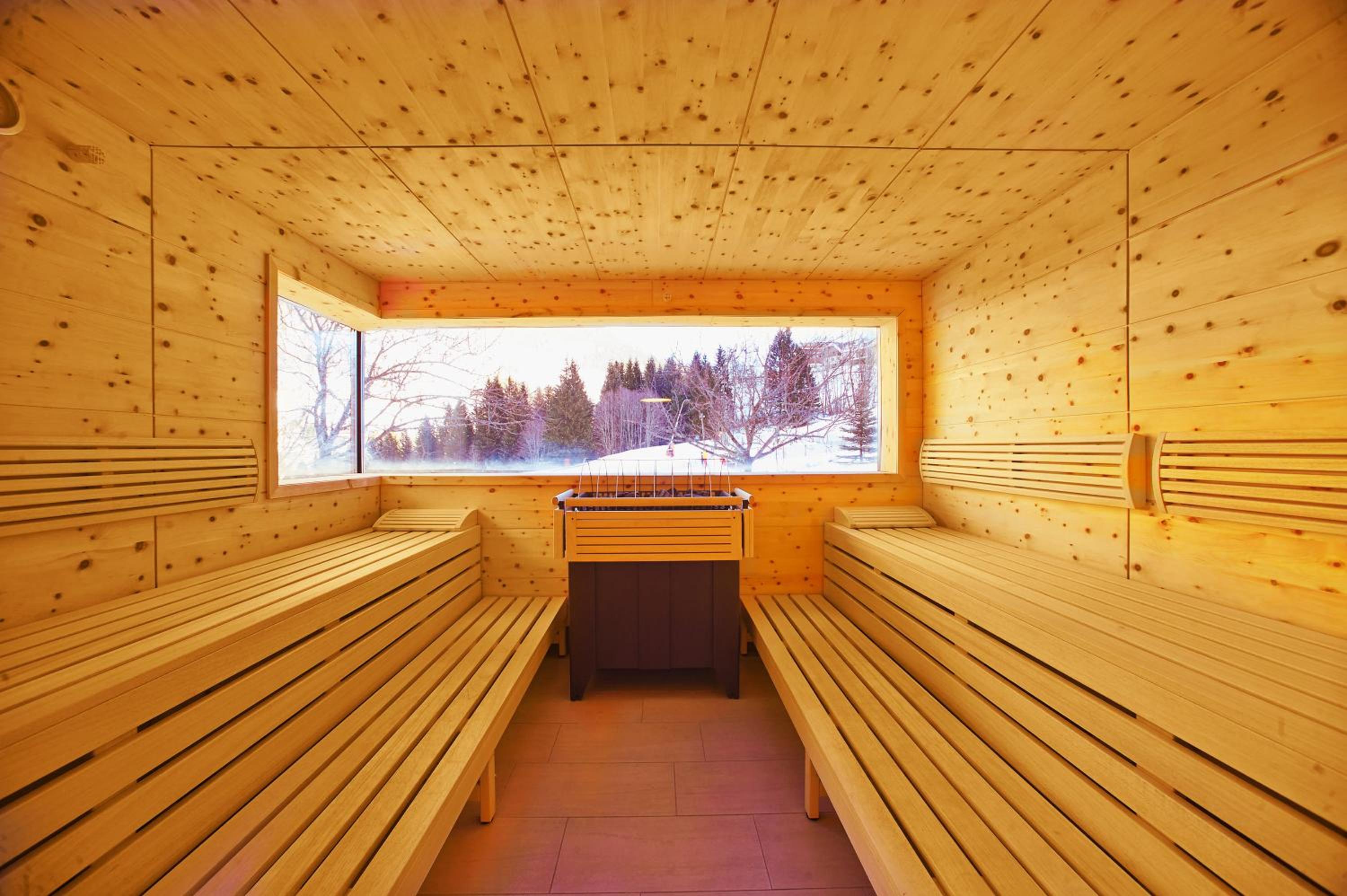 Relax in the modern spa area with an indoor pool, hot tub, steam bath, and saunas boasting panoramic views. Explore nearby attractions like the tennis centre, village centre, and thermal spa, with hiking trails starting right behind the hotel.