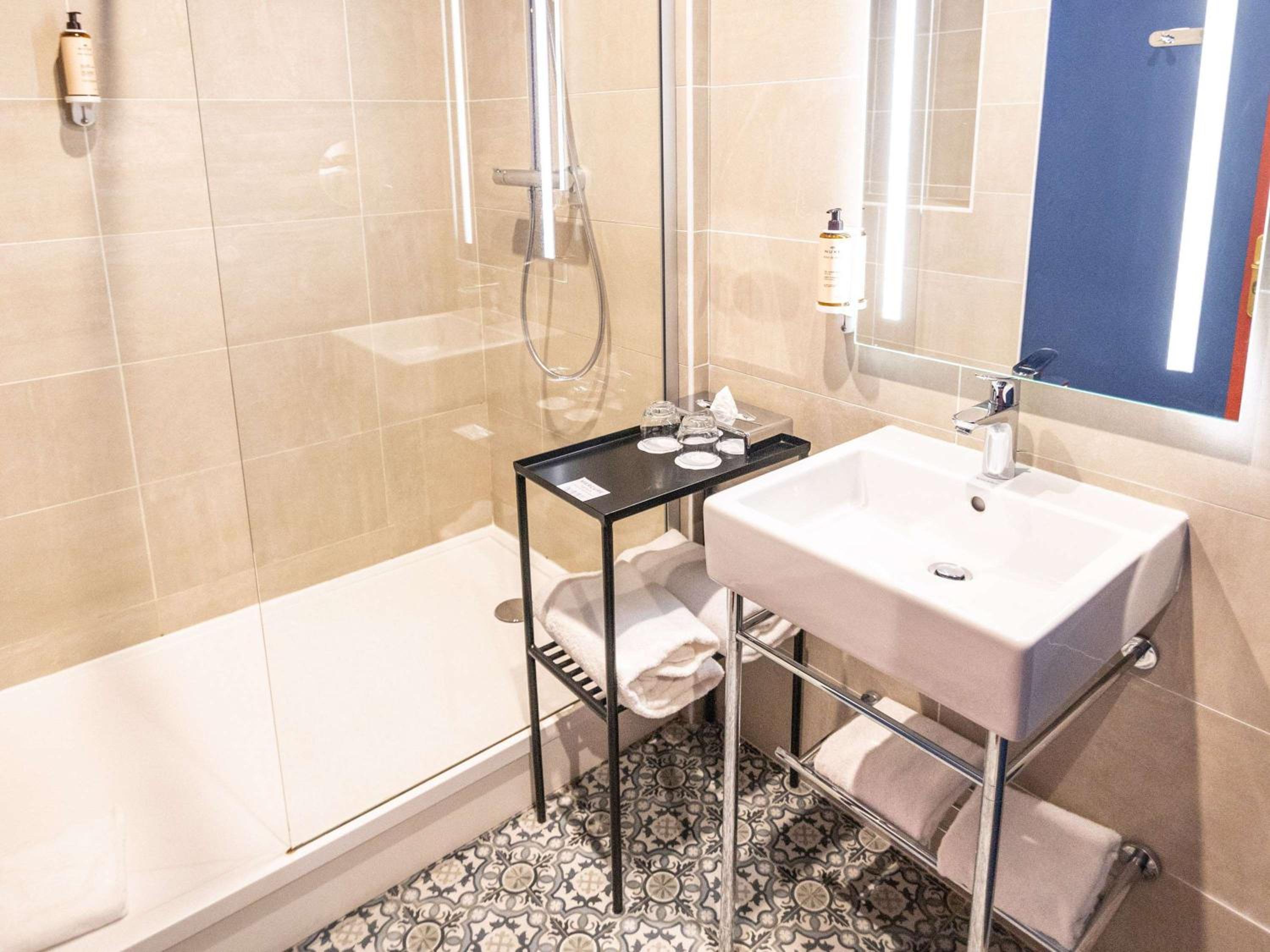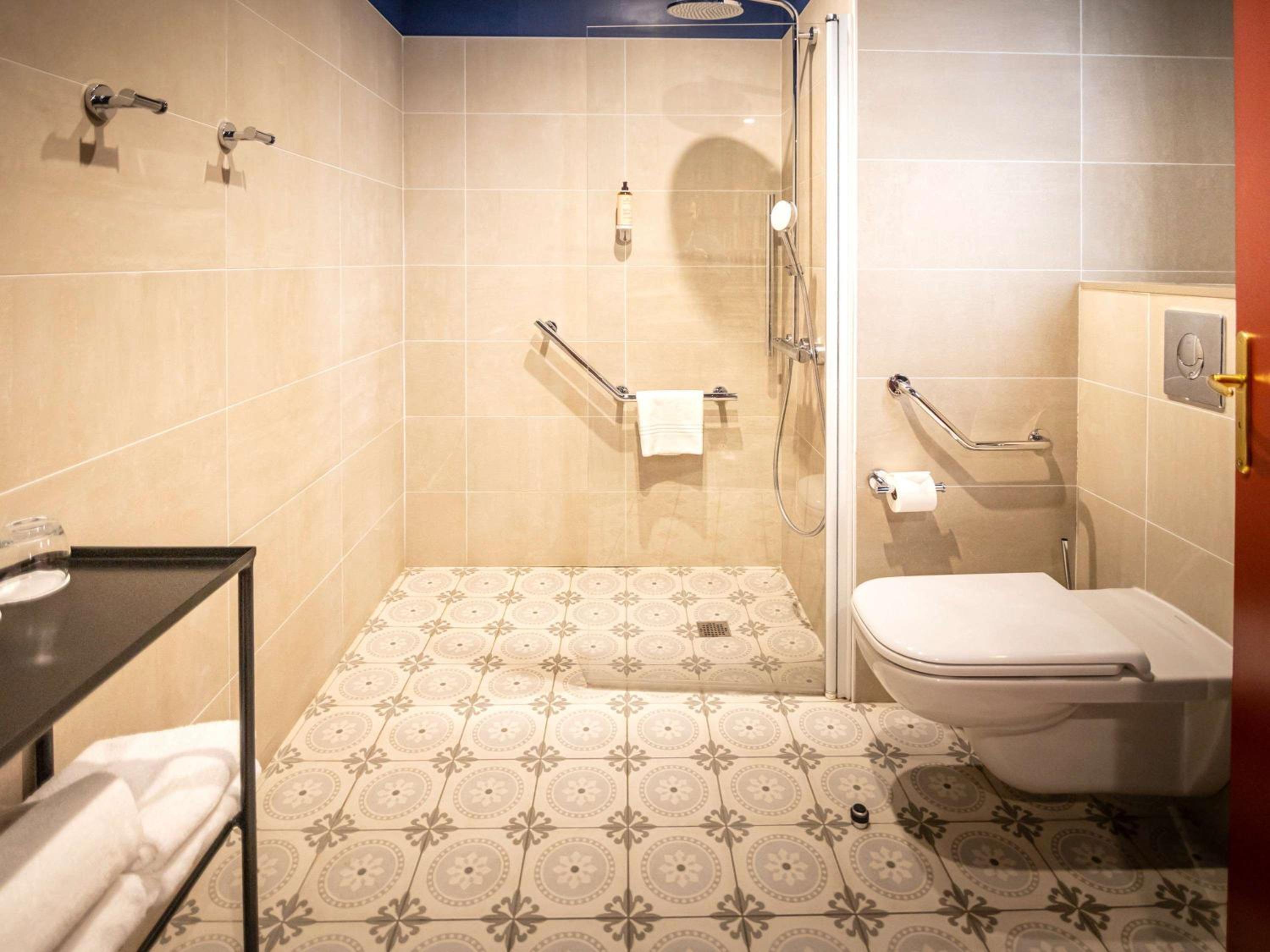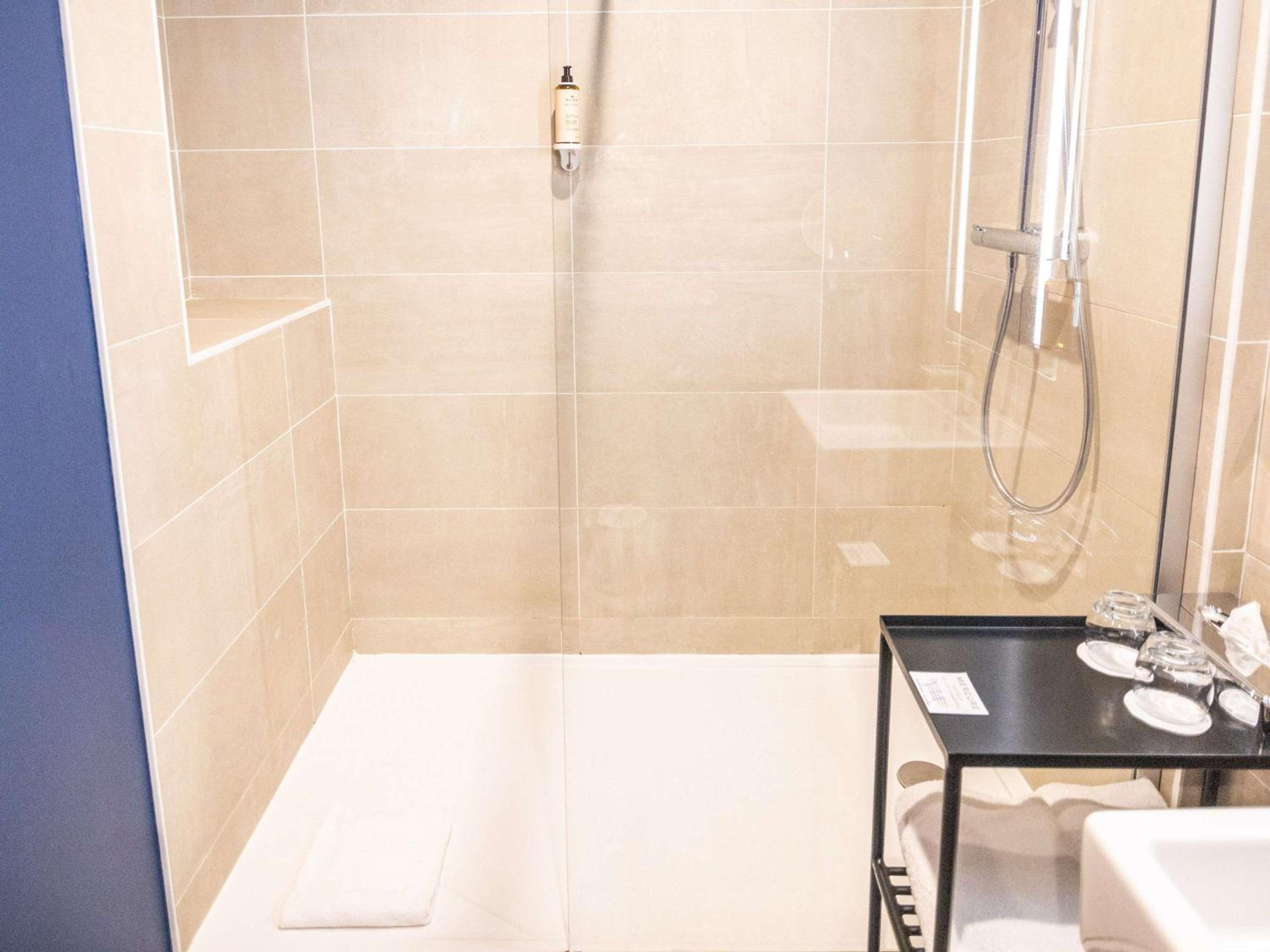 Accès à la douche reservé aux personnes jeunes et souples pour contourner la paroi vitrée.Il manque à minima une poignée pour sécuriser l’accès.