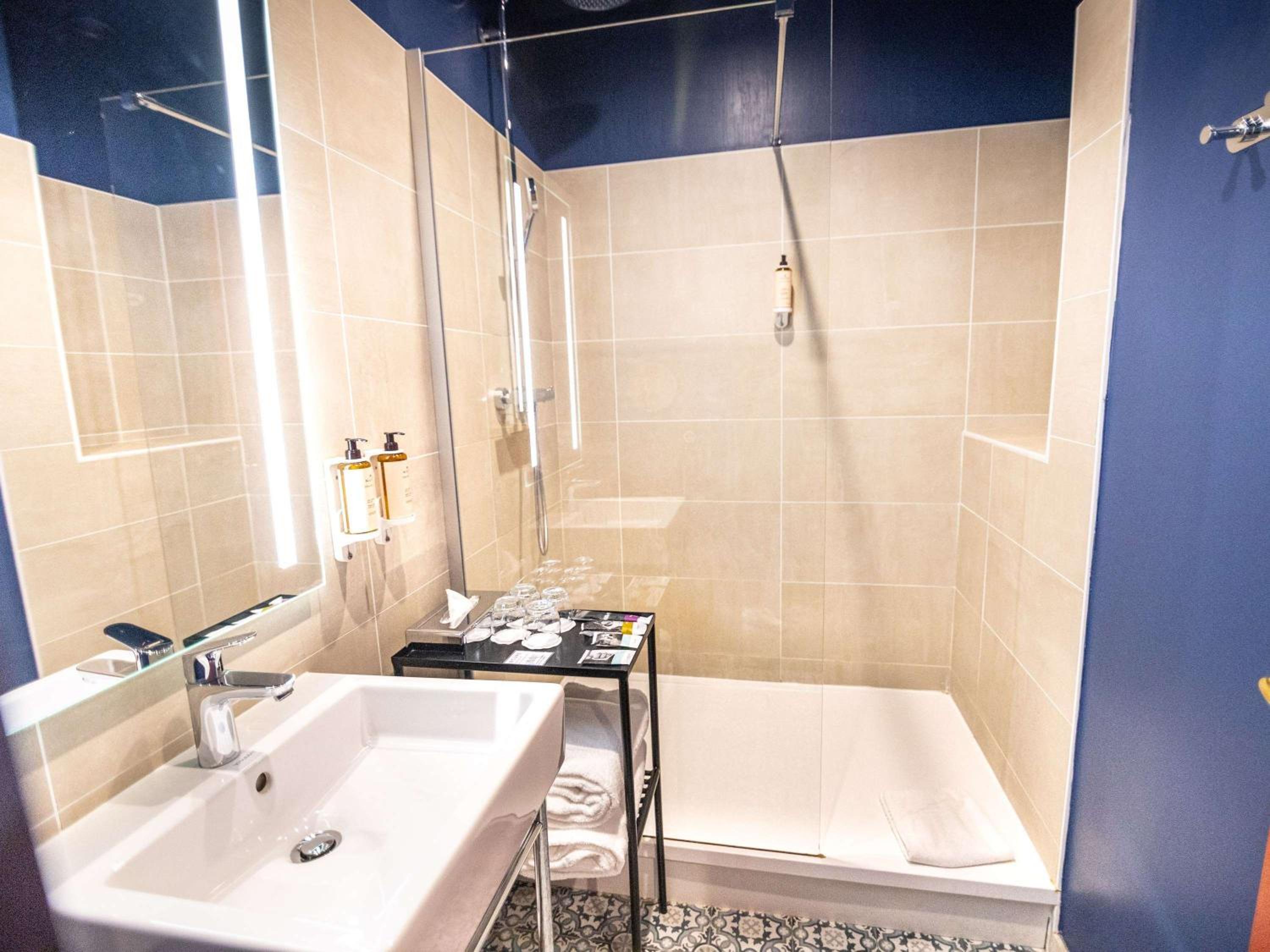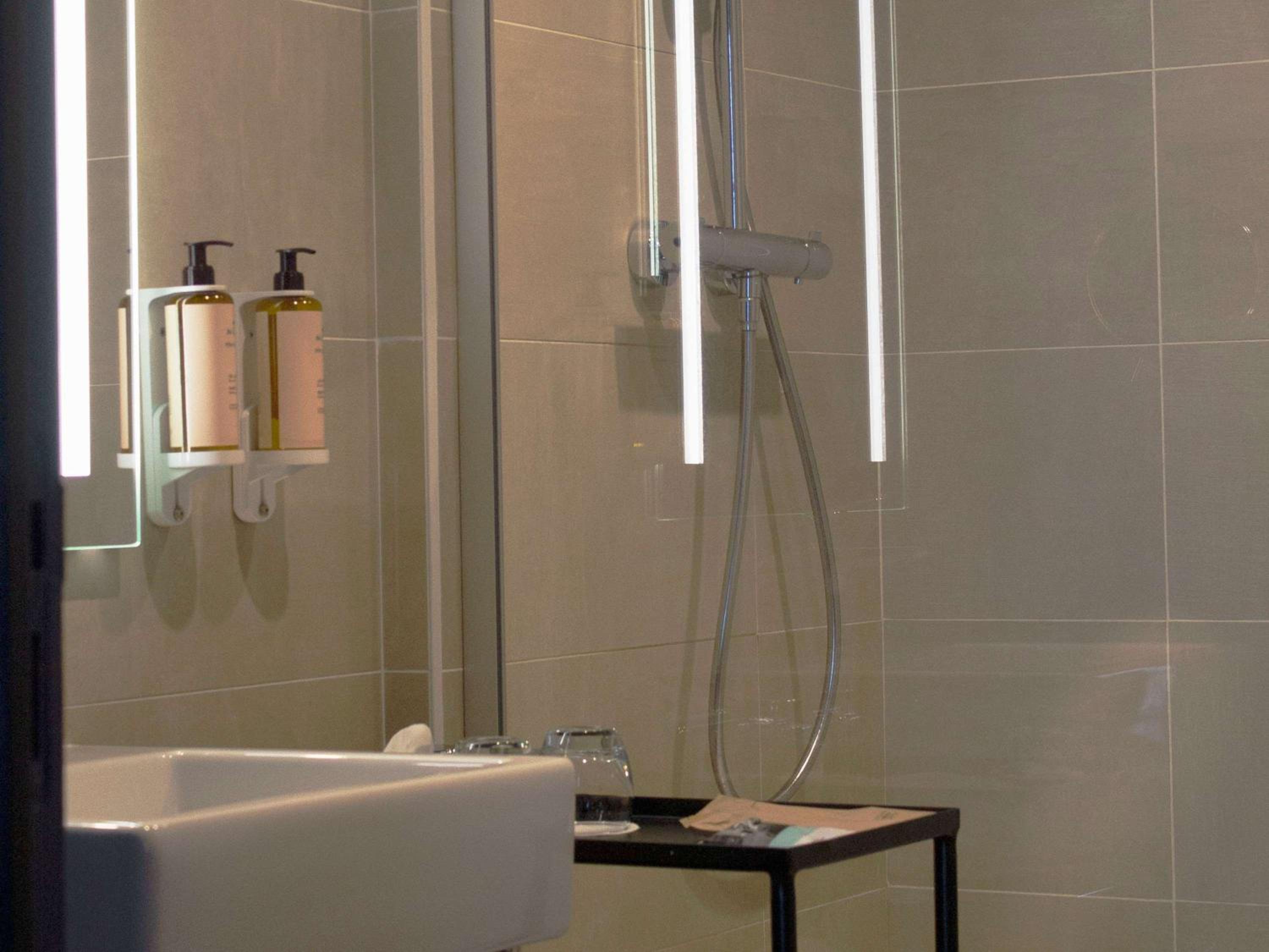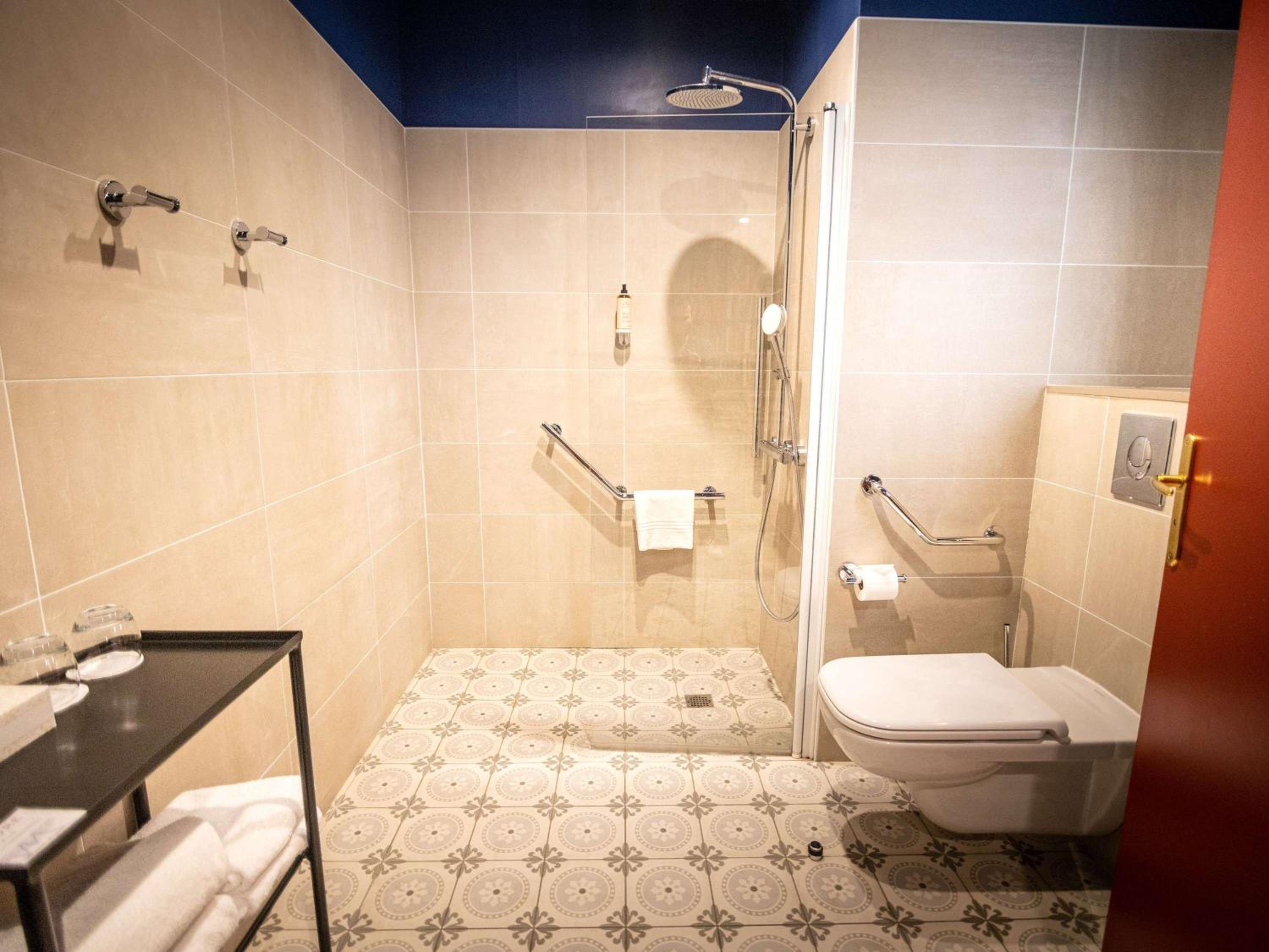 Accès à la douche reservé aux personnes jeunes et souples pour contourner la paroi vitrée.Il manque à minima une poignée pour sécuriser l’accès.
