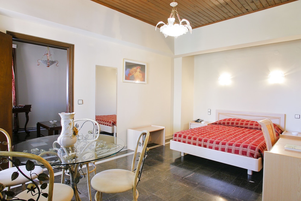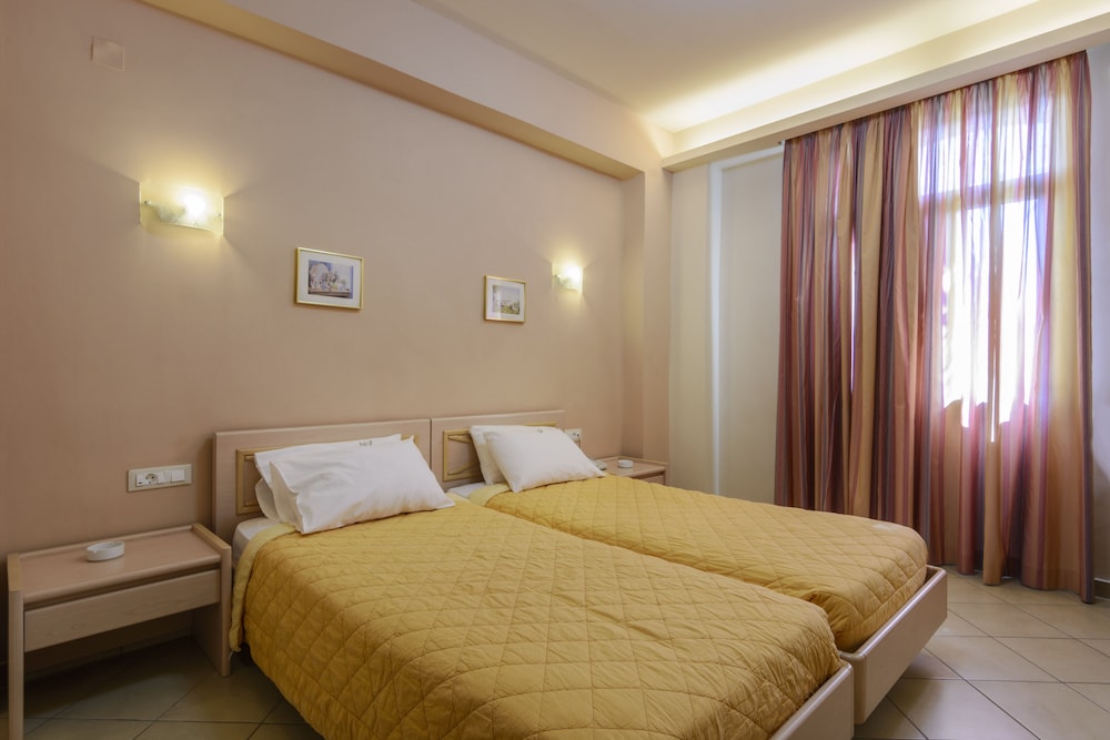 the hotel is located in a very nice and convenient place. The parking area is also very advantageous thing in the center. Hotel needs renew as it is old and outdated, but the location, settlement of the rooms, pool, restaurant is very good. I am sure after the renovation this place will be the one of the best in Chios. The hotel crew was super nice, thanks to all of them.