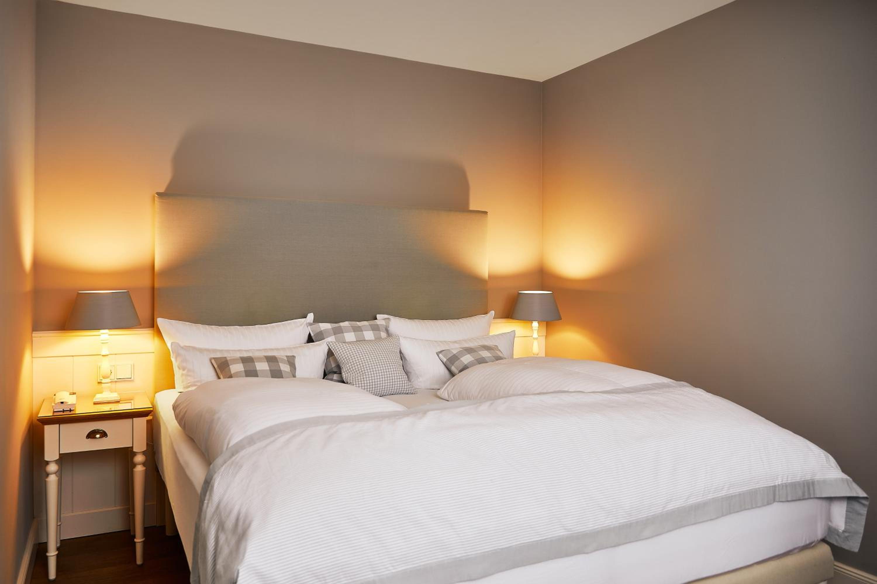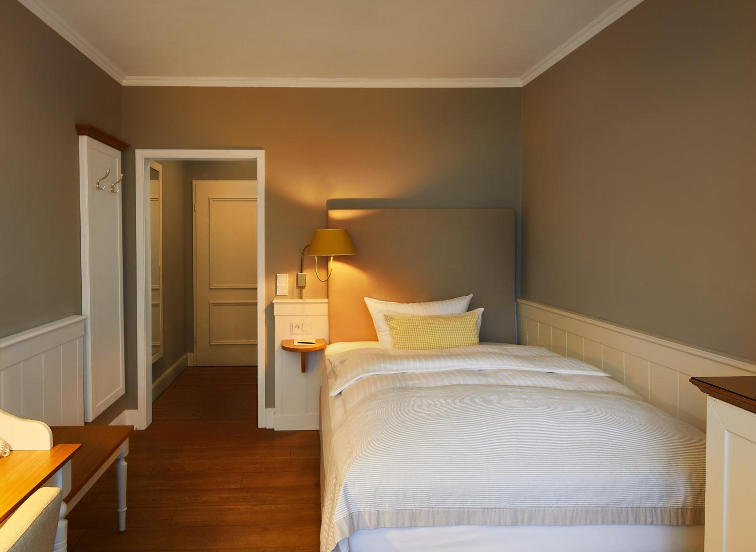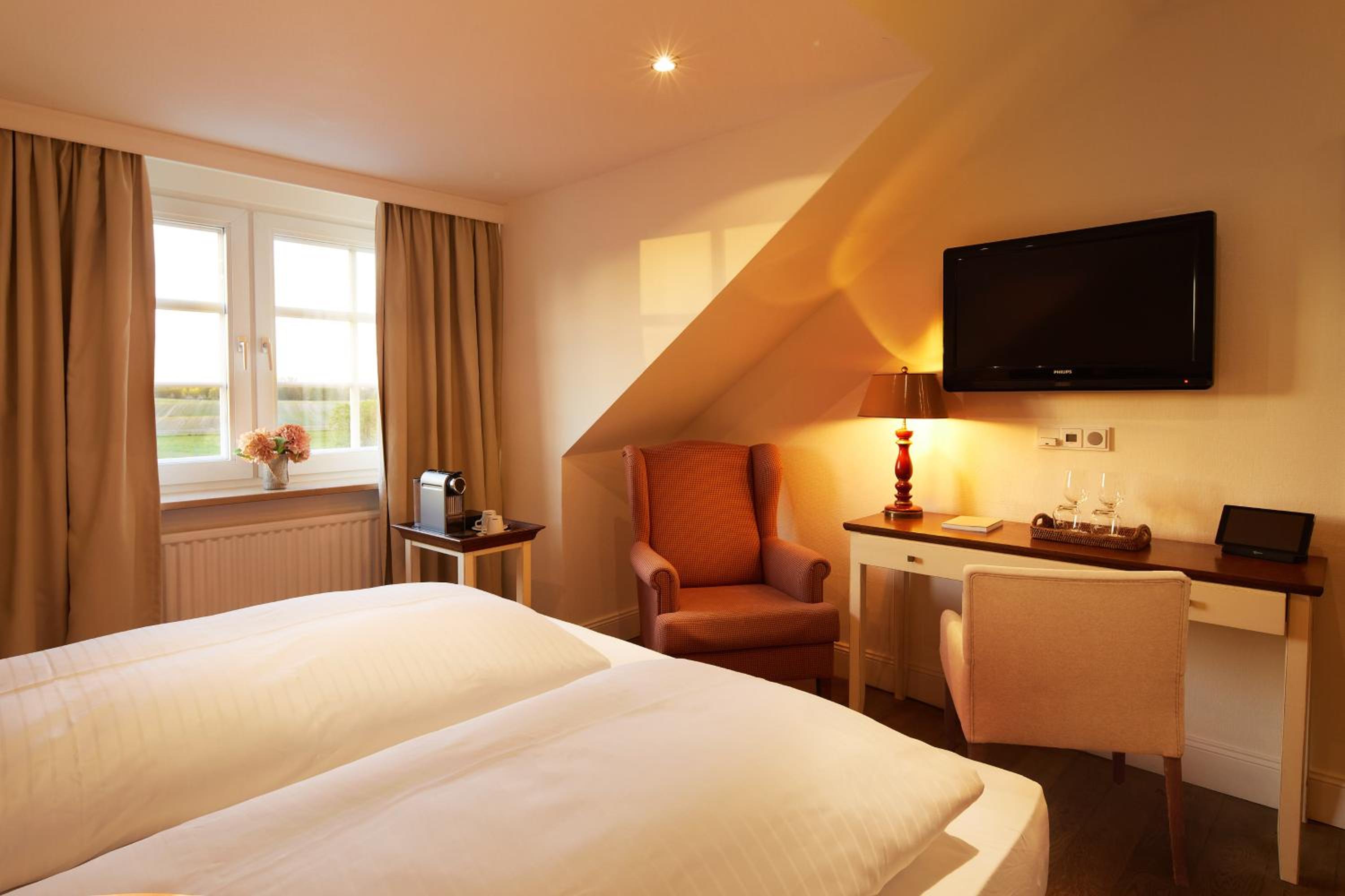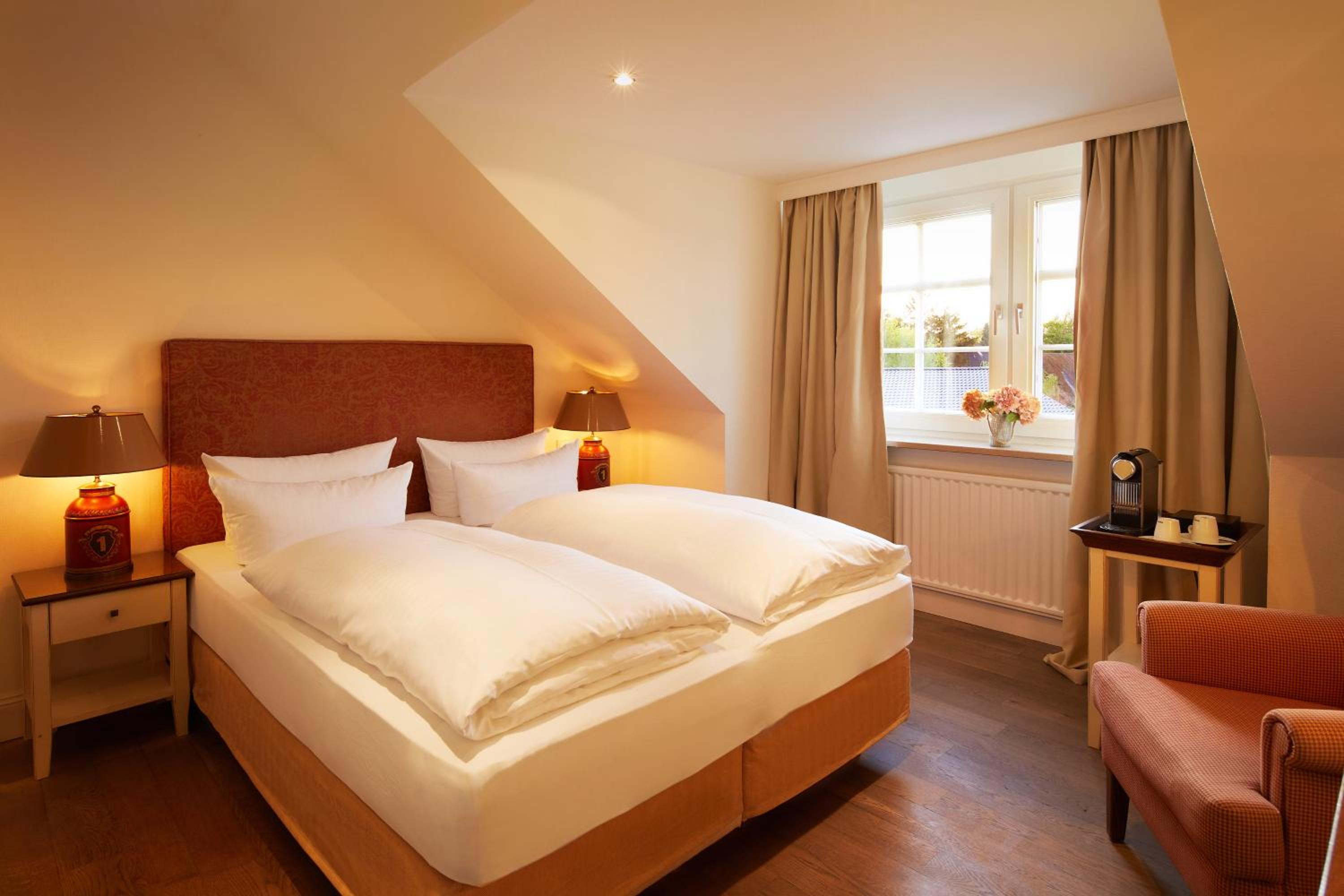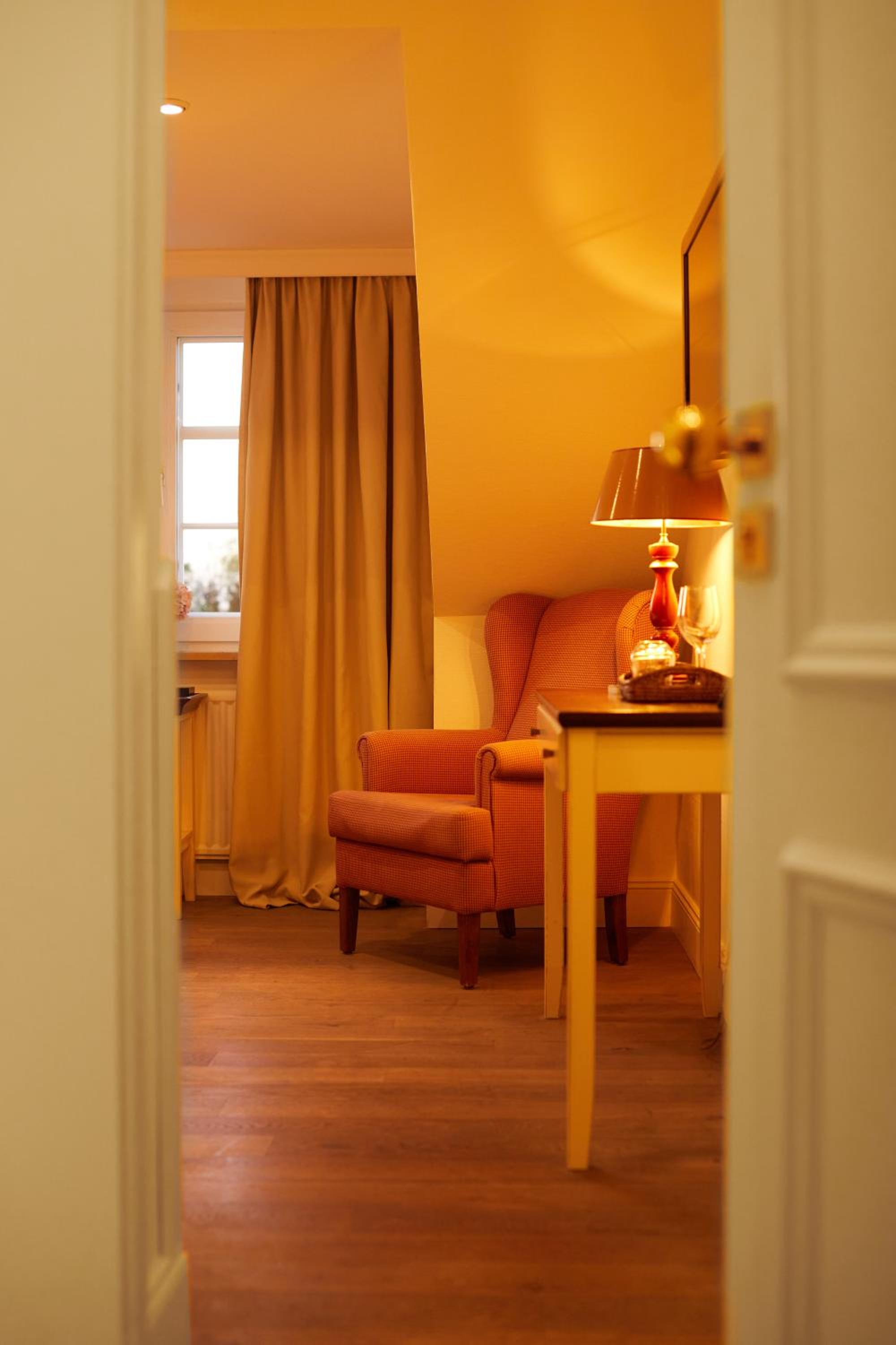 Das Hotel ist sehr gemütlich und geschmackvoll eingerichtet. Kleine Details machen alles sehr gemütlich. Wir waren im Haupthaus und hatten ein kleines Zimmer, was allerdings sehr stimmig eingerichtet war. Betten super bequem und verschiedene Kissen. Kaffeemaschine im Zimmer.