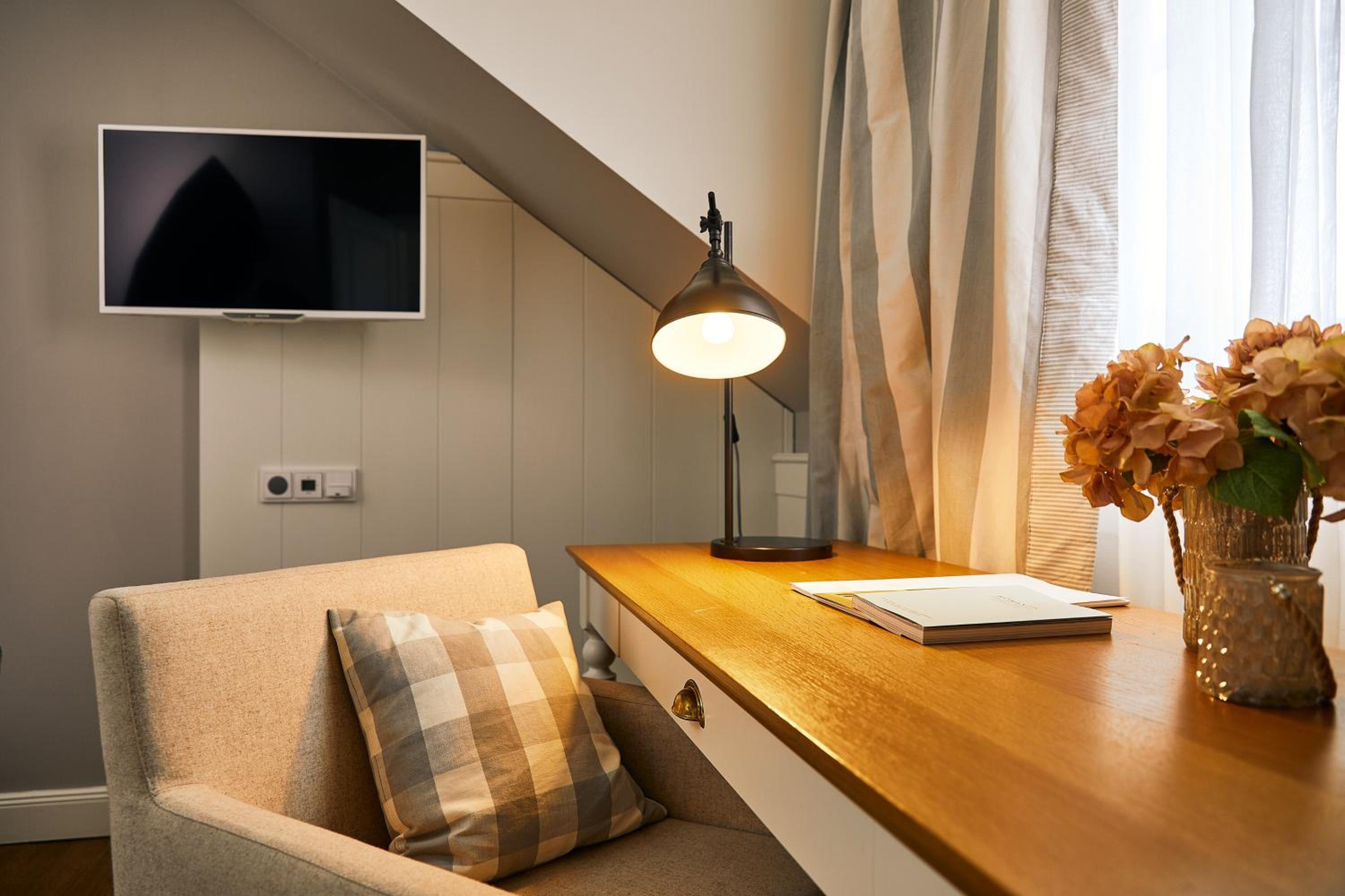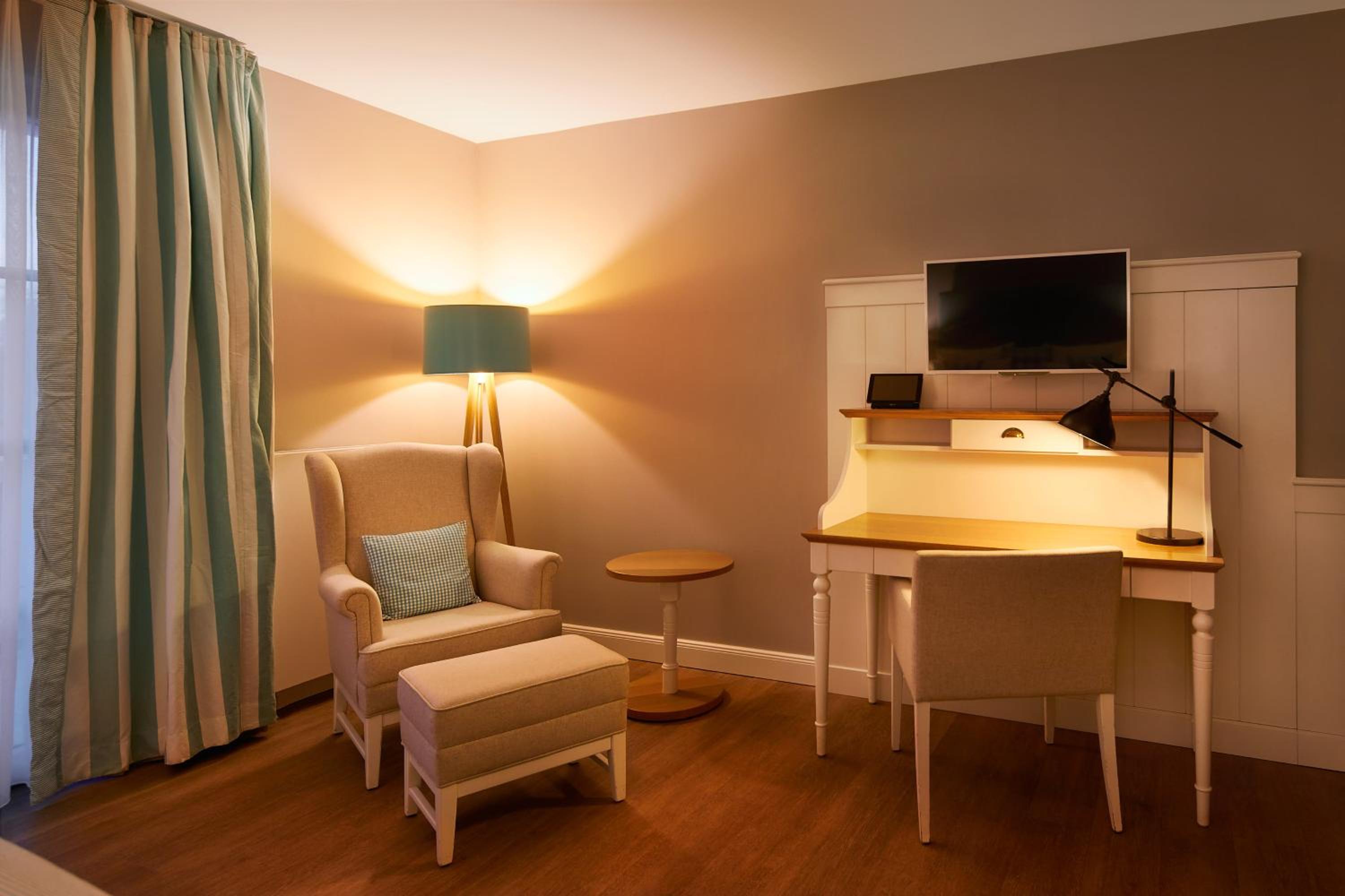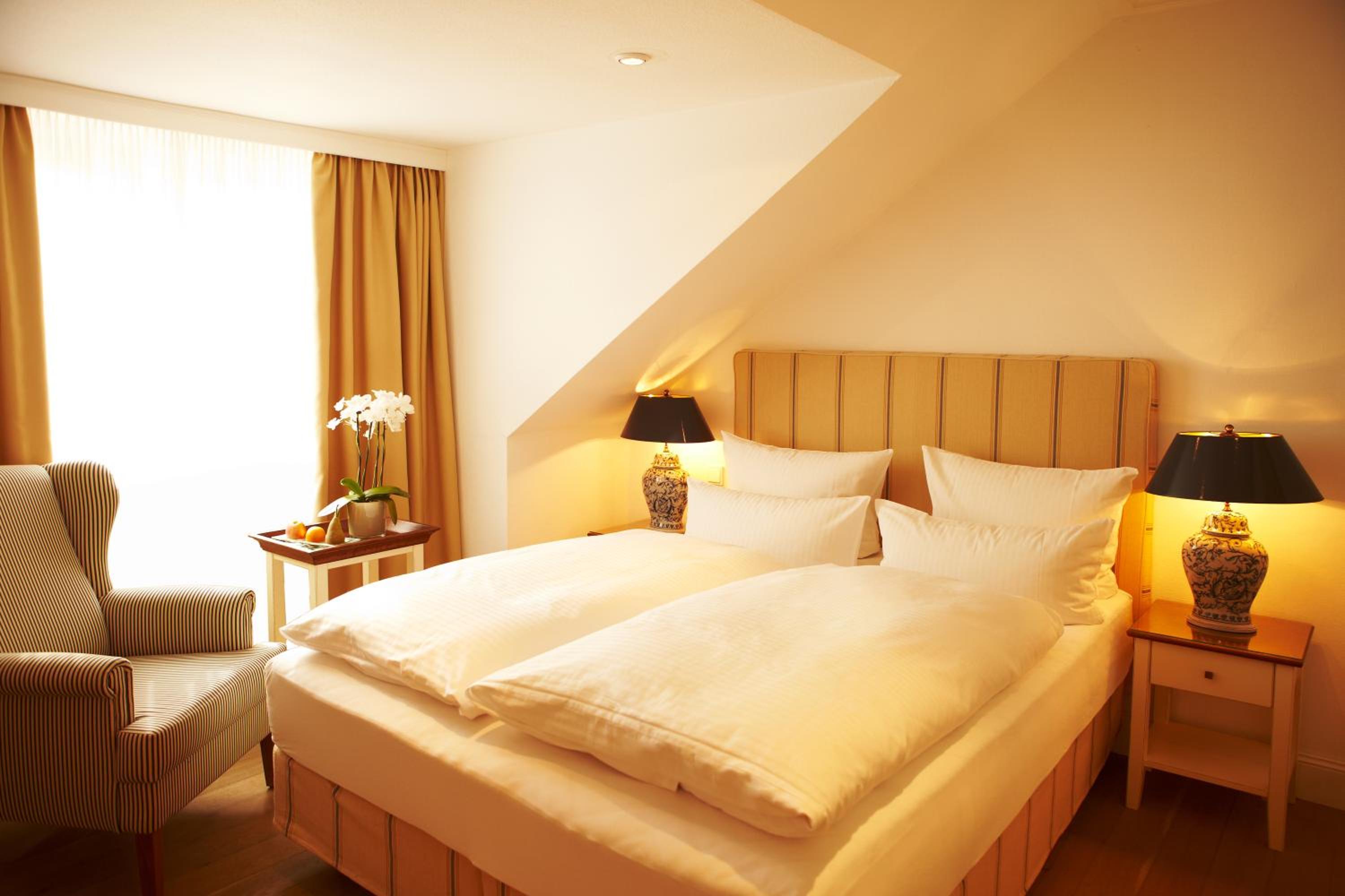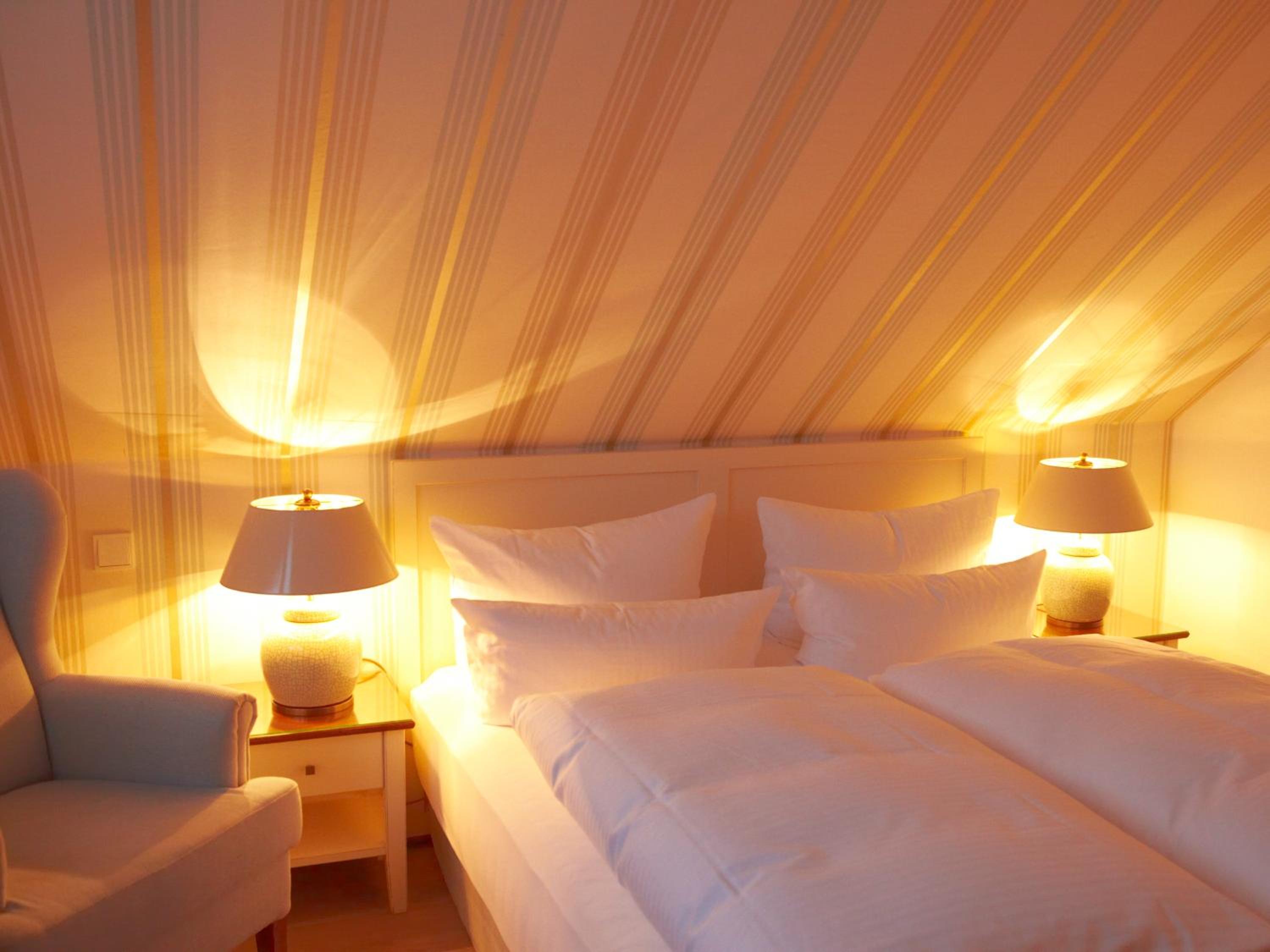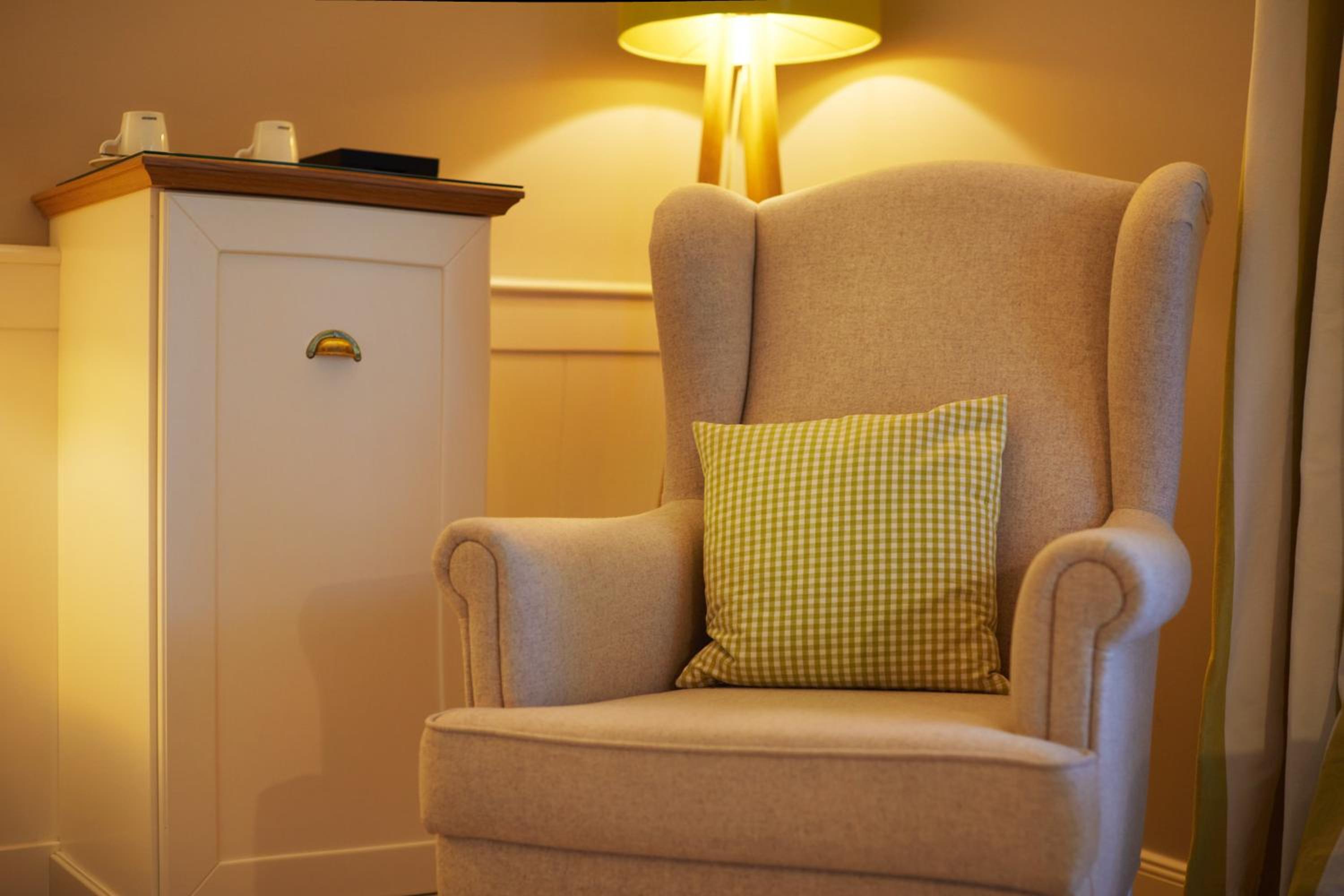 Das Hotel ist sehr gemütlich und geschmackvoll eingerichtet. Kleine Details machen alles sehr gemütlich. Wir waren im Haupthaus und hatten ein kleines Zimmer, was allerdings sehr stimmig eingerichtet war. Betten super bequem und verschiedene Kissen. Kaffeemaschine im Zimmer.