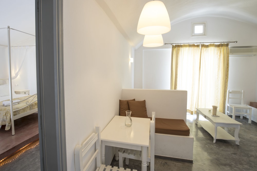 The location of the hotel is excellent, it is right on the shore with its own beach in front of the hotel. The staff is English speaking, friendly and very helpful. The bus stop for the bus to the capital of Santorini, Fira is within a 3 min walk, and next door to the hotel is a tourist shop with some food, ice cream, and souvenirs. The bigger shop is across the bus stop. The hotel room is spacious and quiet, with a balcony, and has all the regular amenities like Wi-Fi, AC, and a fridge. We were there a the end of September and the weather was perfect for the beach and swimming. One windy day out of ten days in Santorini that happened during our stay we spent on visiting Fira on the bus. The ride goes every hour and takes about 40 min from the bus stop to the center of Fira. It is a perfect location for the hotel, we have very good memories of visiting Santorini.