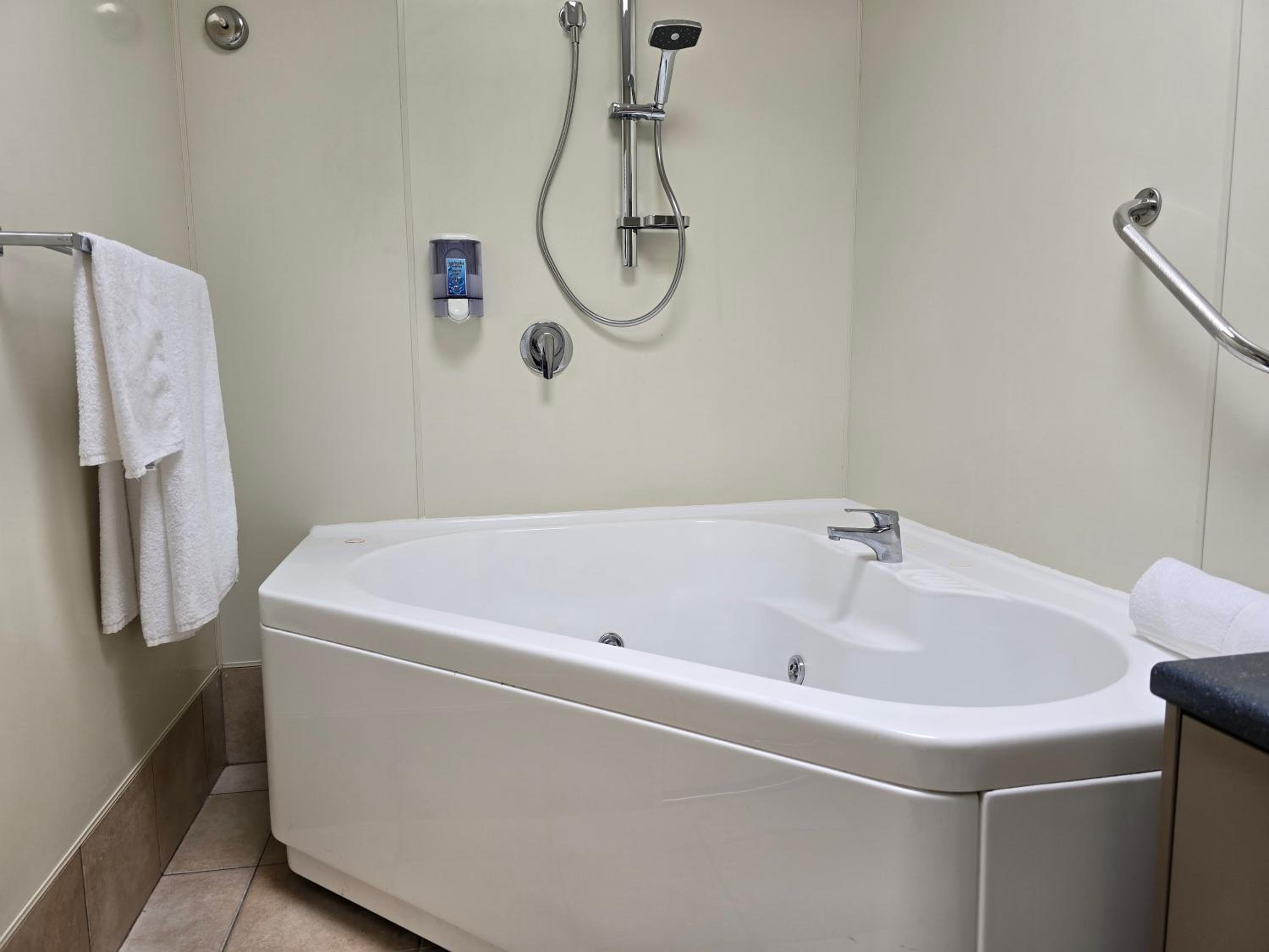 Spa bath upstairs so we could use any time without bothering other guests. Lovely and spacious. Great to have 2 little side tables and a coffee table. Staff happy and care about your stay.