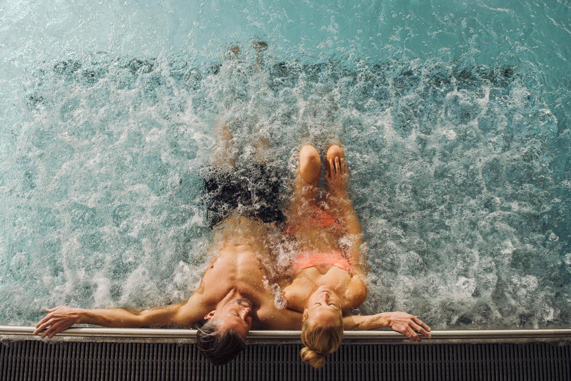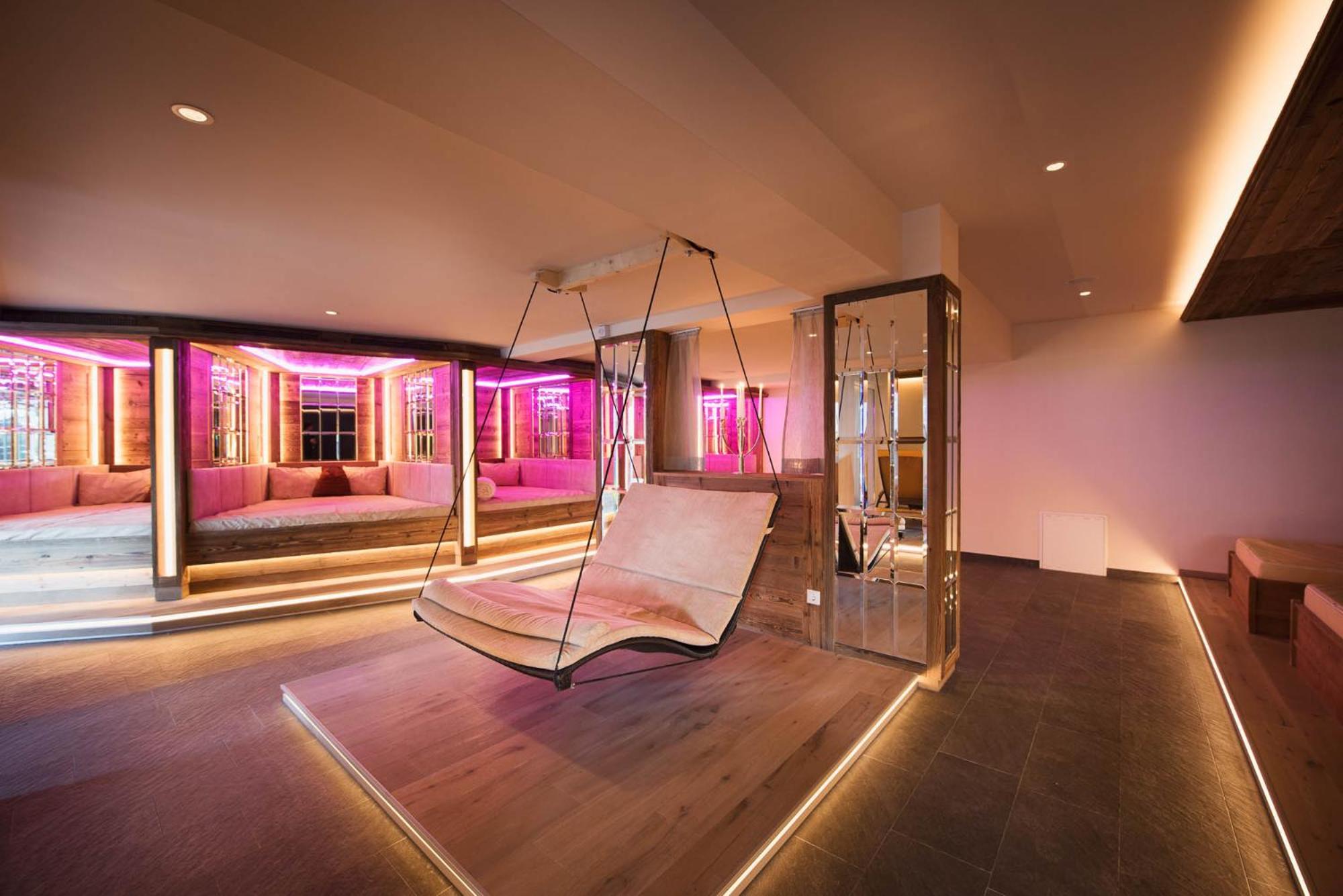 The Activehotel Bergkönig boasts a lavish 2000 m² spa area, featuring an indoor pool, panoramic bio sauna, Turkish steam bath, water beds relaxation room, Finnish sauna, and Kneipp fountain. Additionally, guests can enjoy an outdoor infinity brine bath with stunning views of the Stubai Glacier, a sauna garden, various showers, and a cozy fireplace lounge.
