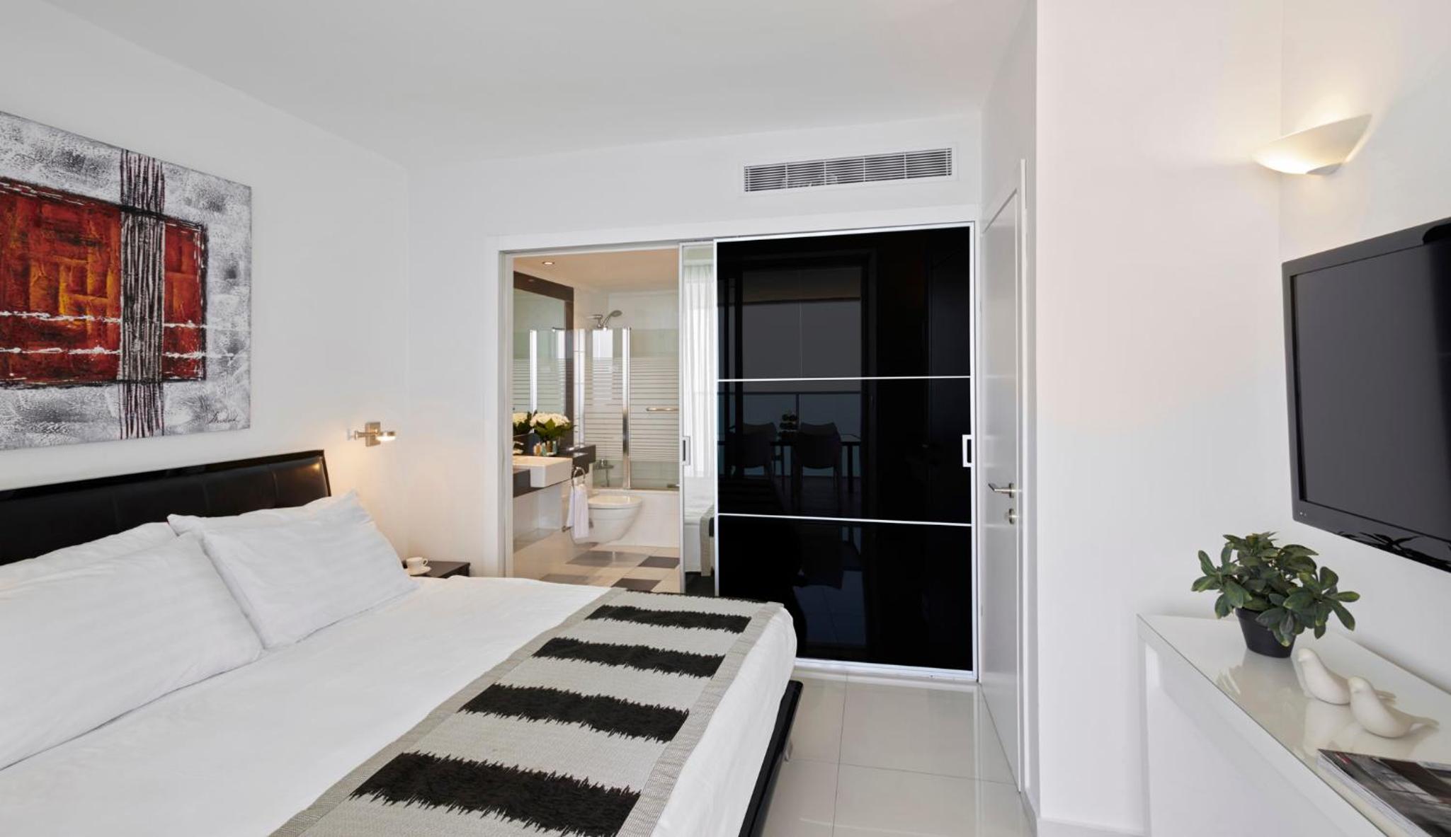 Experience the ultimate luxury in our extra-large suites with a kitchenette and 2 flat-screen TVs. Enjoy the breathtaking panoramic views of the Mediterranean Sea from your large balcony.