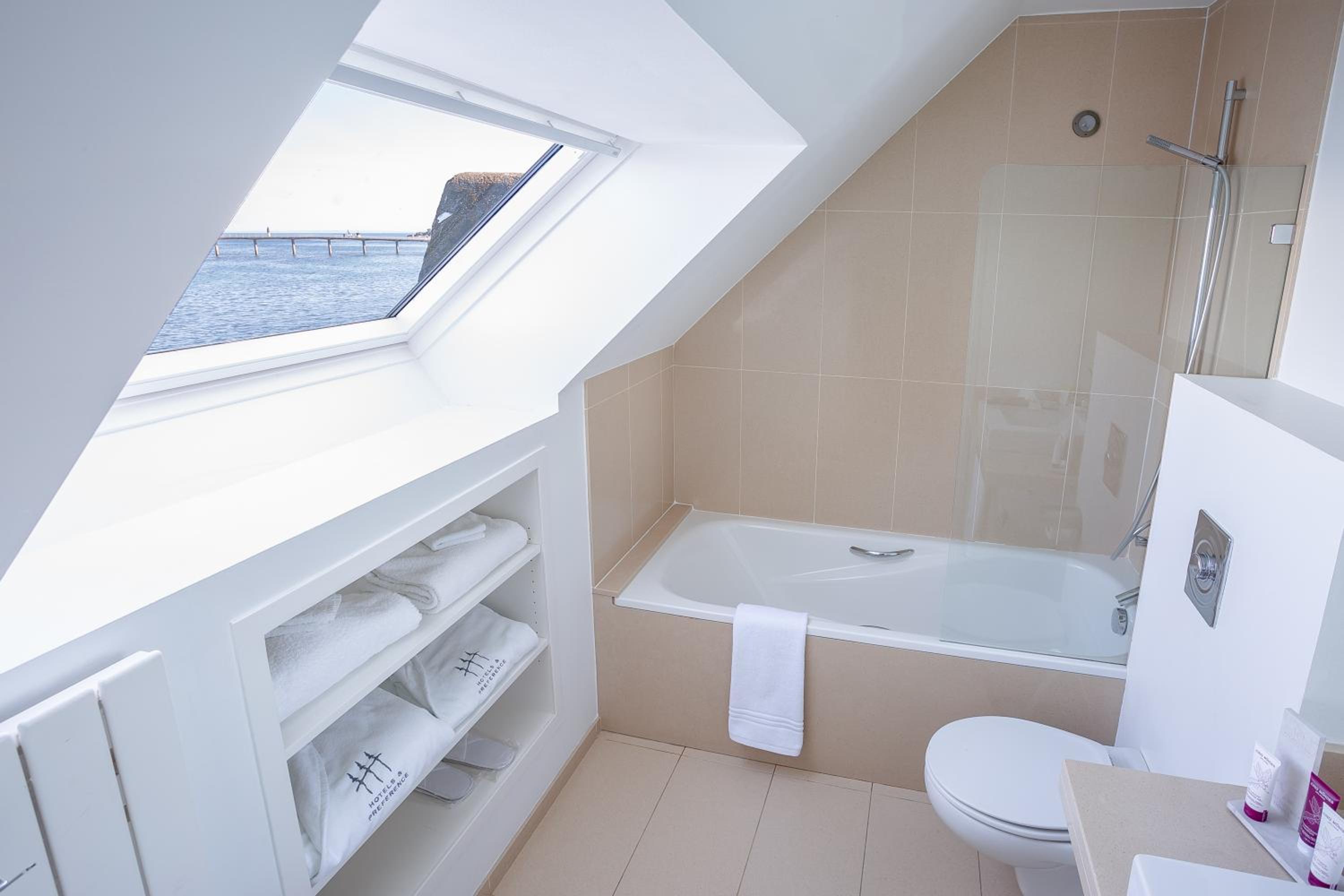 The hotel itself is a beautiful old granite mansion from downtown, stuck between the historical center and the sea. Our bedroom overlooks the high and low tides, rocked by the waves and wind sound. It is extremely clean and we have ample amount of towels and robes…