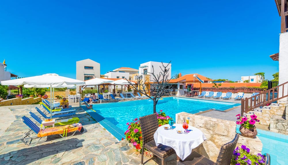 Spacious rooms for the whole family, nice pool, walking distance to beach. Nice to have a kitchenette to prepare breakfast. Busses to Platanias for lots of restaurants.