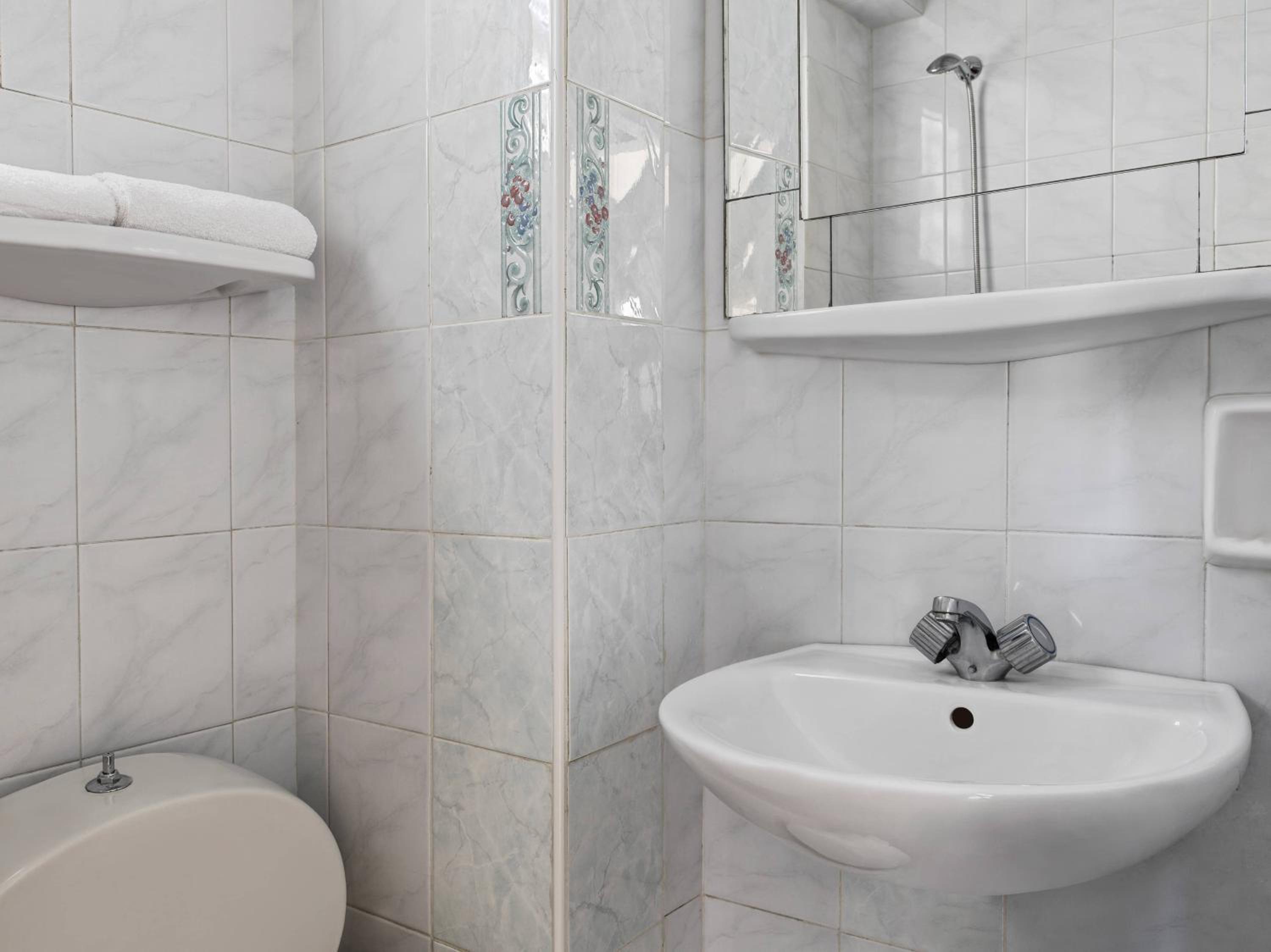 La habitación es pequeña, muy anticuada y el baño es diminuto, siendo casi imposible bañarse sin mojar todo.
