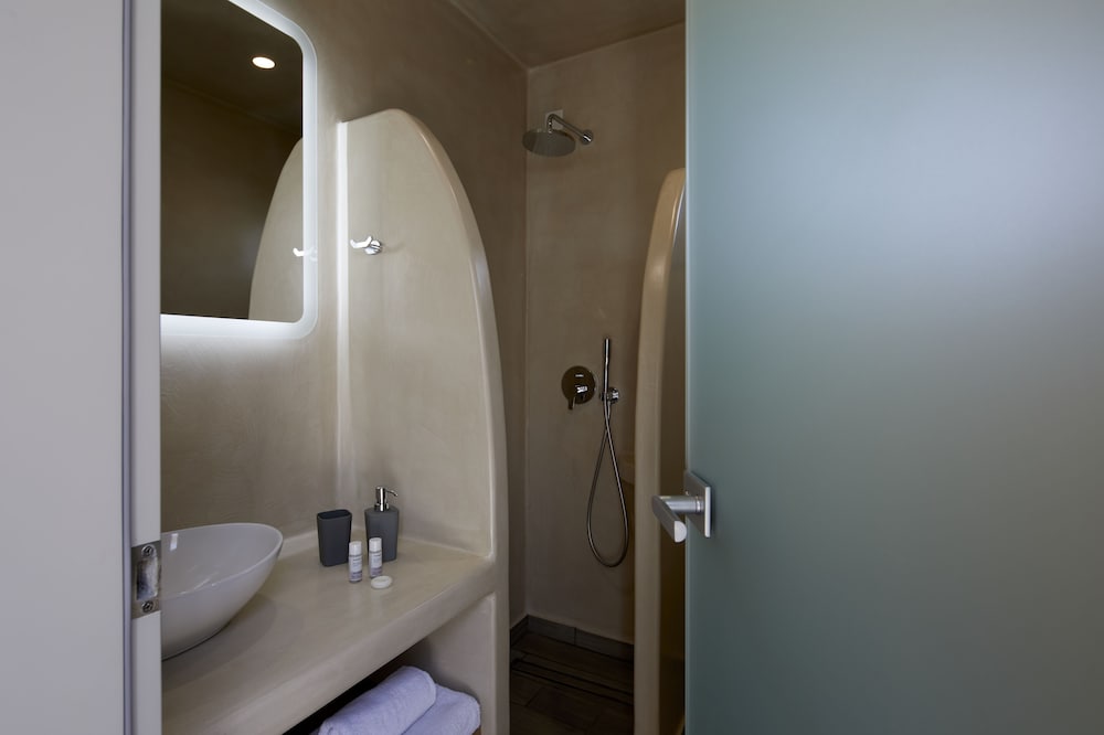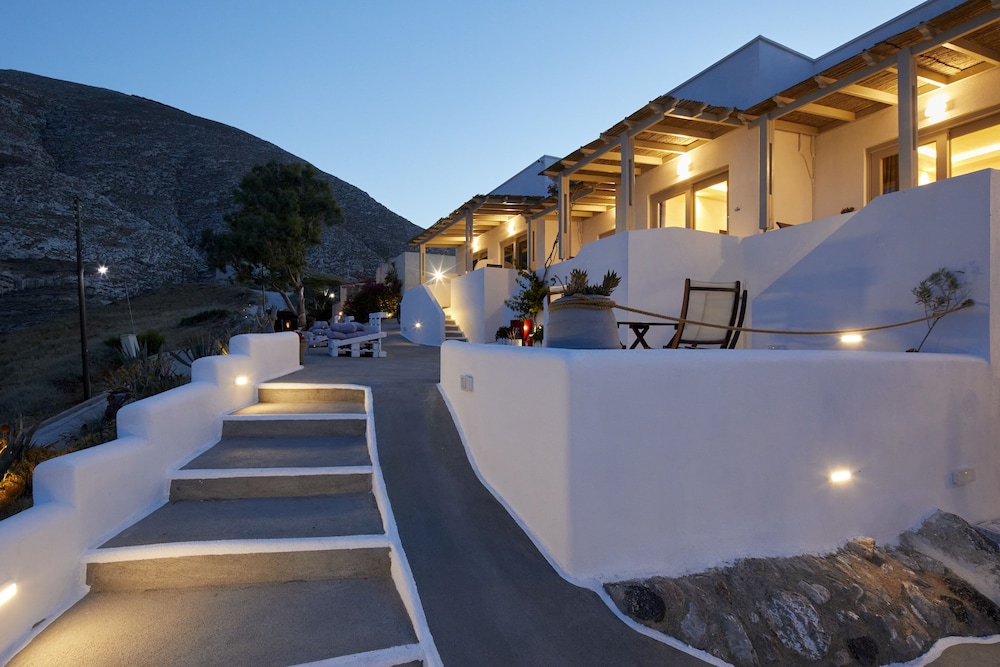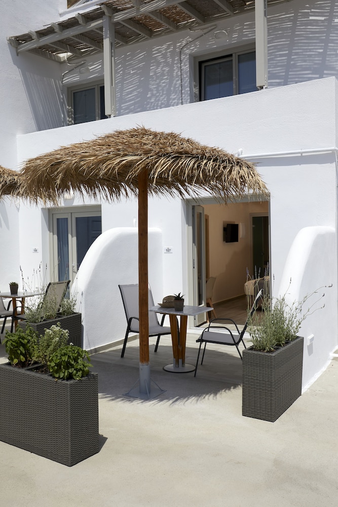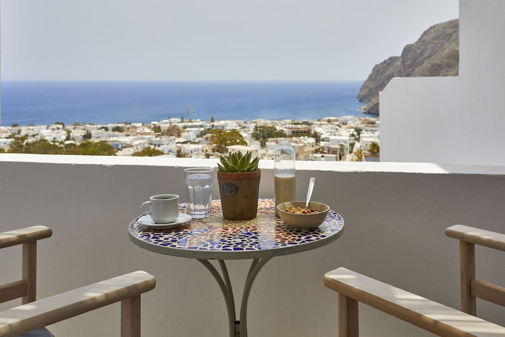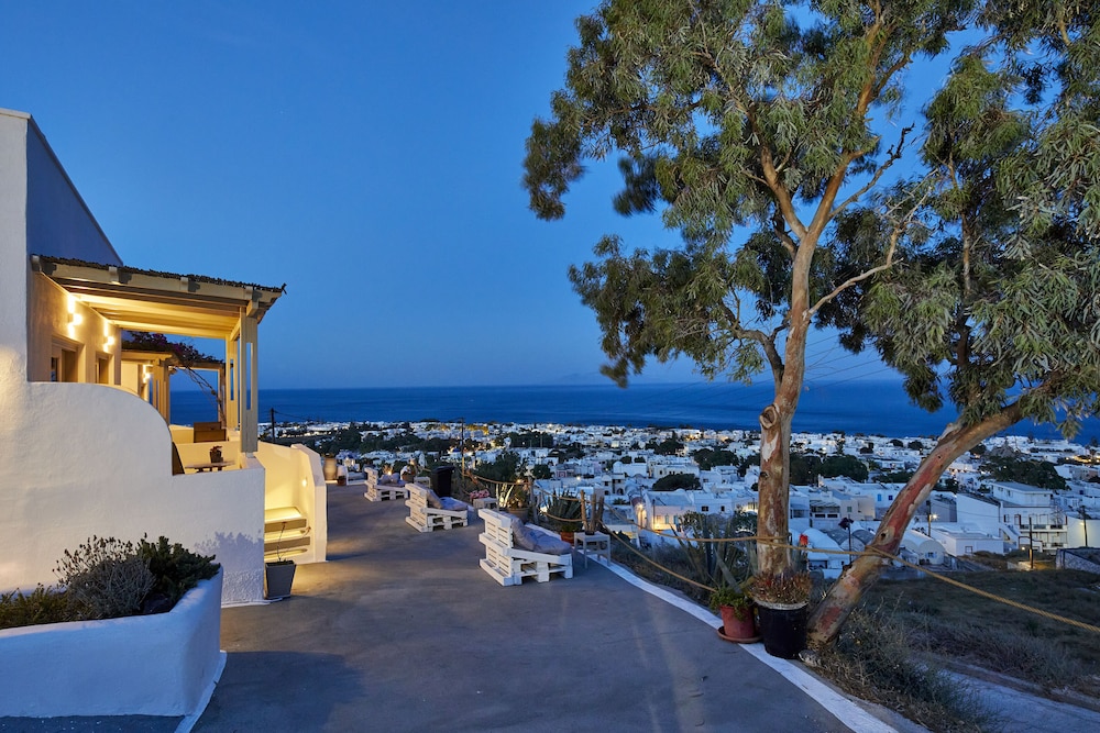 On the hill above town lies this great place. You really get a welcoming feeling as soon as you step inside. The owner Stamatis was very helpful with everything from booking ATV’s, taxi and excursions. Also gave us full info about the island and where to go. Such a great experience. About a 10 minute walk down to the beach and Kamari town. If you want a hotel with great view and a great family feeling, this is where to go!