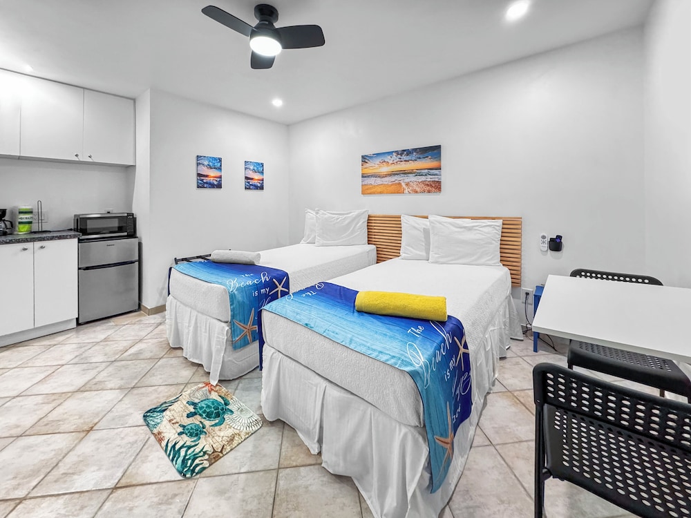 Reserved a double twin but ended up in the queen apartment with adjoining queen room. Fantastic location! Bed was comfy. We had extra bed linens, plenty of towels and wash rags, full sized fridge, microwave and a stove, plates, bowls, glasses, and flatware. We even had 2 beach chairs to use. On the downside the A/C was very loud but not loud enough to drown out my neighbors conversations - they weren’t being loud, the walls are just incredibly thin.